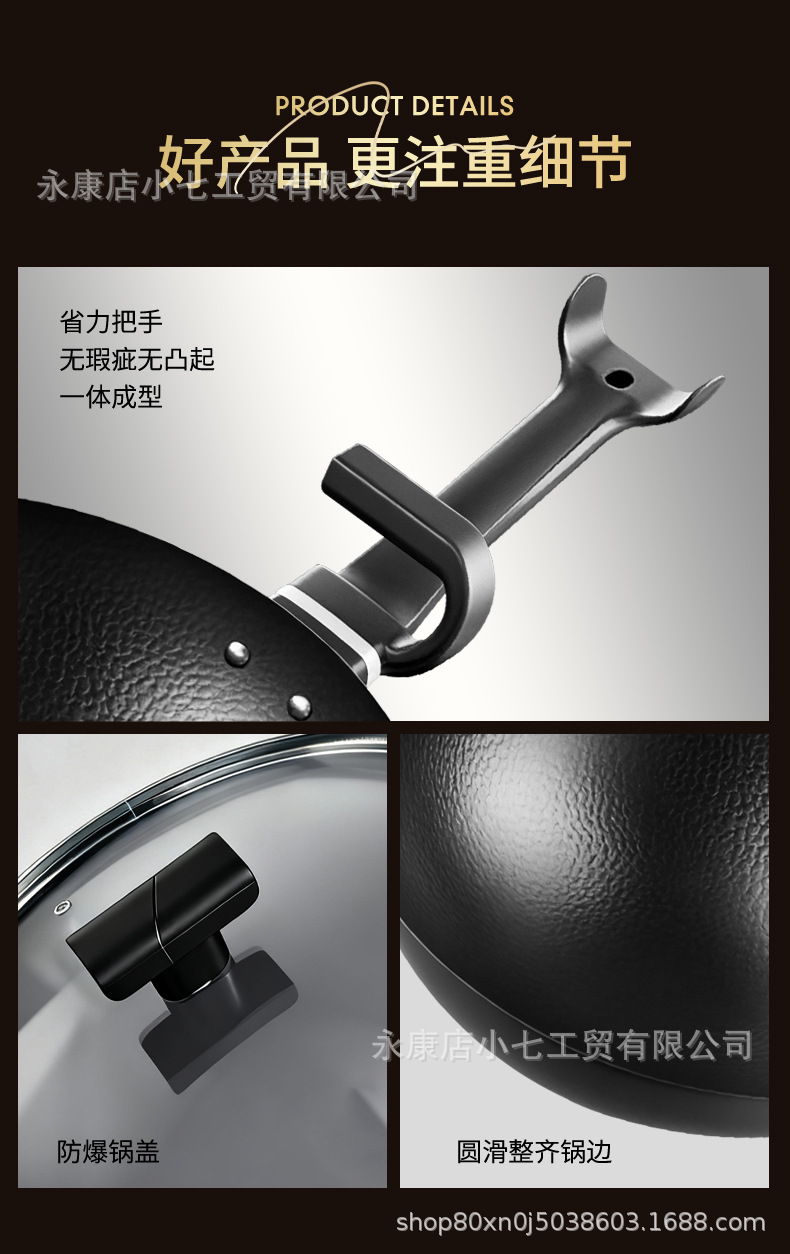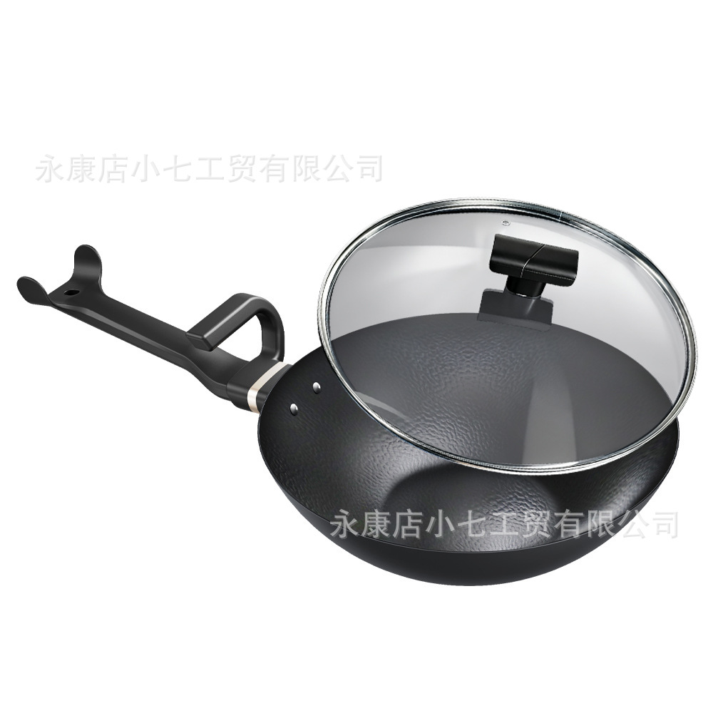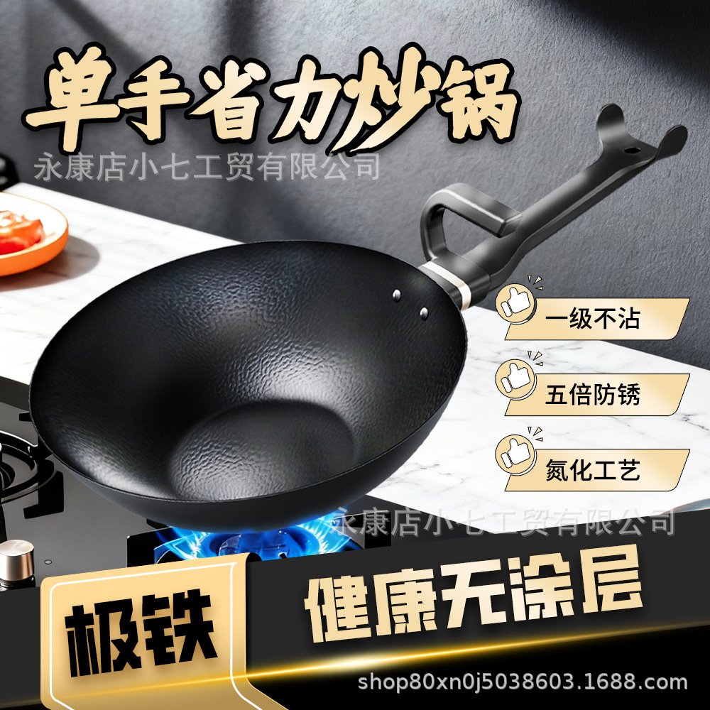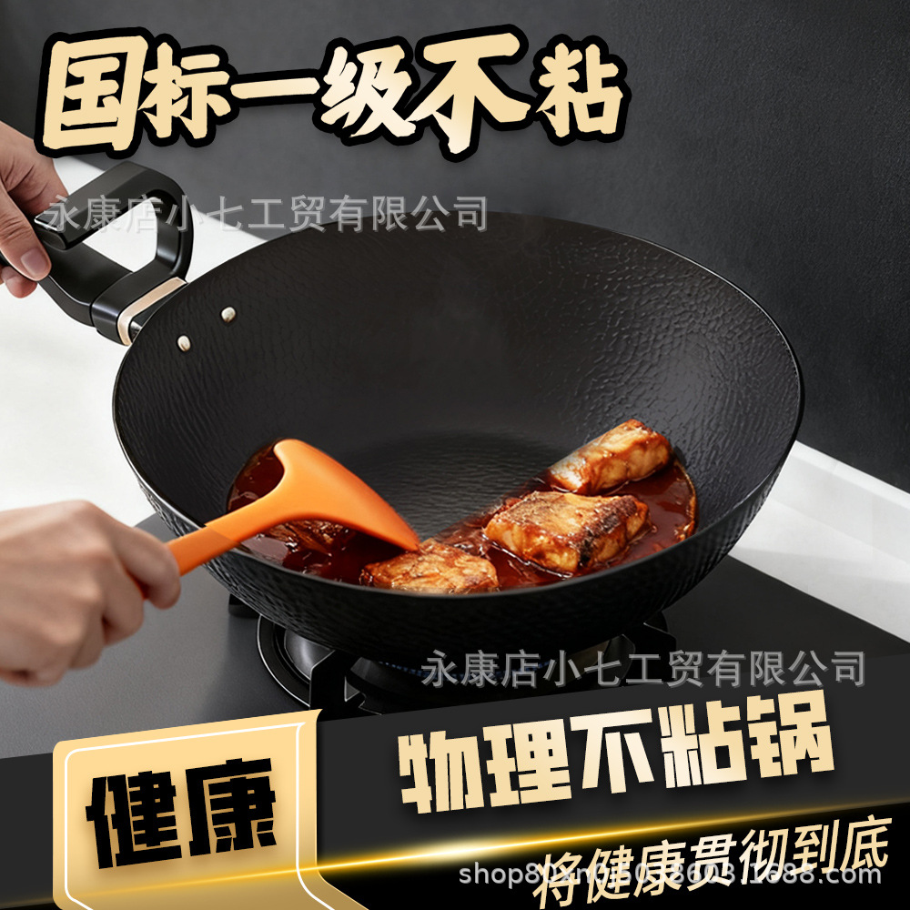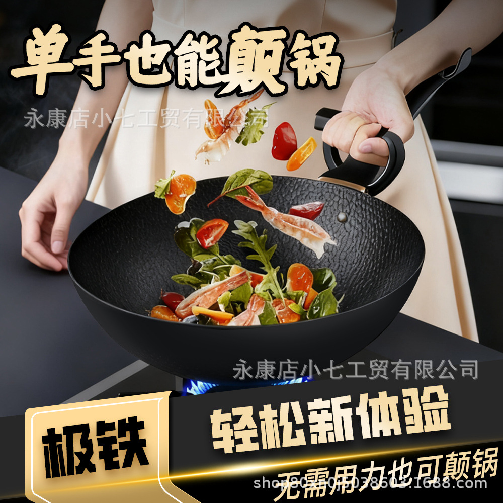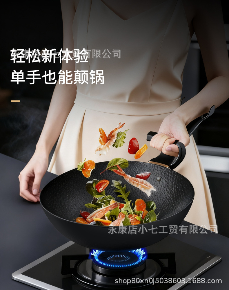 跨境专供批发极铁锤纹平底省力炒锅无涂层无油烟家用炒菜锅不粘锅