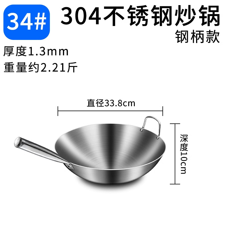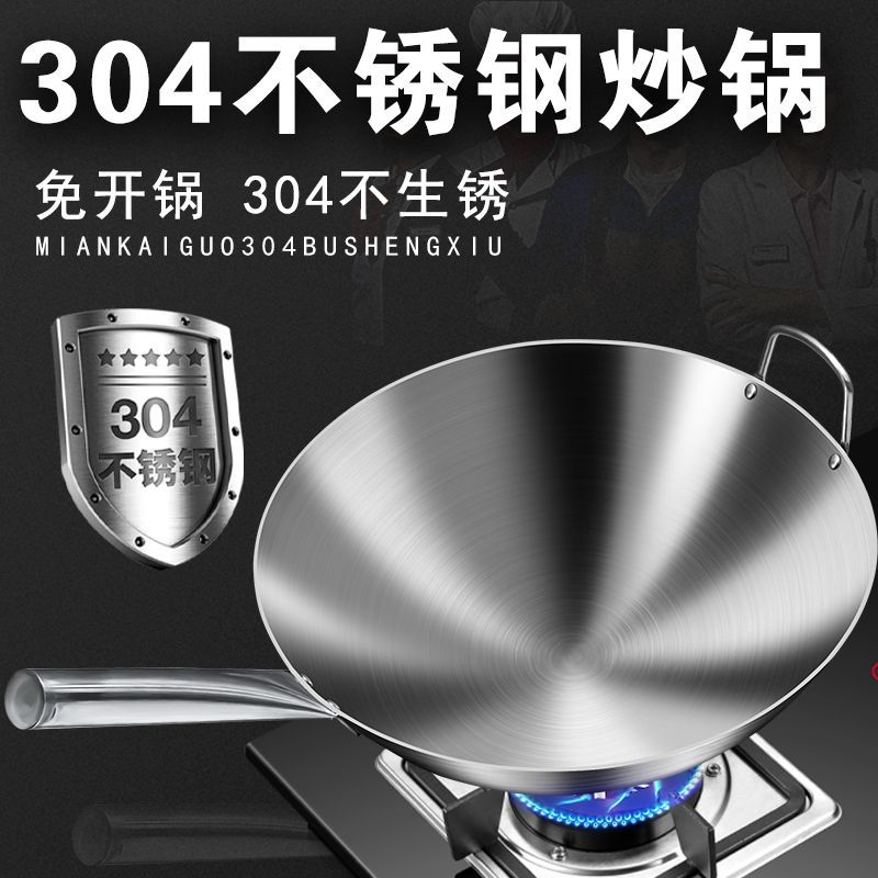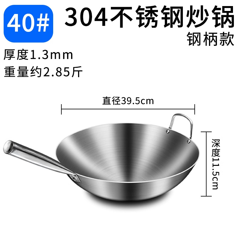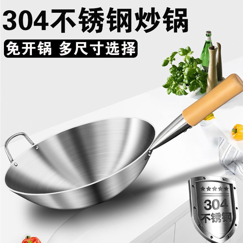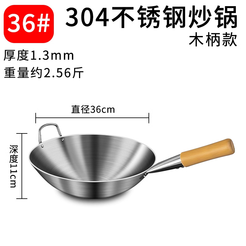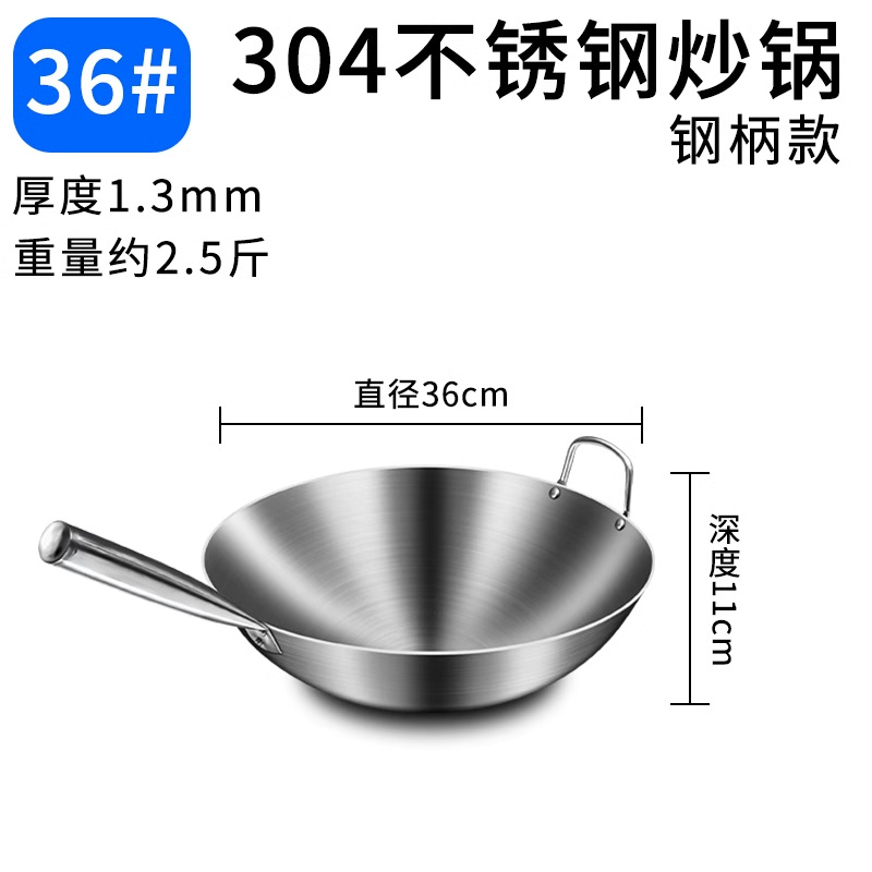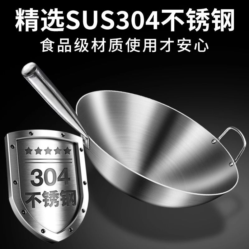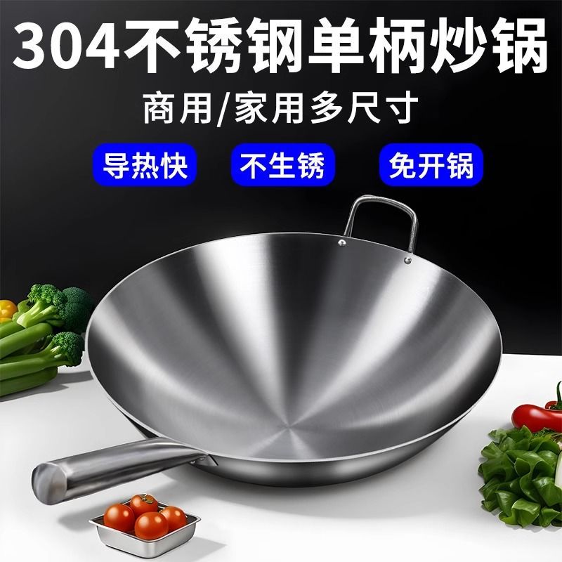 加厚纯304不锈钢单柄炒锅食品级饭店商用家用炒菜锅圆底无涂层