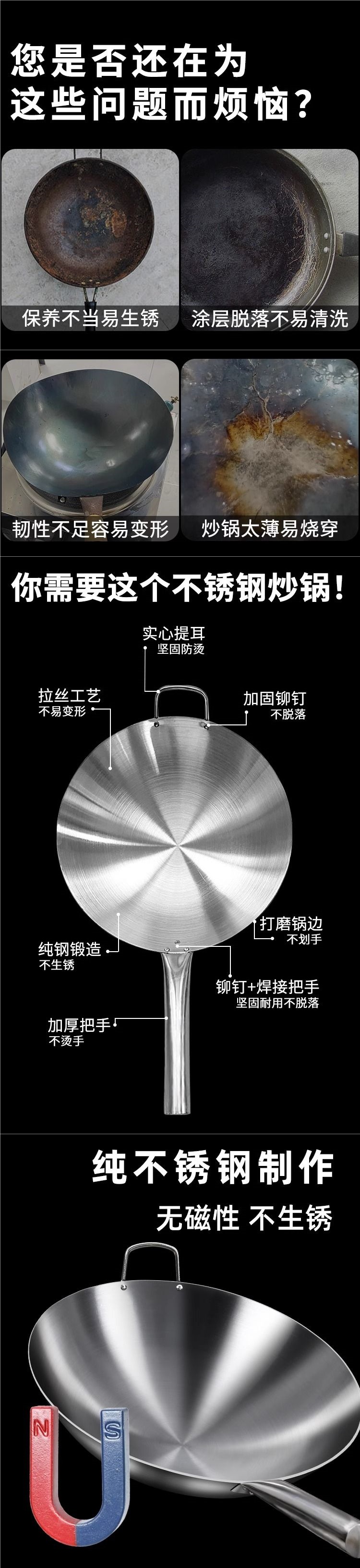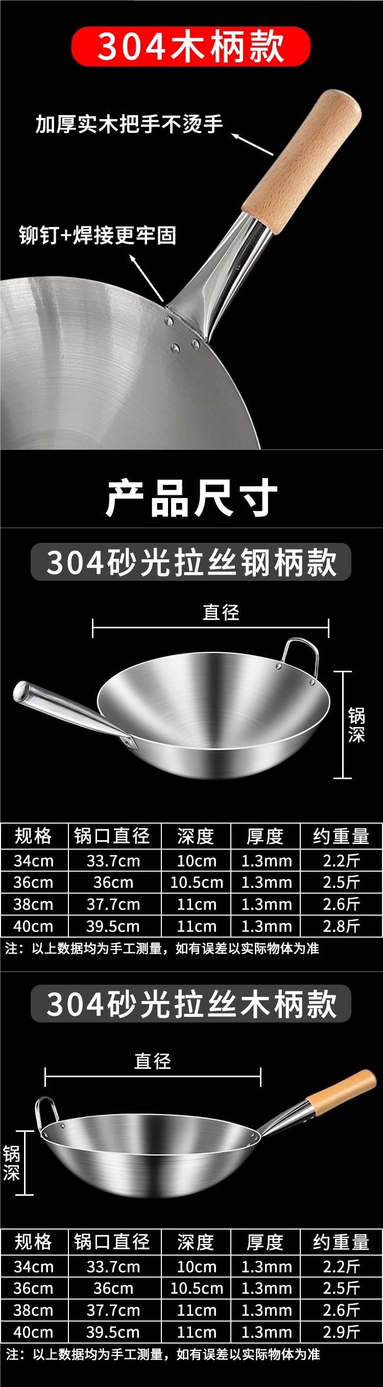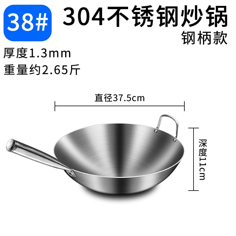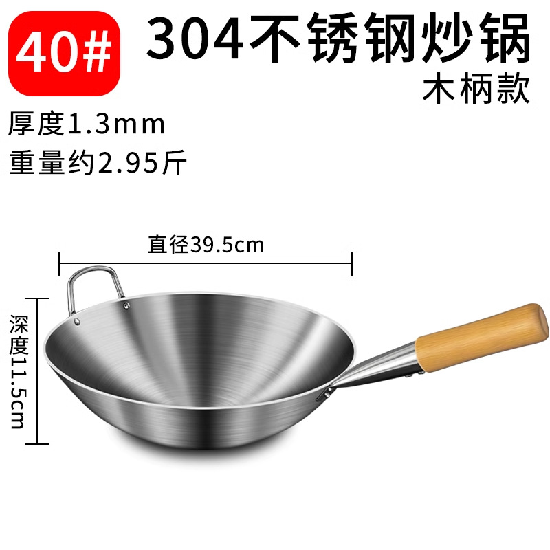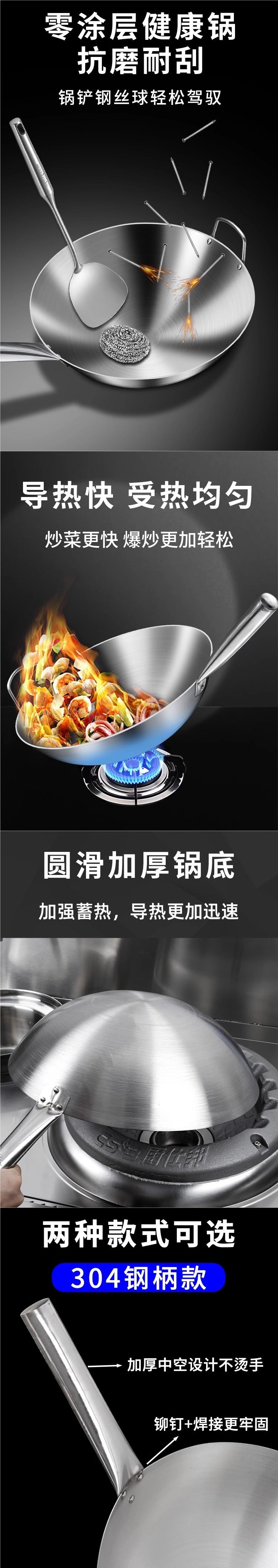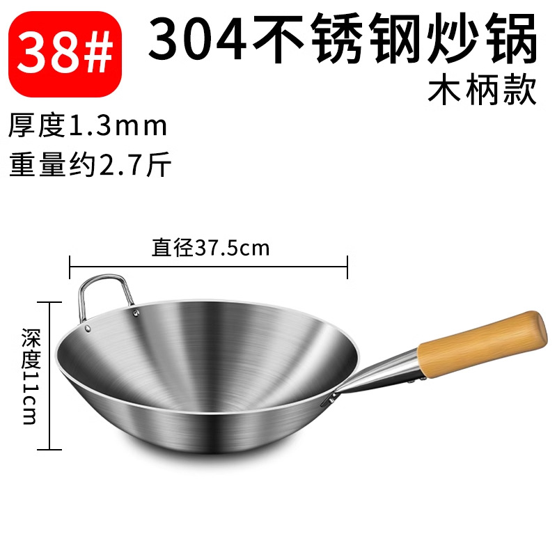 加厚纯304不锈钢单柄炒锅食品级饭店商用家用炒菜锅圆底无涂层