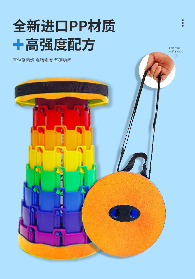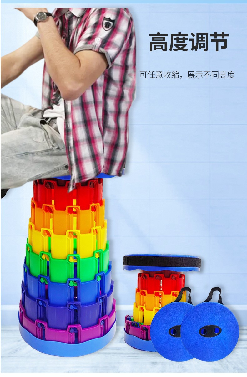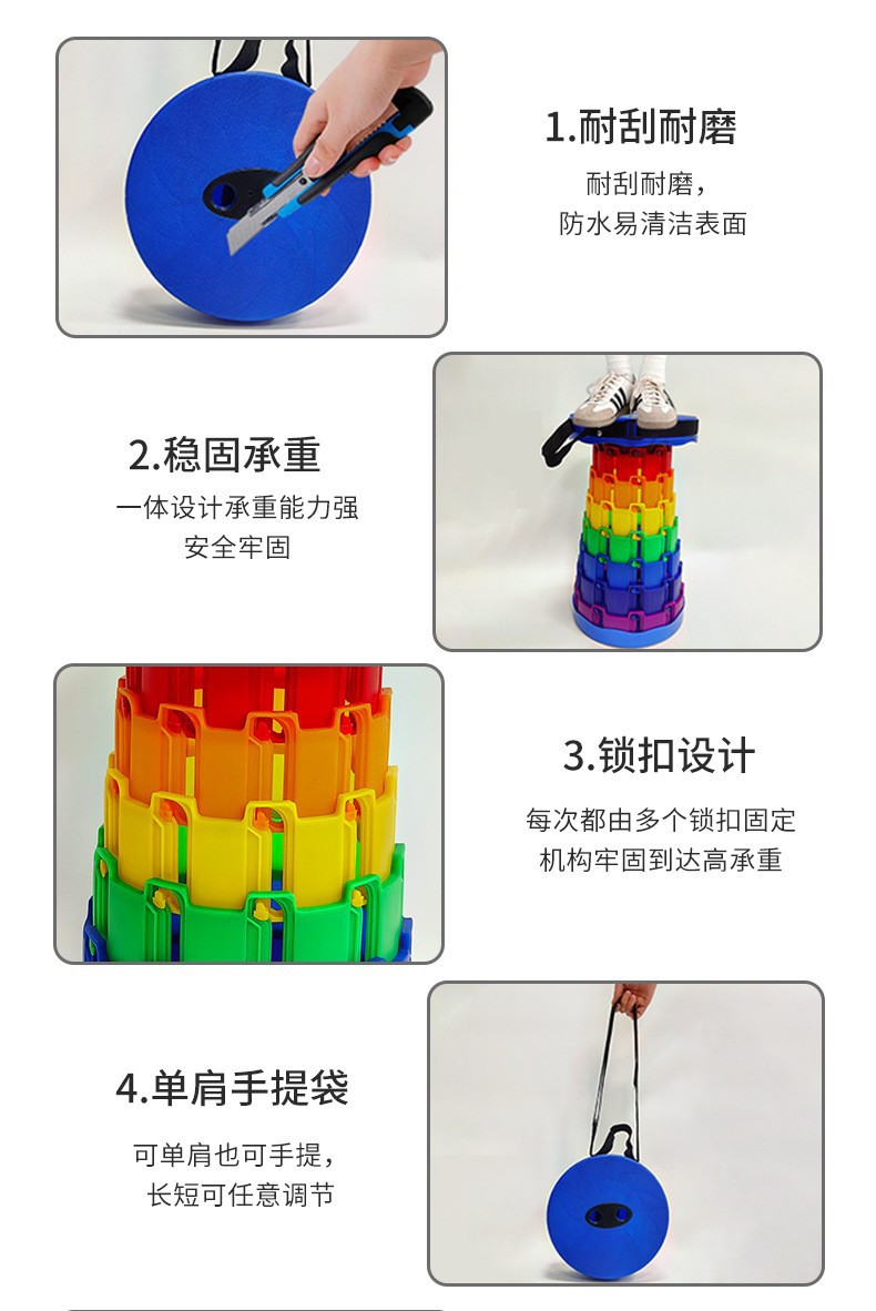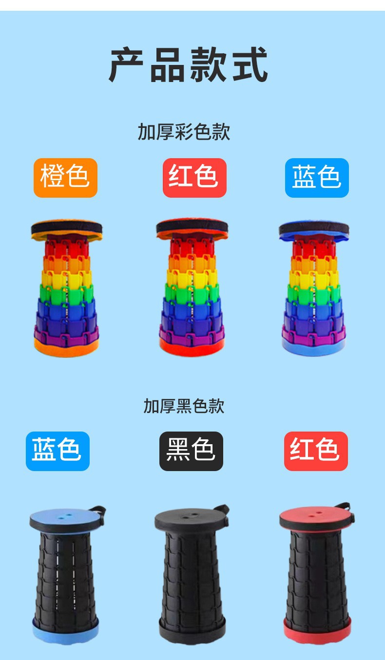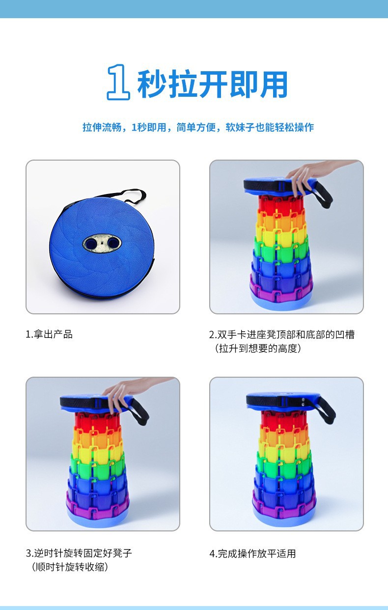 [产品描述]此款伸缩折叠凳由聚丙烯材料制成,防水耐用,高度可伸缩自由调节,重量仅1公斤左右,便于携带。无论室内还是户外,使用场景广泛:购物排队、乘坐火车地铁等交通工具、户外游玩野餐、换鞋等。亦可采购作为活动赠品。