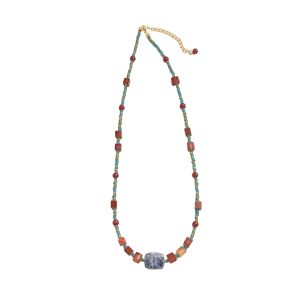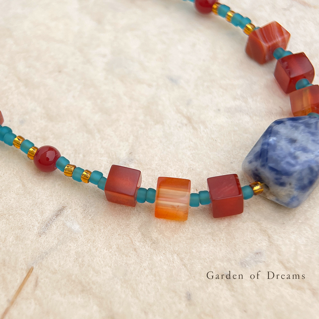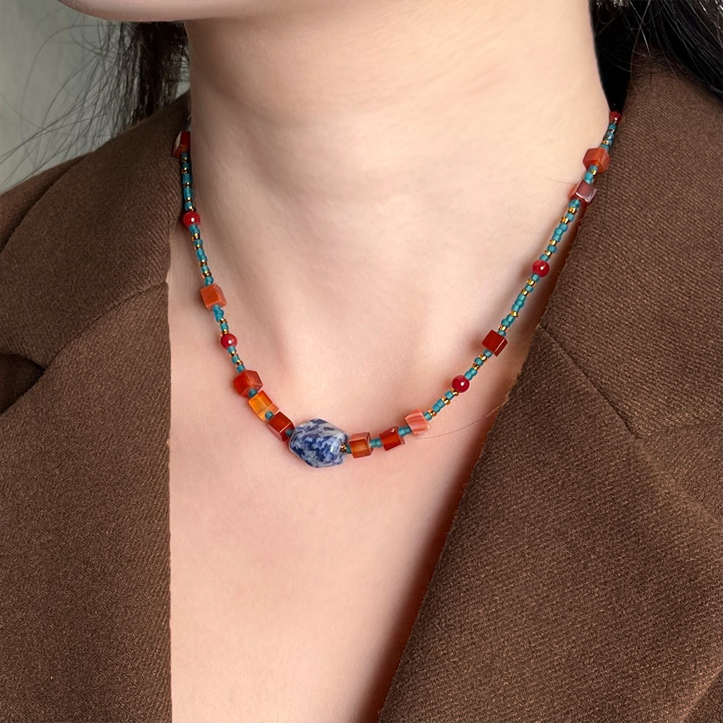 艺术油画~原创手作天然石红玛瑙撞色项链复古文艺风锁骨链项饰品