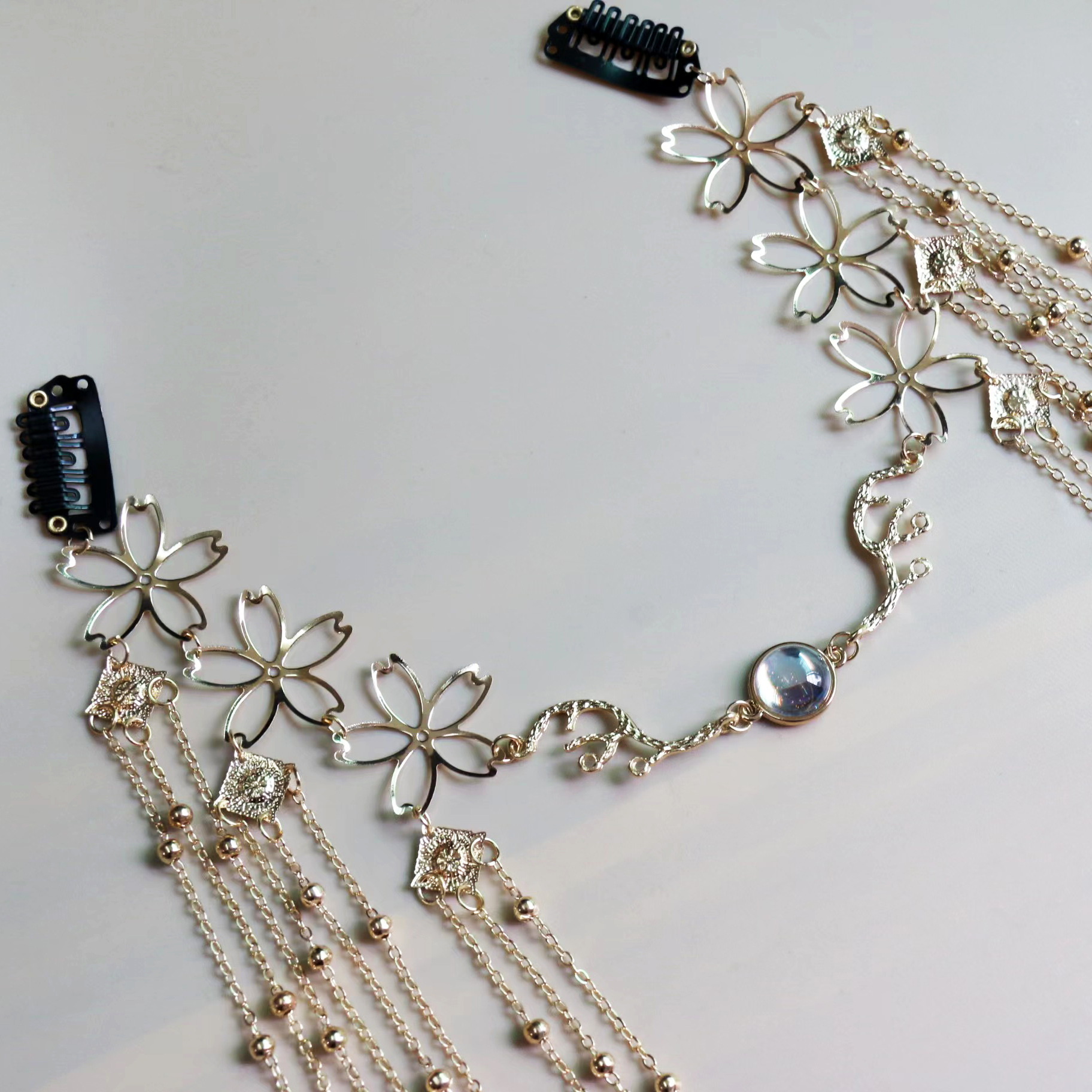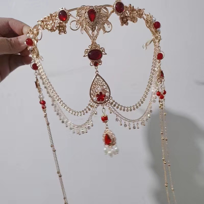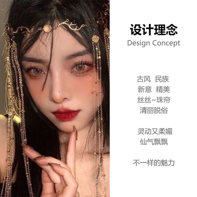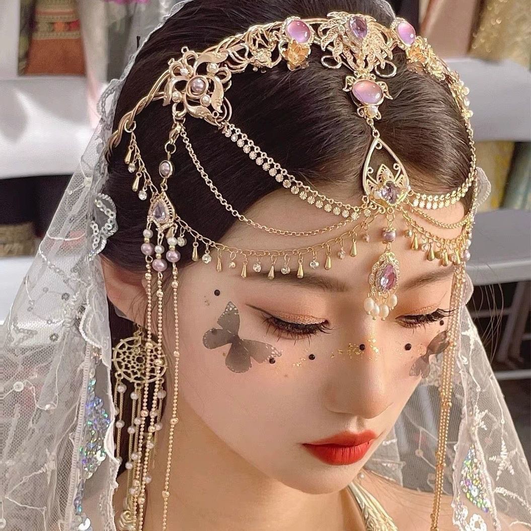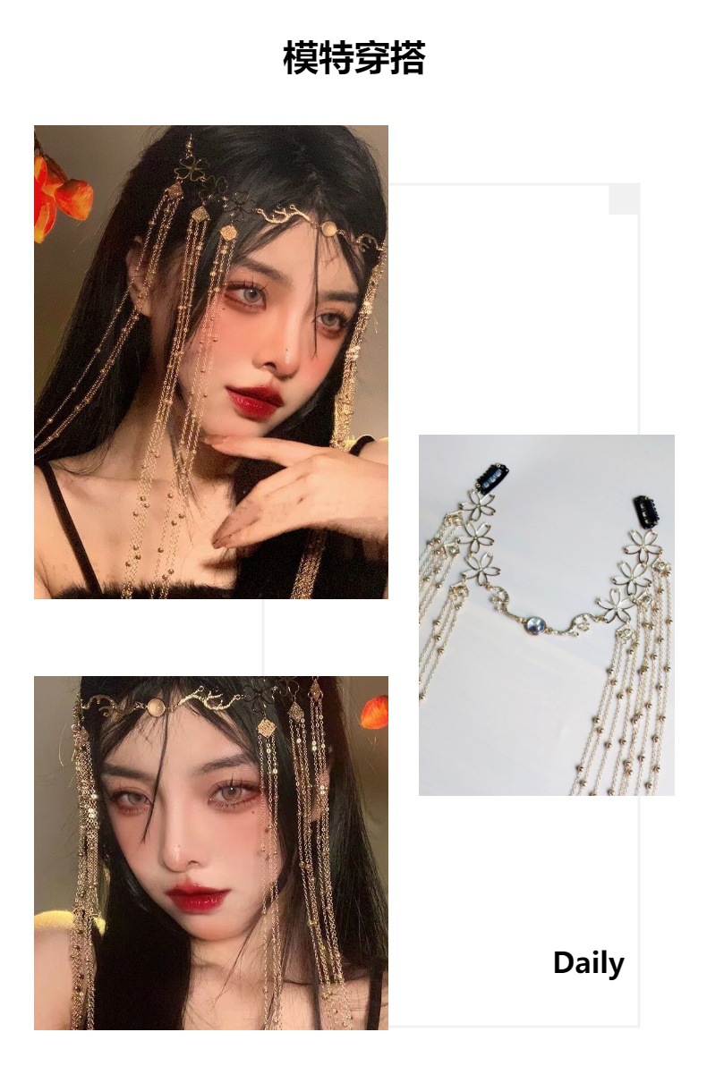 新款流苏古风汉服古装古风面帘额饰网红发饰金色夹珠链头饰发带