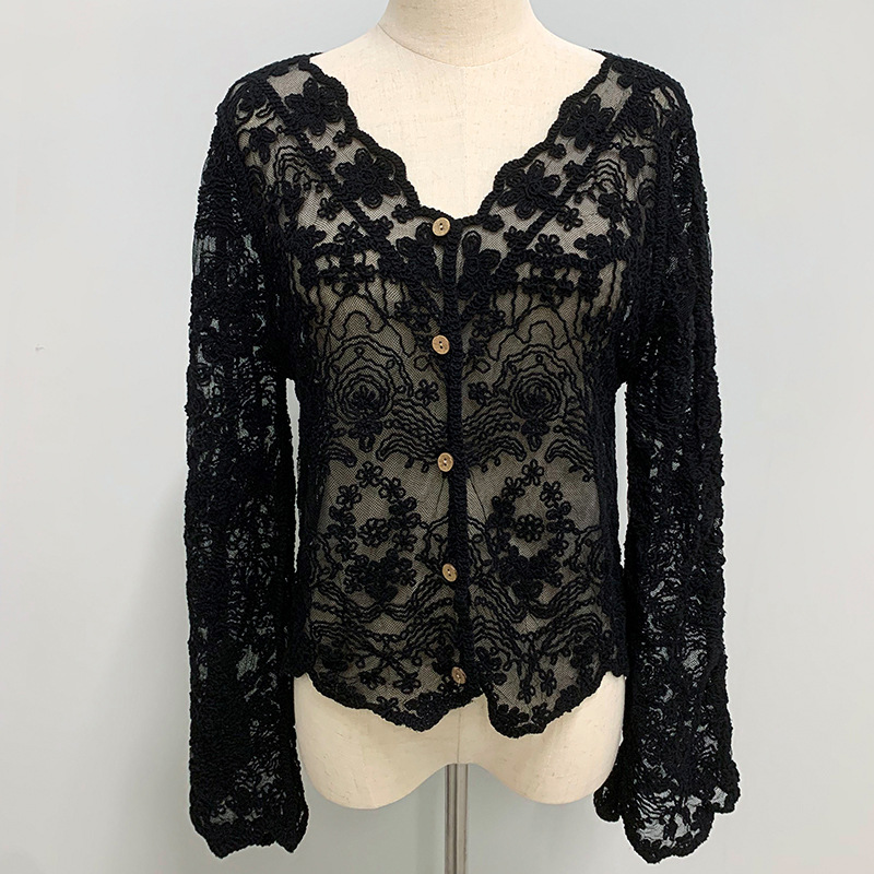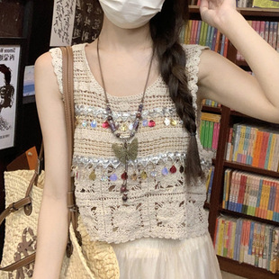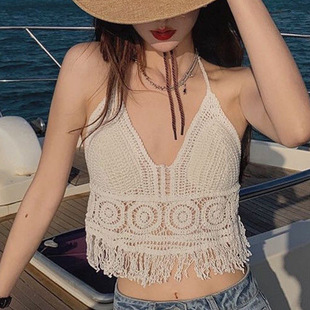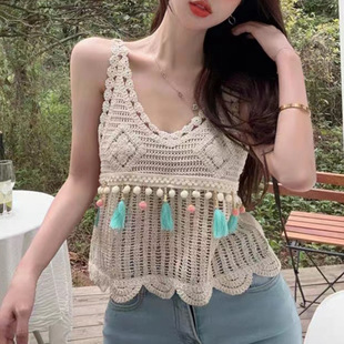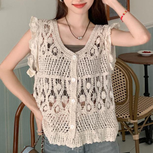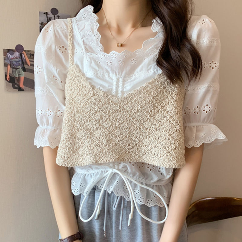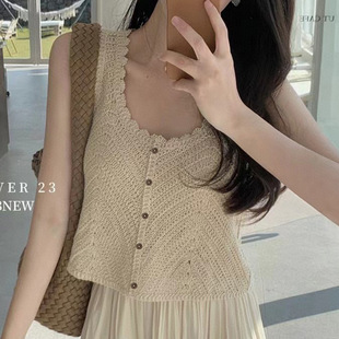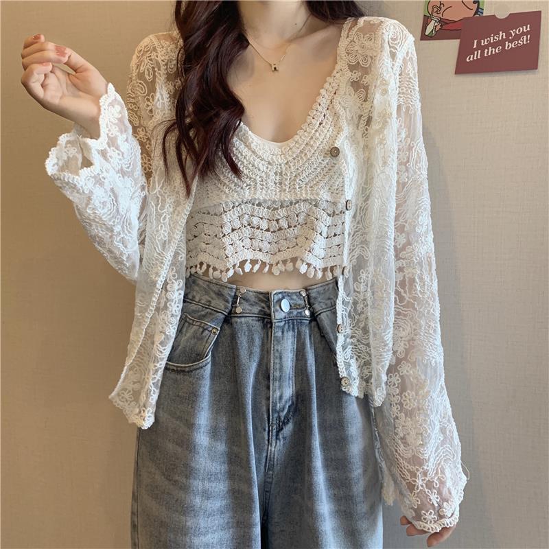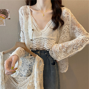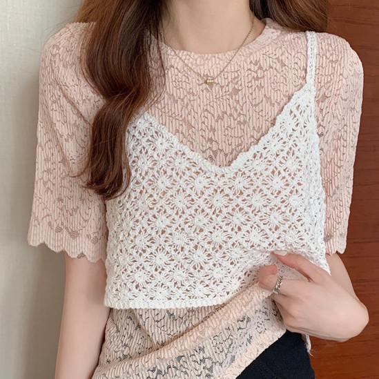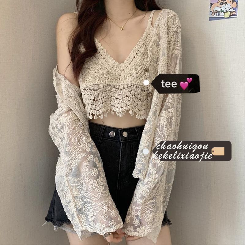 套装女甜美风吊带背心+洋气钩花镂空气质蕾丝衫两件套度假装 160