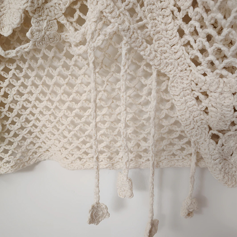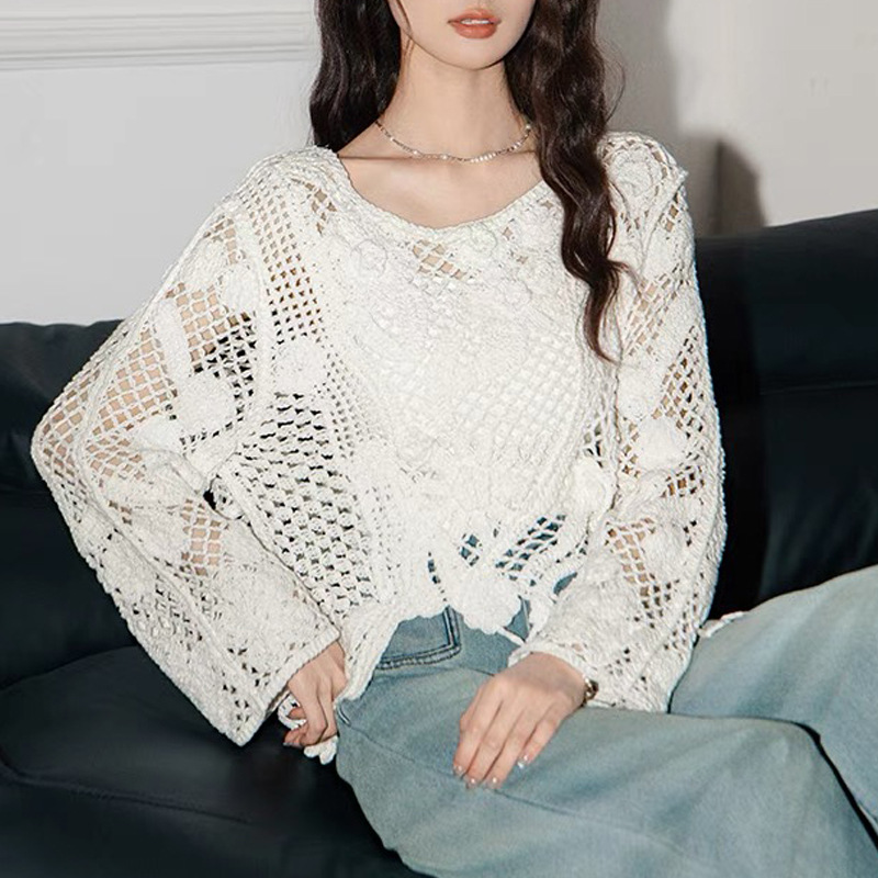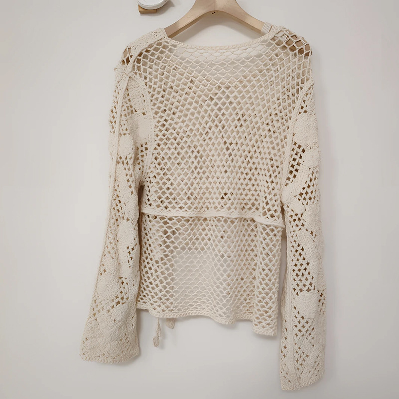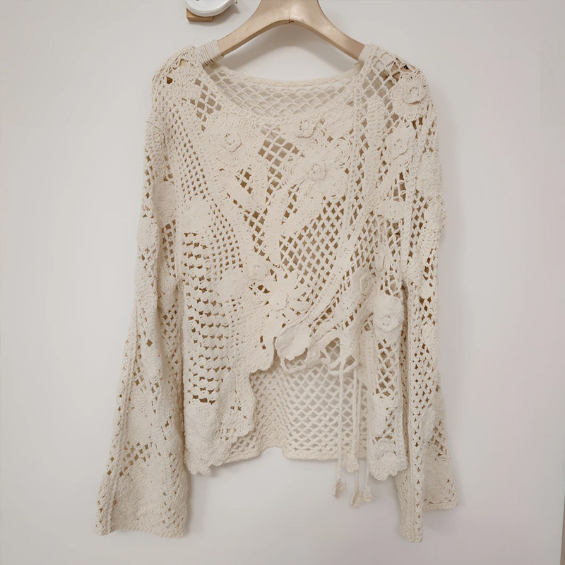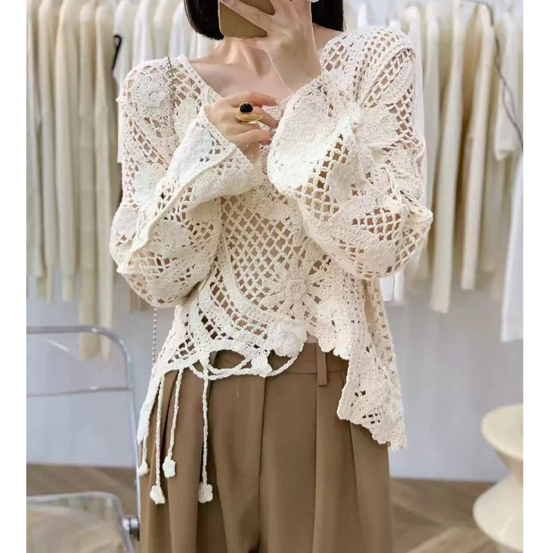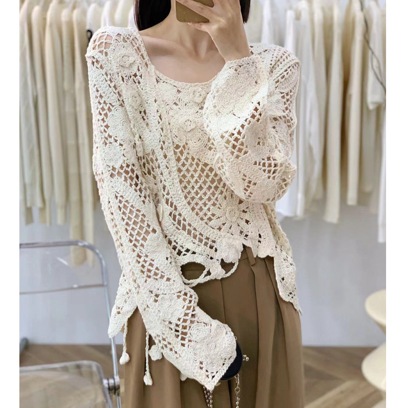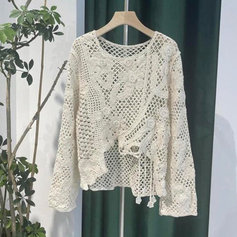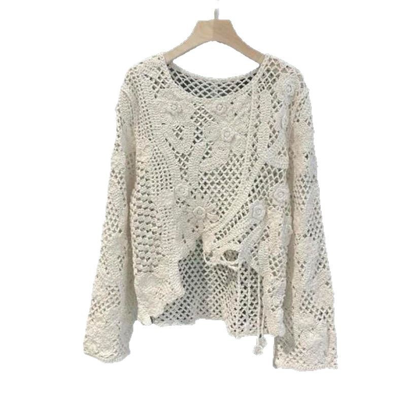 2025春夏新款法式圆领长袖不对称破洞镂空针织罩衫长袖针织衫 585