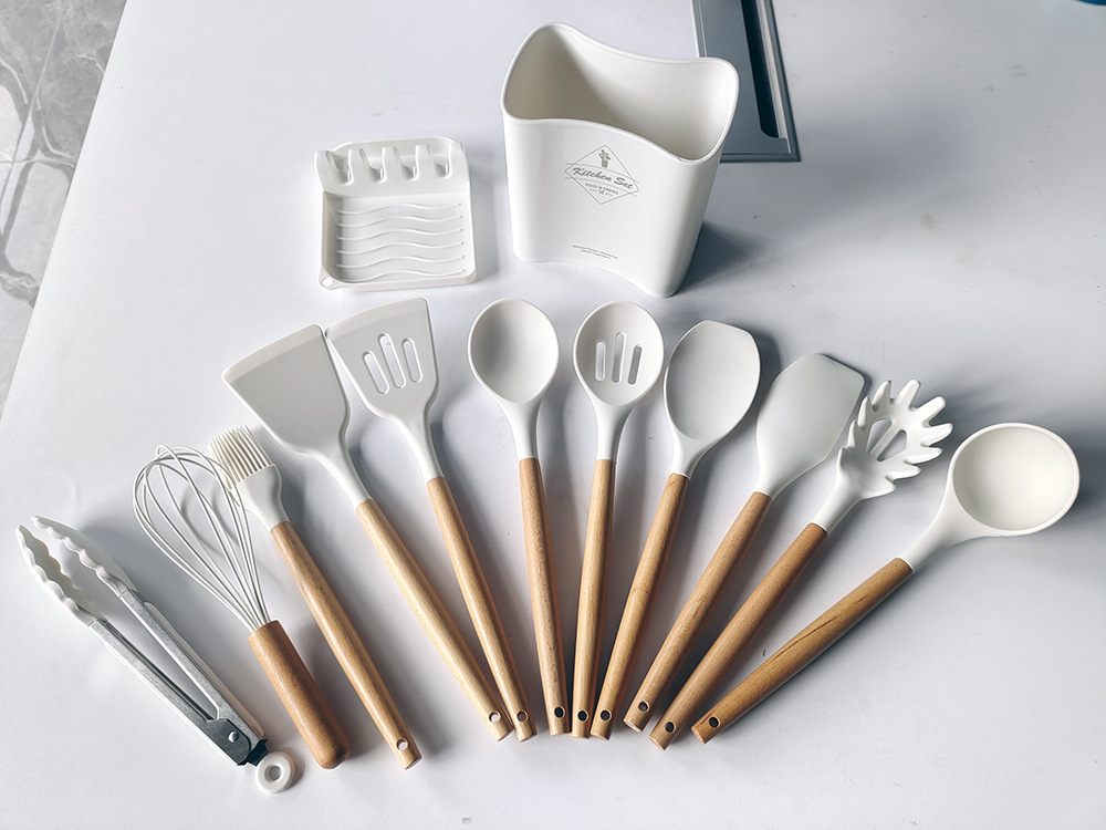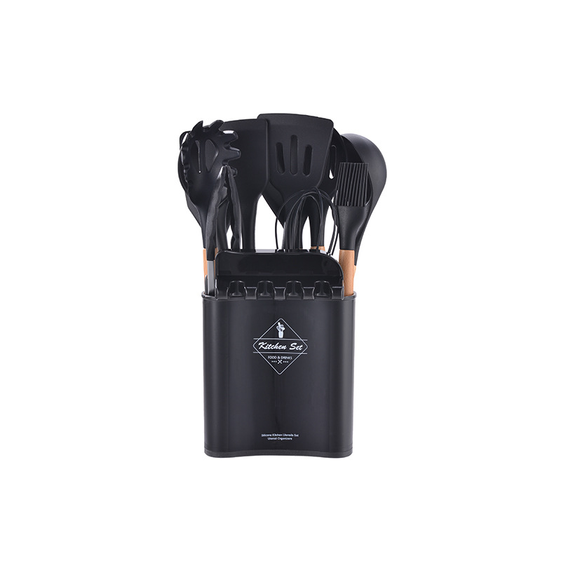 现货收纳桶装木柄硅胶厨具套装不沾锅烹饪勺铲厨具架十二件套装