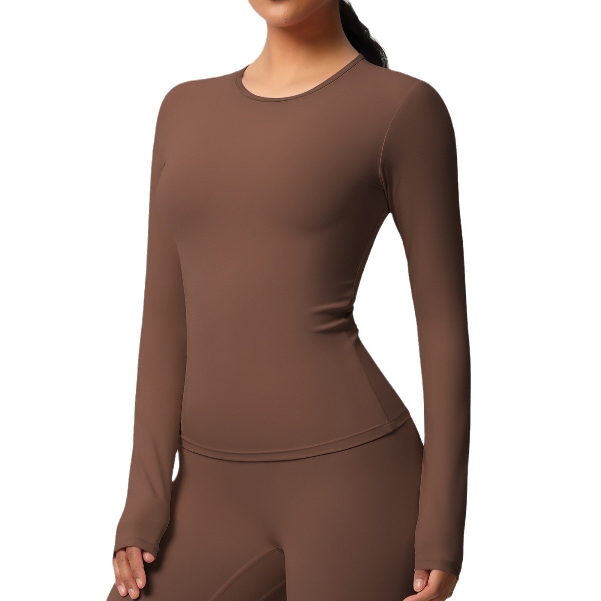新款现货跨境双面磨毛纯色长款训练运动长袖T恤跑步健身瑜伽服女