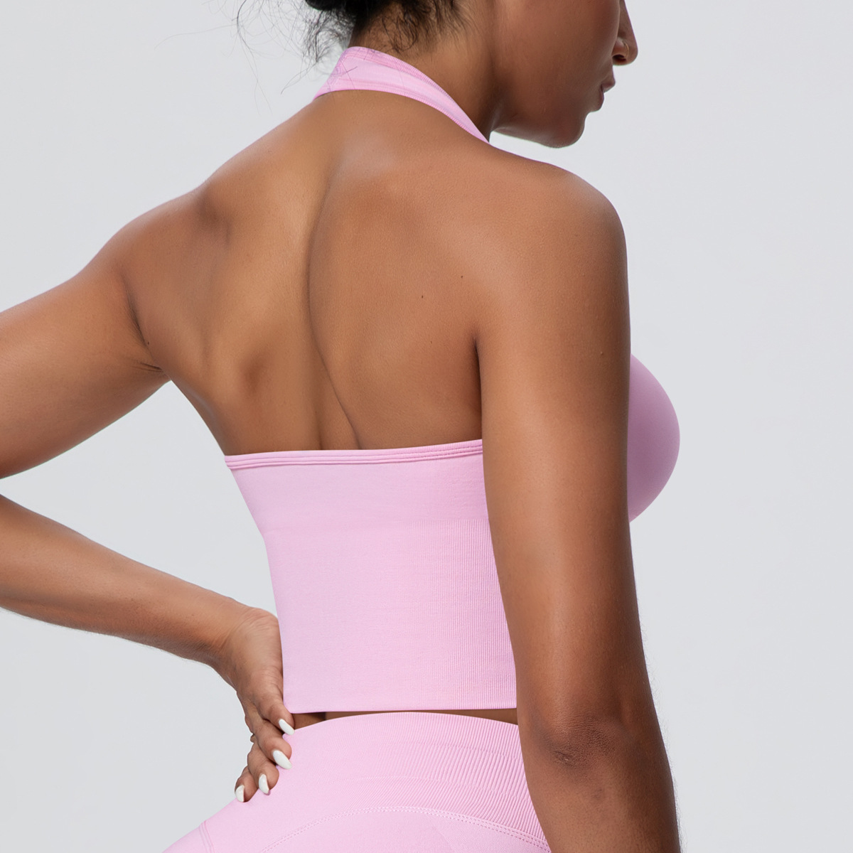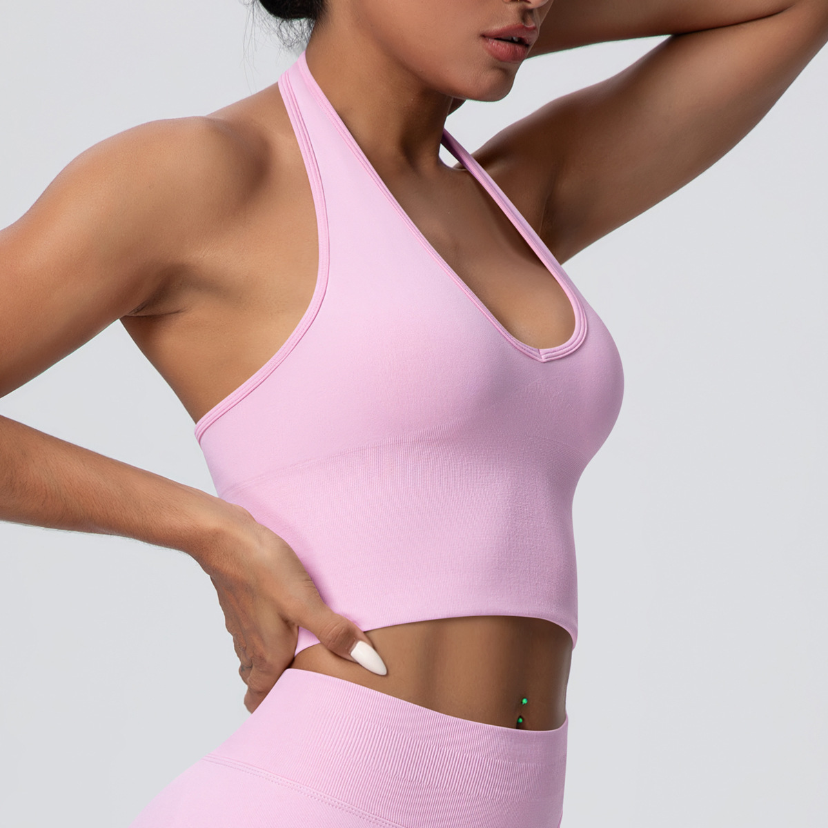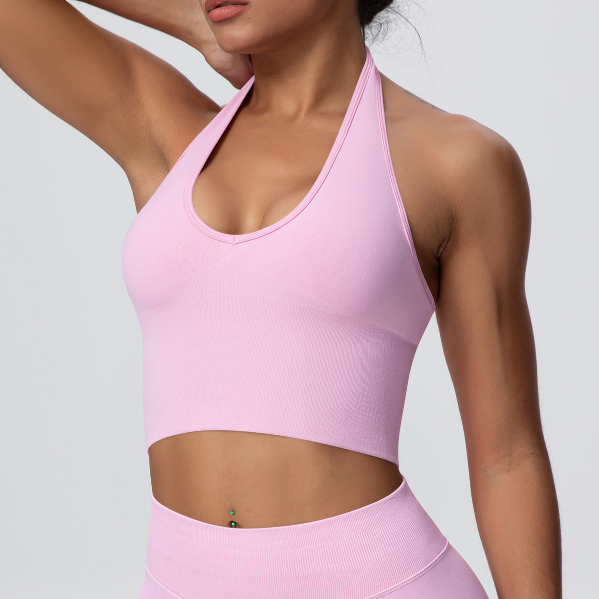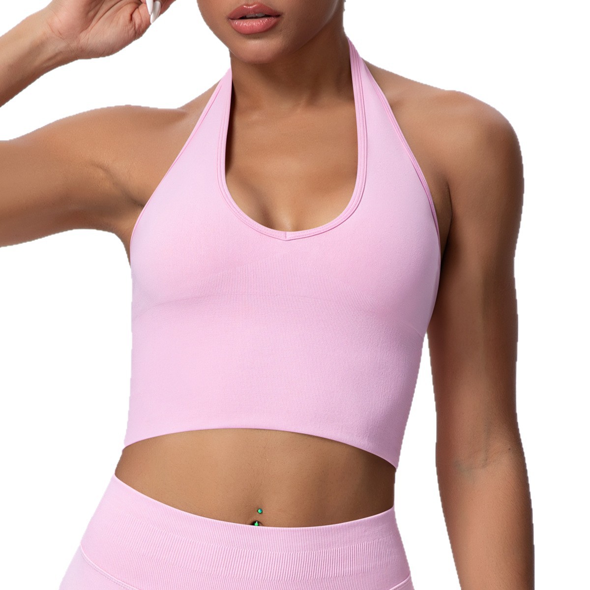 跨境欧美透气挂脖美背瑜伽文胸欧美无缝运动内衣女夏防震健身上衣