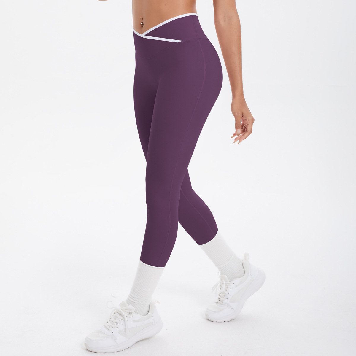 跨境新款欧美撞色交叉紧身高弹高腰阔腿裤运动跑步健身瑜伽九分裤