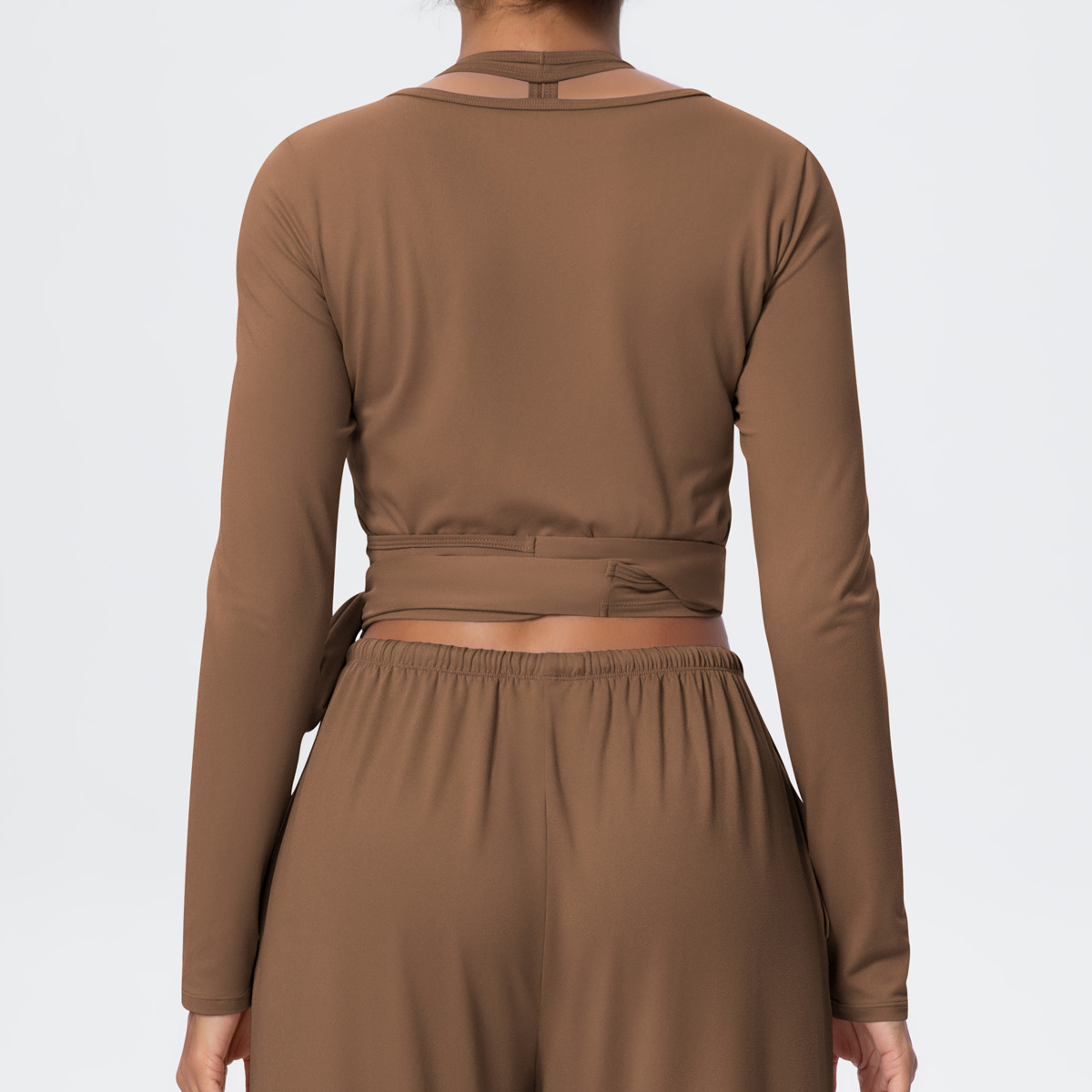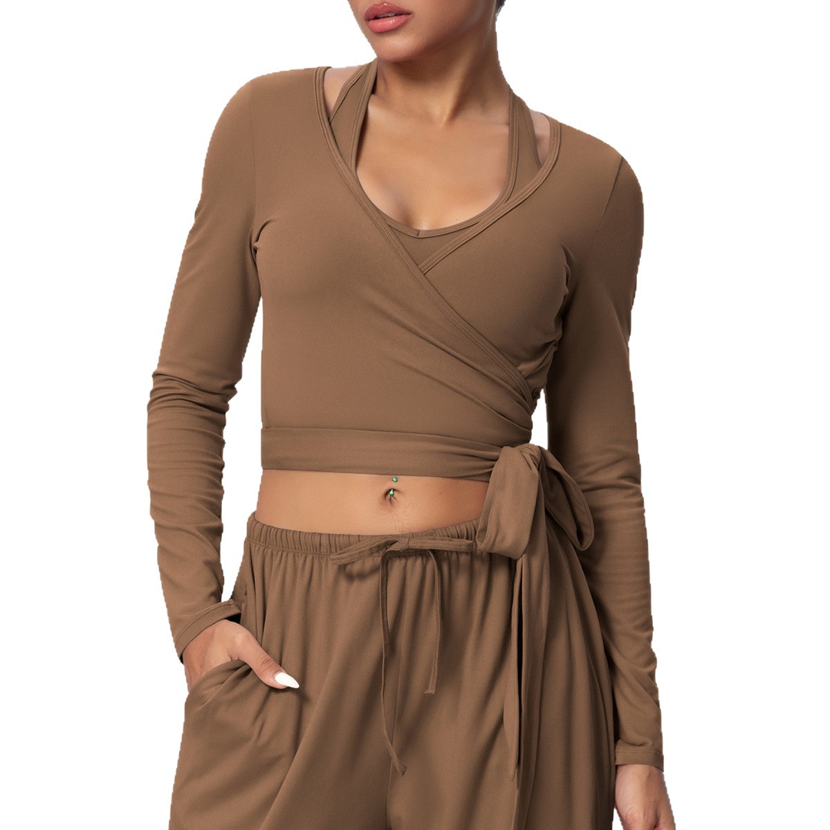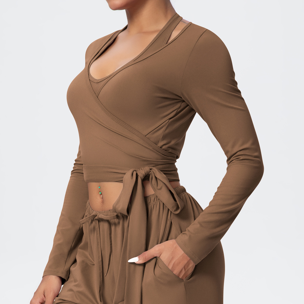 新款跨境纯色磨毛速干紧身交叉绑带V领长袖运动跑步健身瑜伽服女