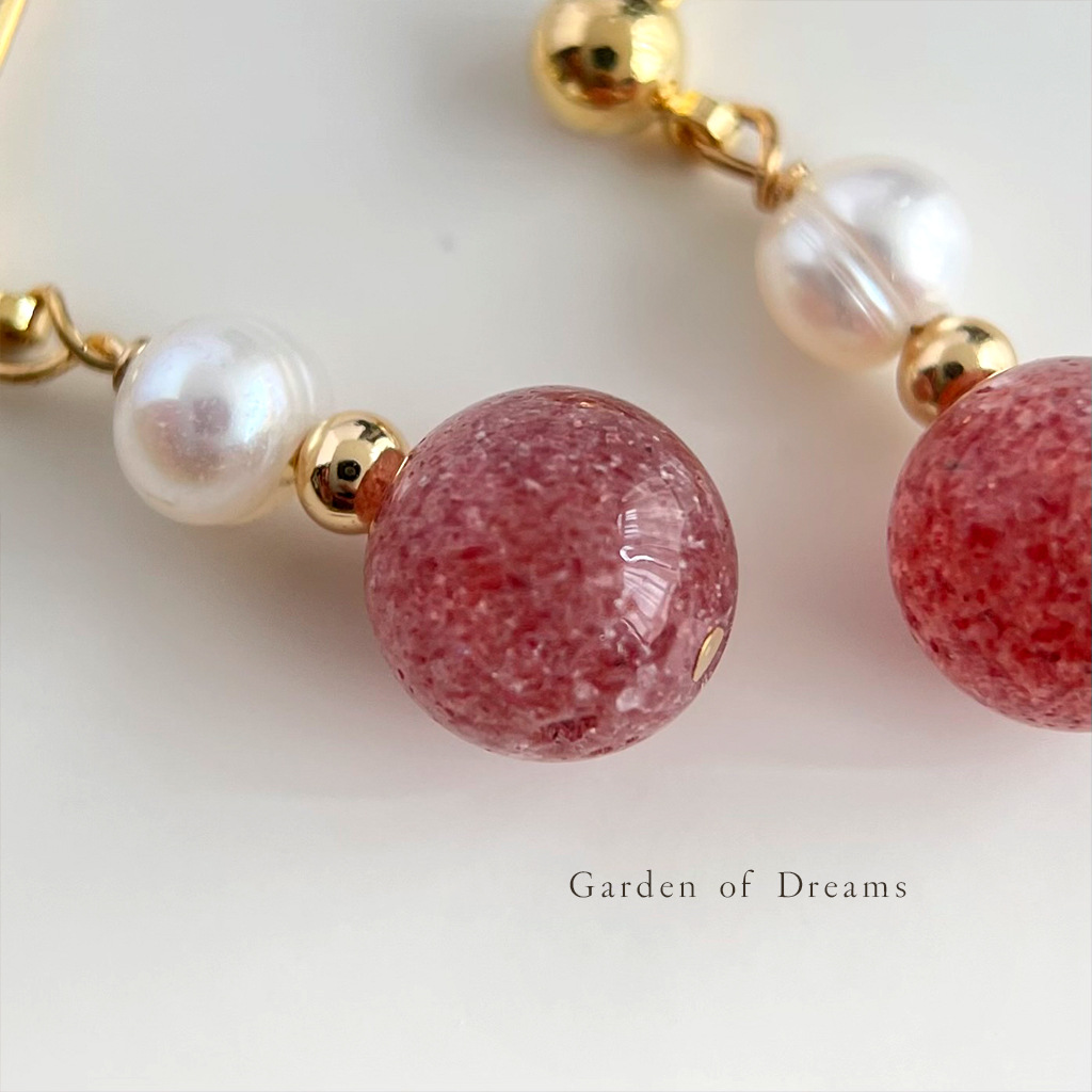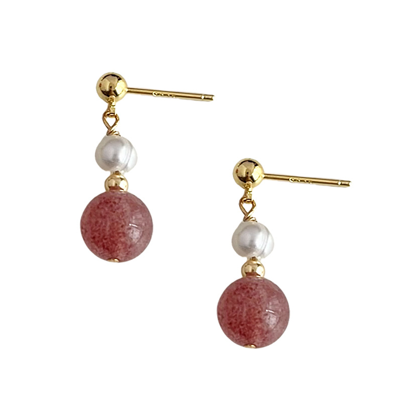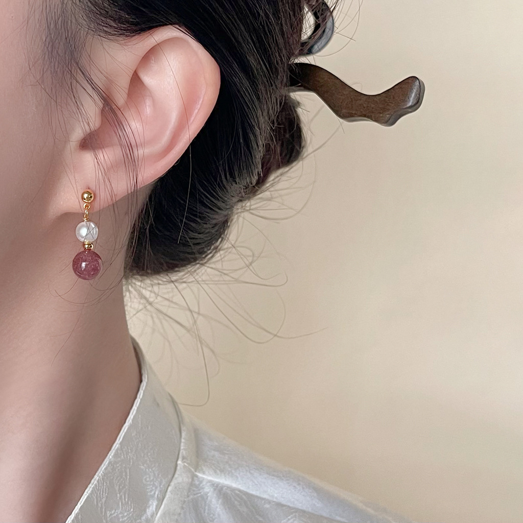 国风原创手作天然石草莓晶淡水珍珠耳环文艺古风新中式耳钉耳饰品