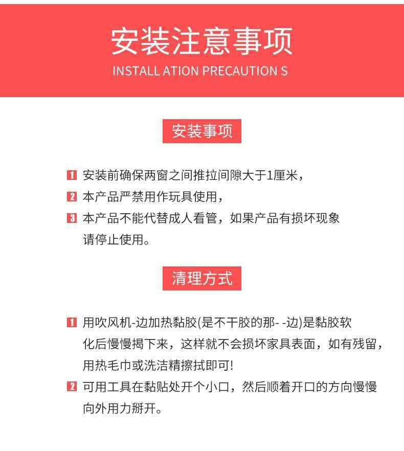 特别提醒:现在的宝宝都是特别聪明,而且1-3岁年龄对什么东西都很好奇,学东西特别的快,特提醒各位家长们,在使用防护用品时尽量不要当着宝宝的面安装,不然引起宝宝的好奇,可能会当时就拉下来,这样再好的胶也会粘不住.粘胶粘好之后,至少要过24小时才可以动.建议在睡觉前安装。
