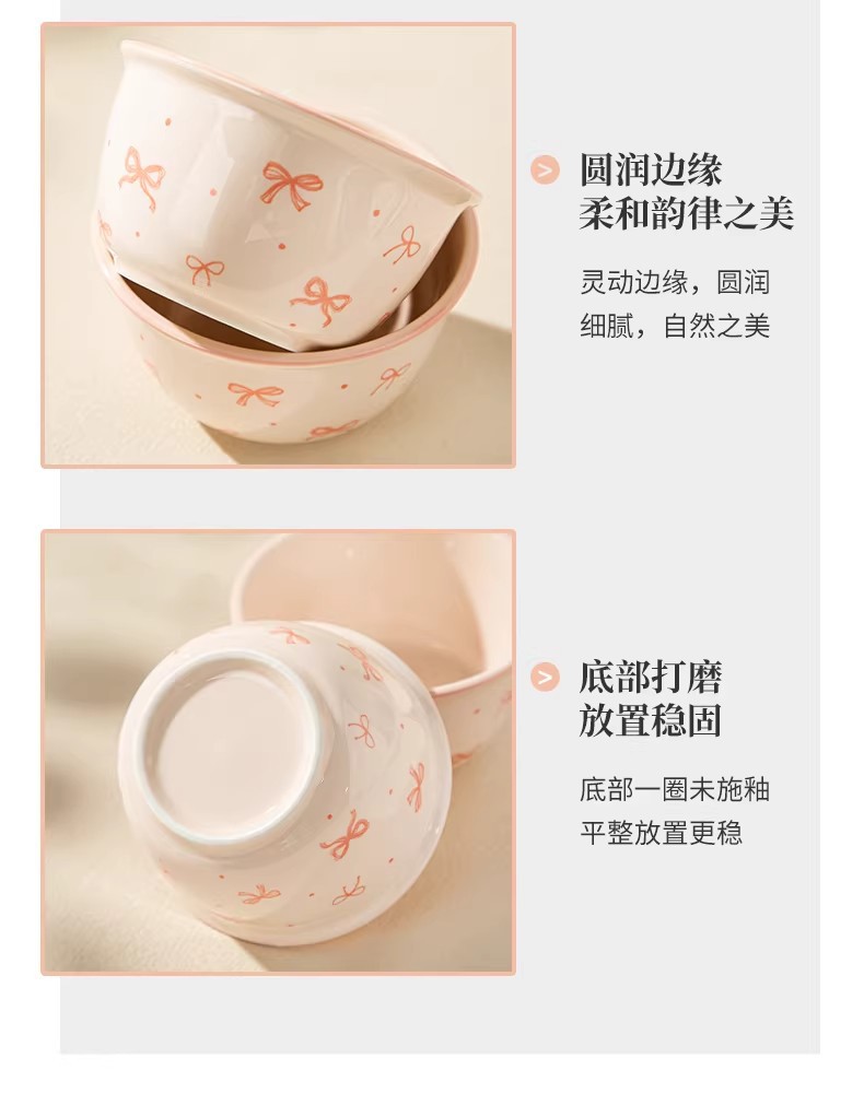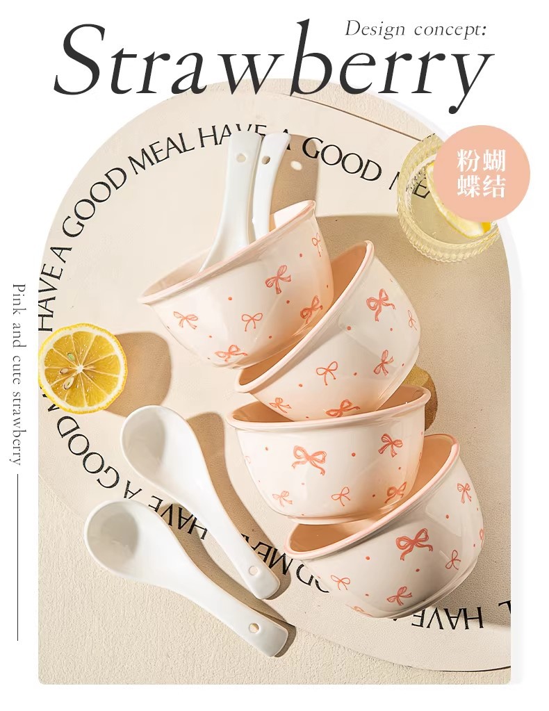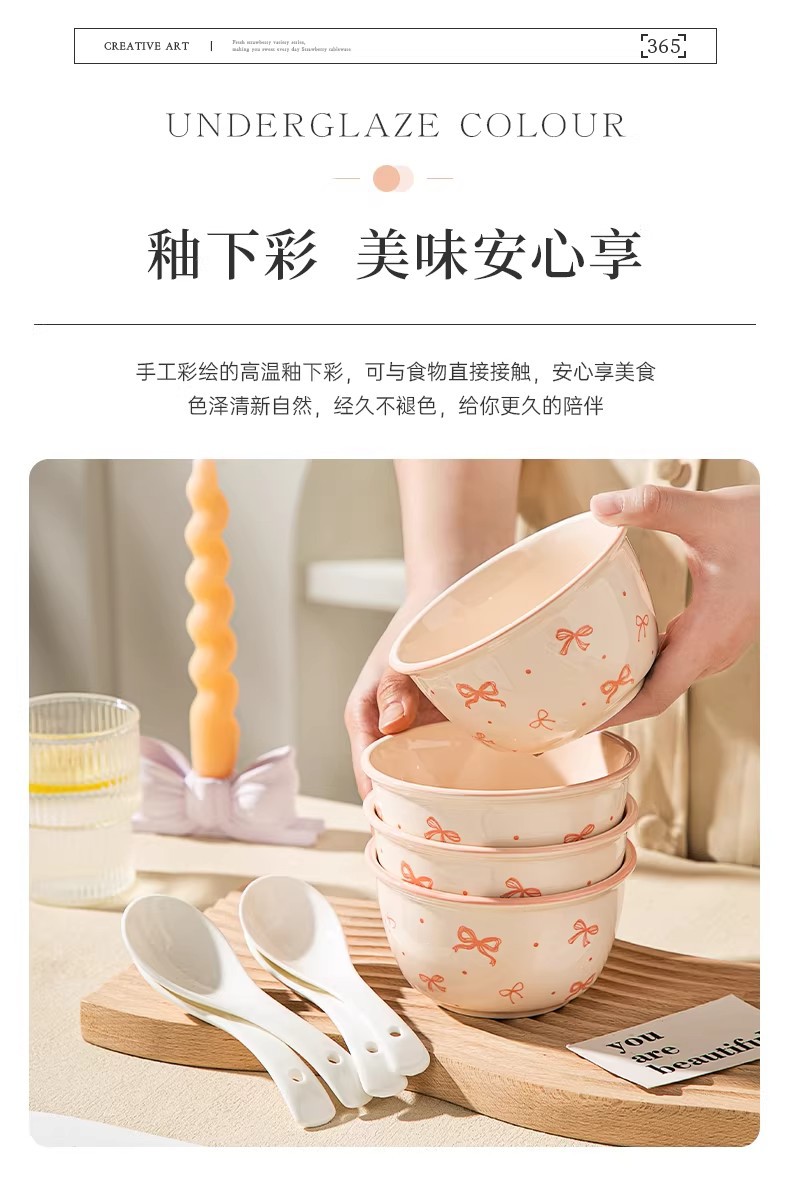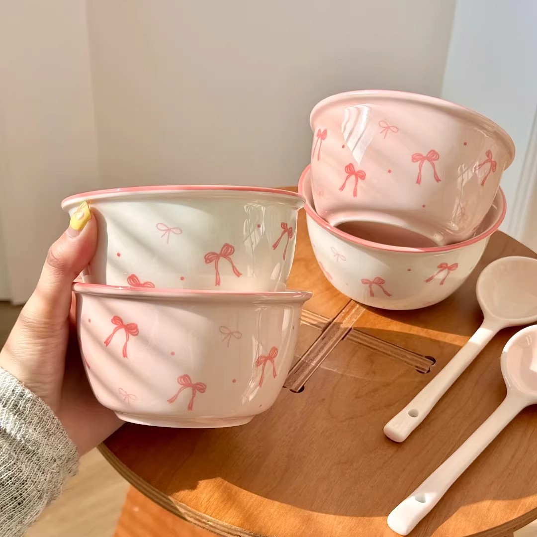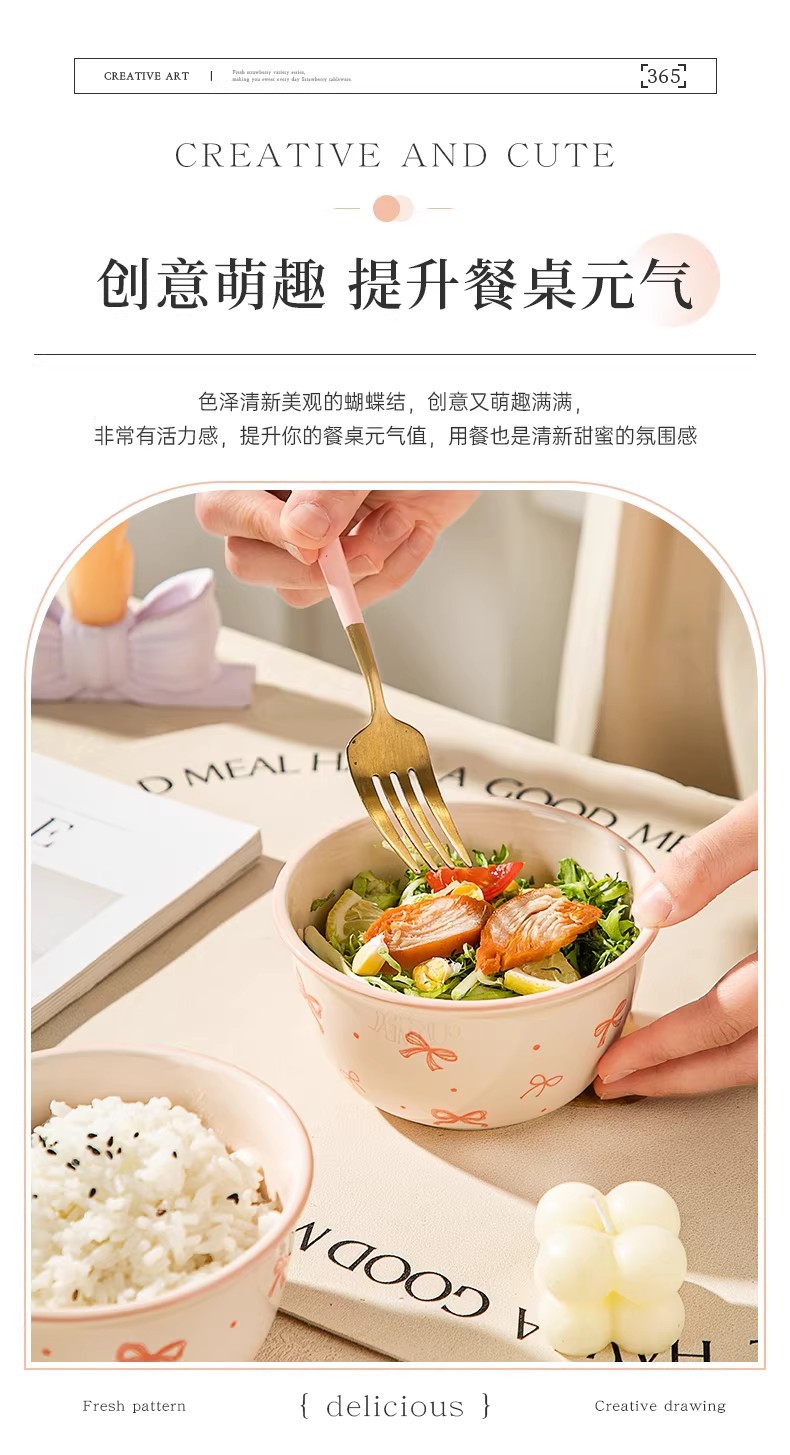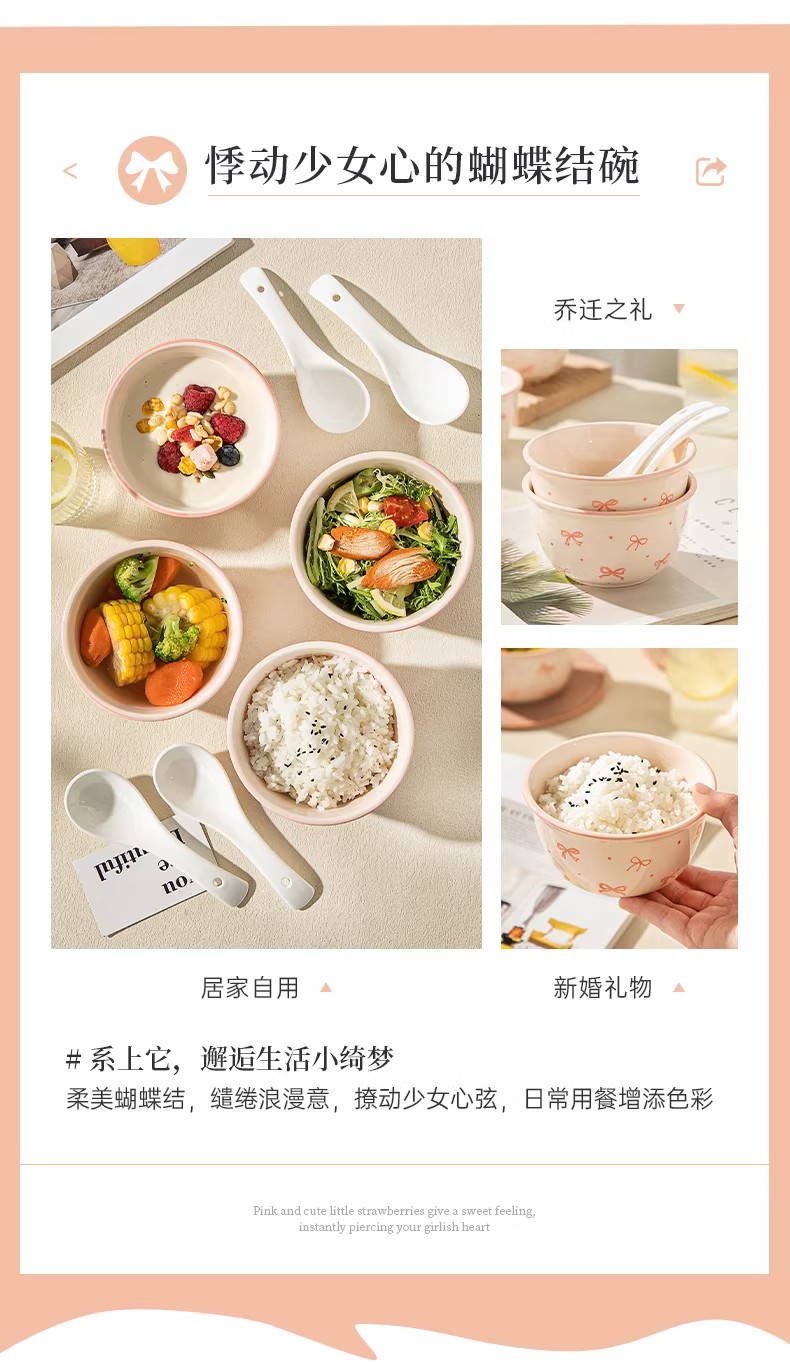 碗勺套装奶油蝴蝶结少女家用陶瓷釉下彩可爱高颜值餐具饭碗甜品碗