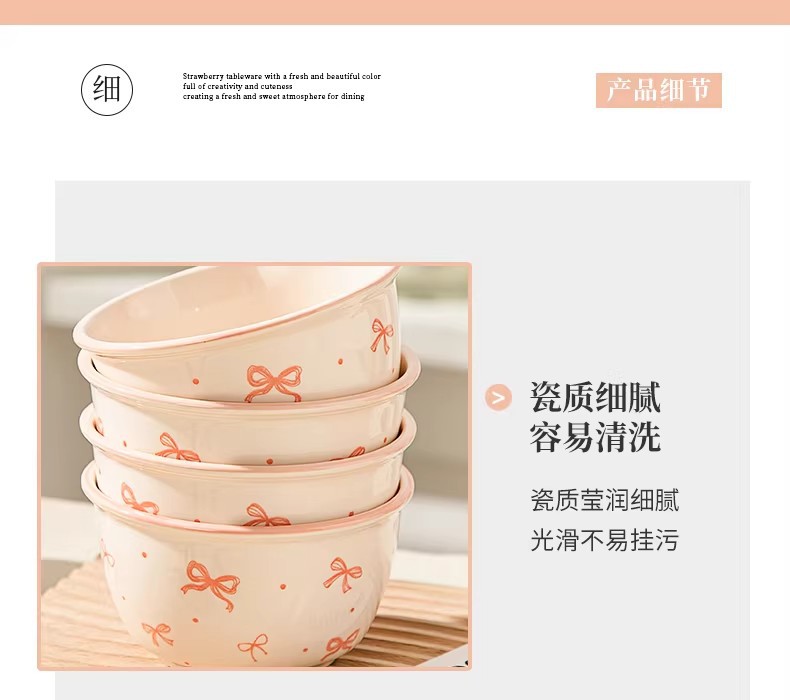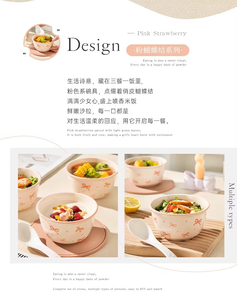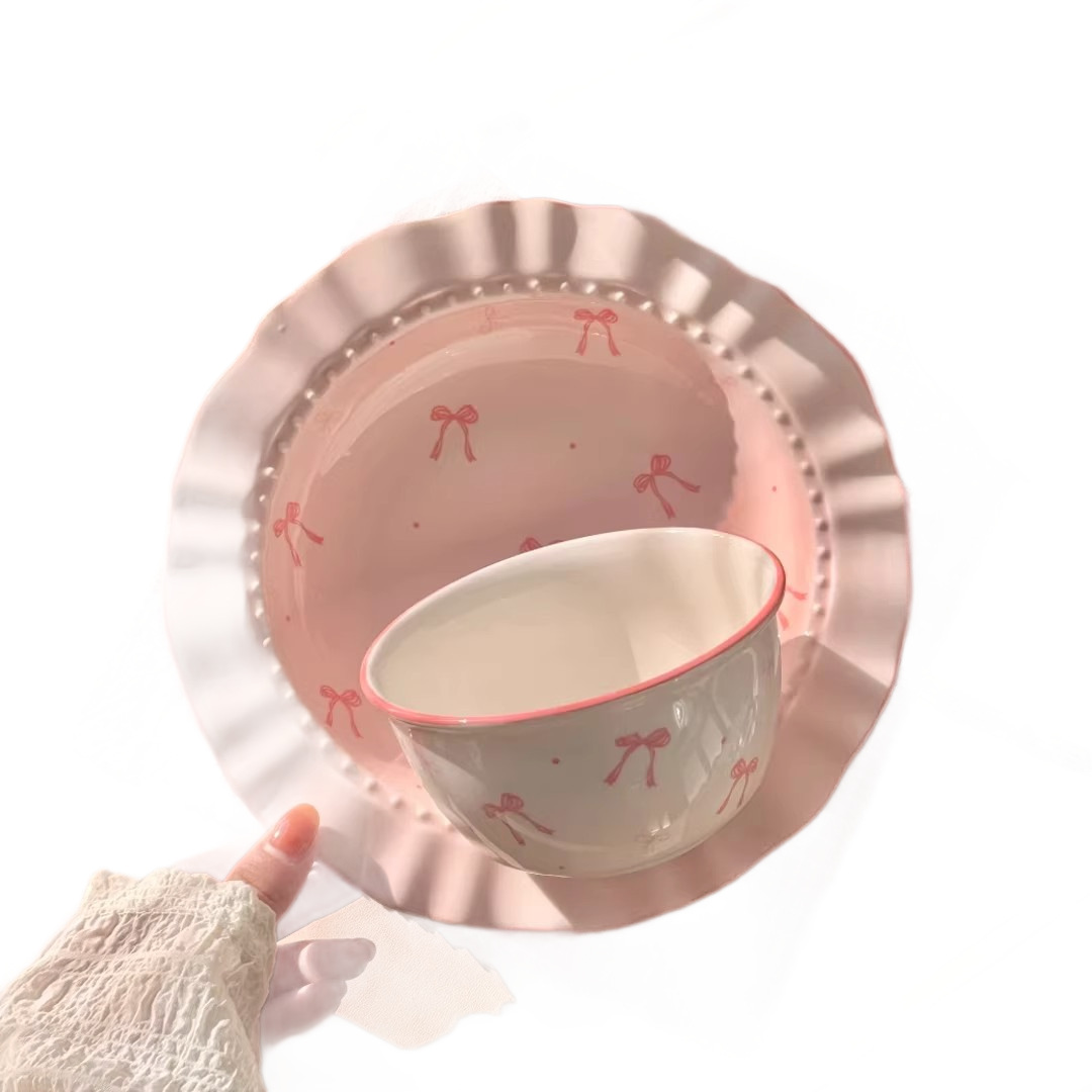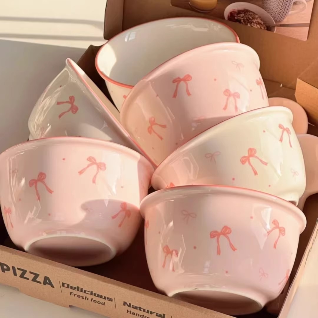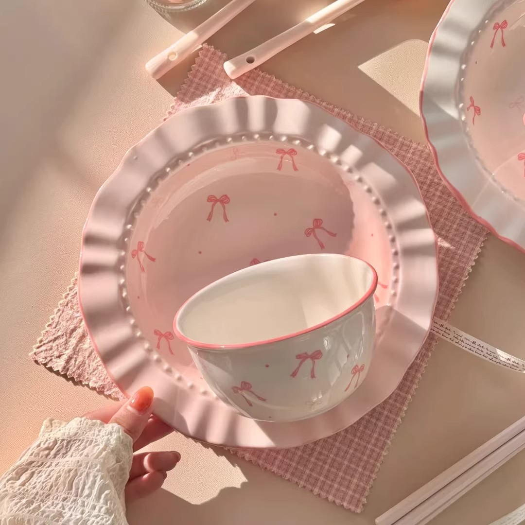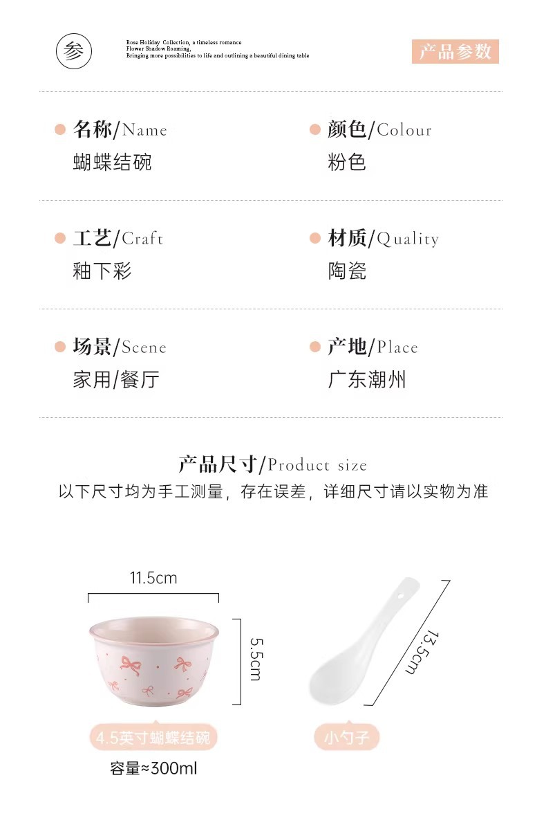 碗勺套装奶油蝴蝶结少女家用陶瓷釉下彩可爱高颜值餐具饭碗甜品碗