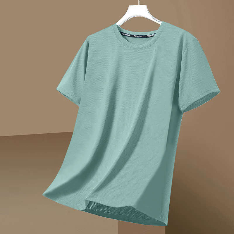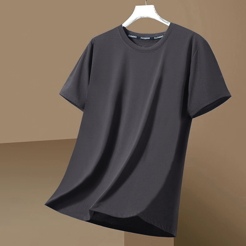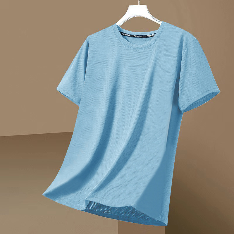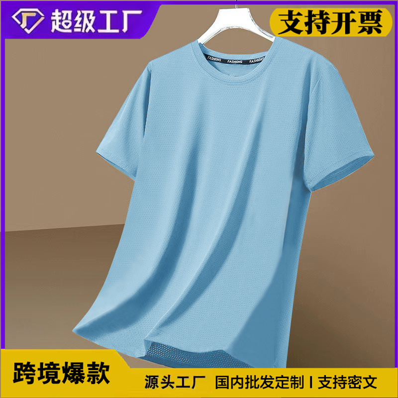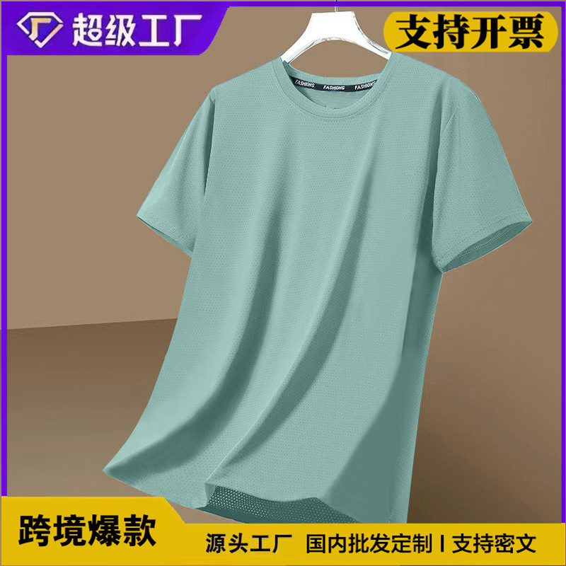 跨境外贸网眼短袖男士休闲纯色透气潮流凉感冰丝速干大码圆领T恤