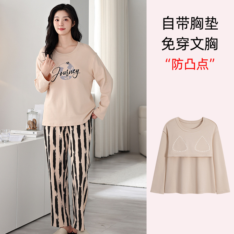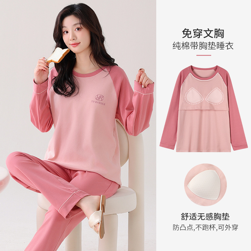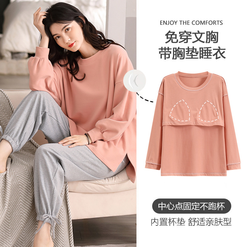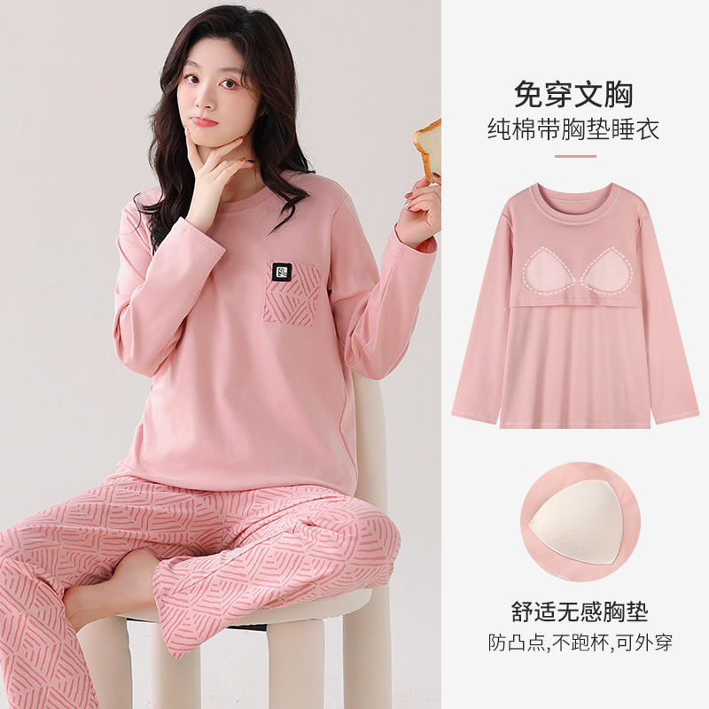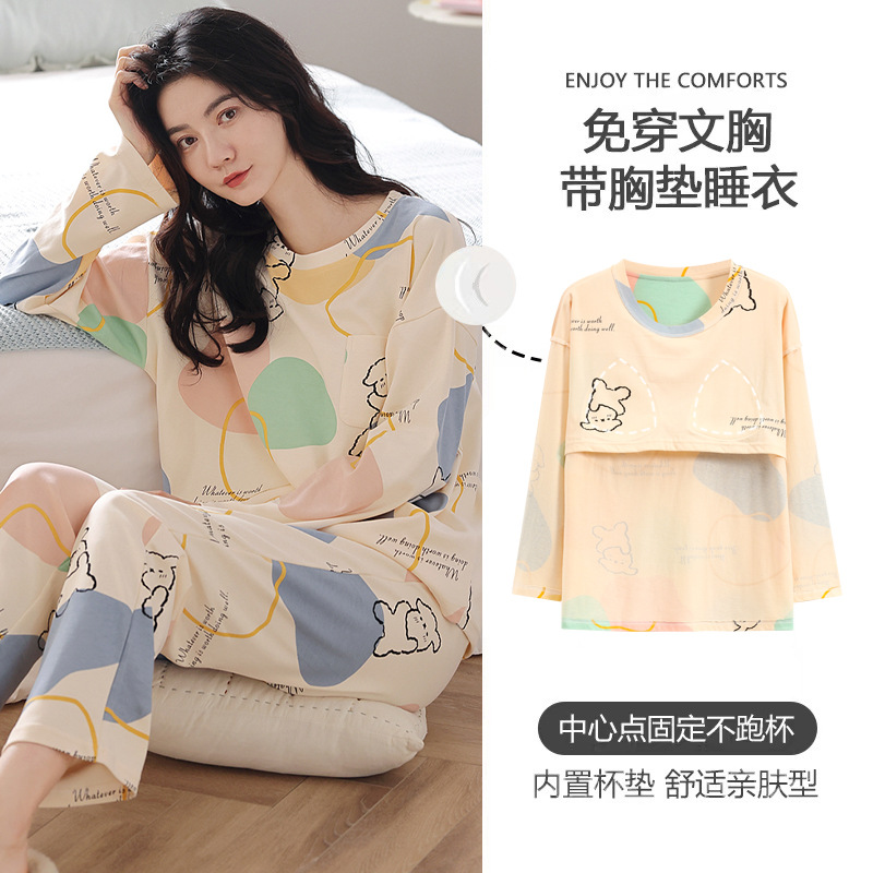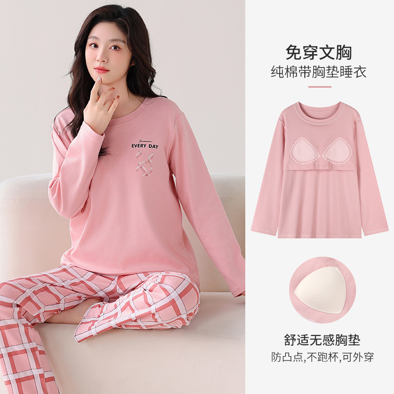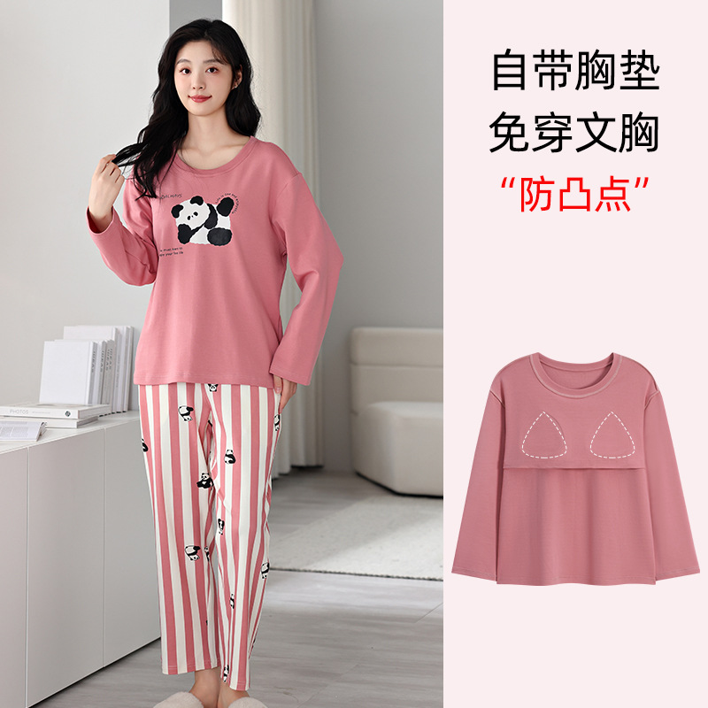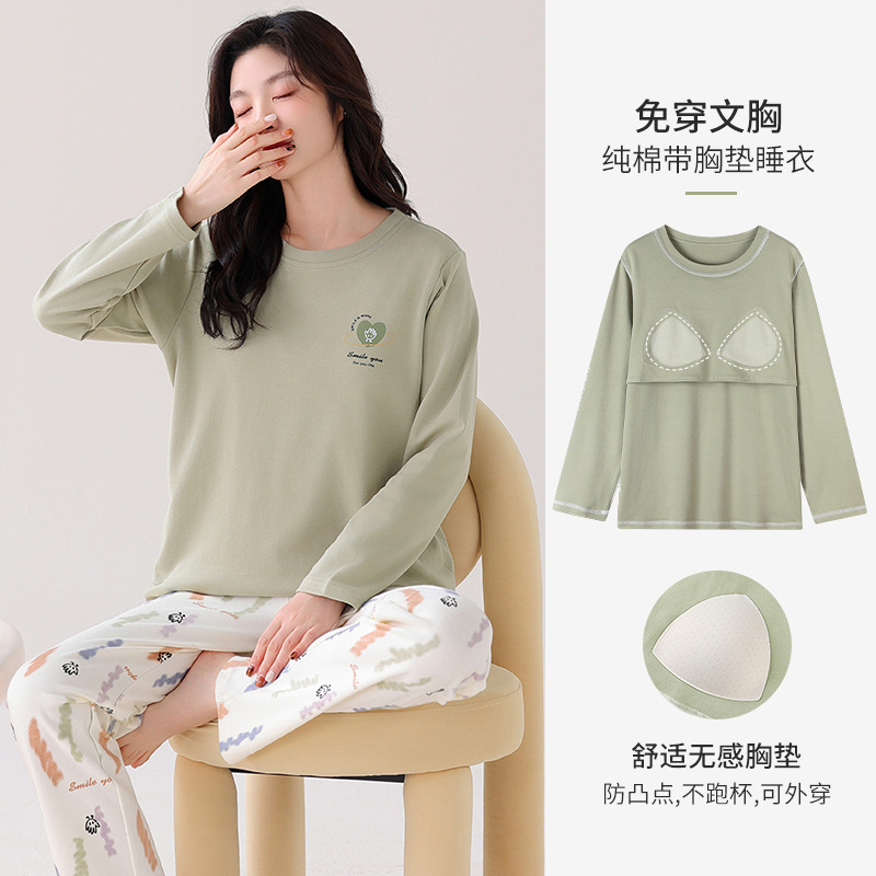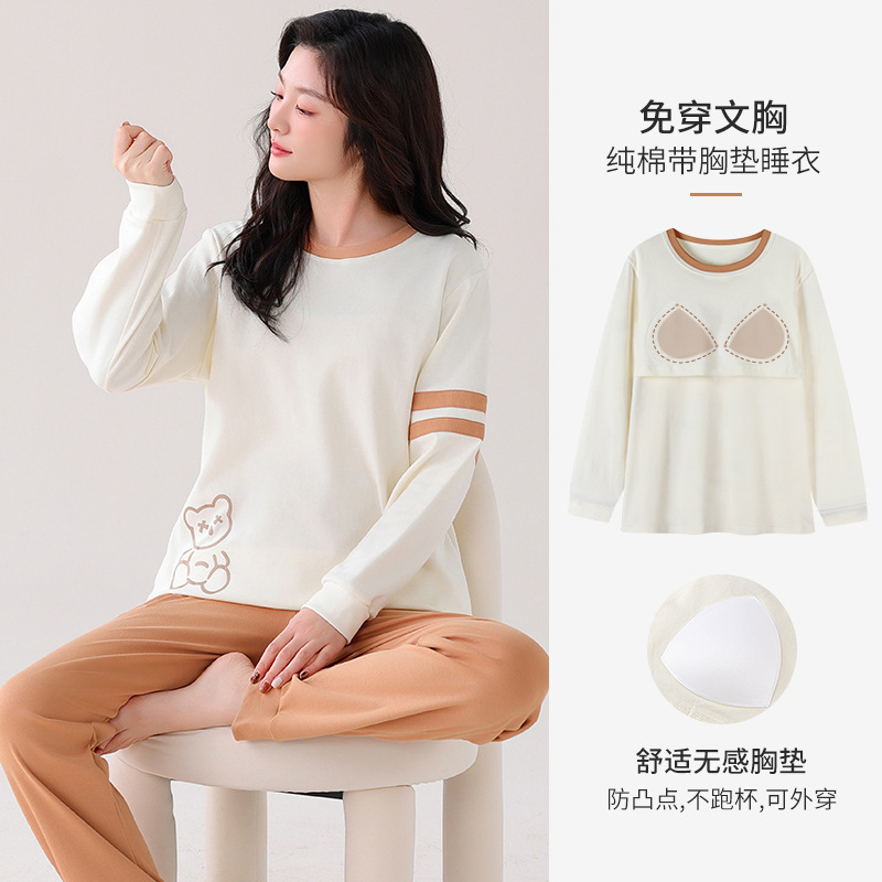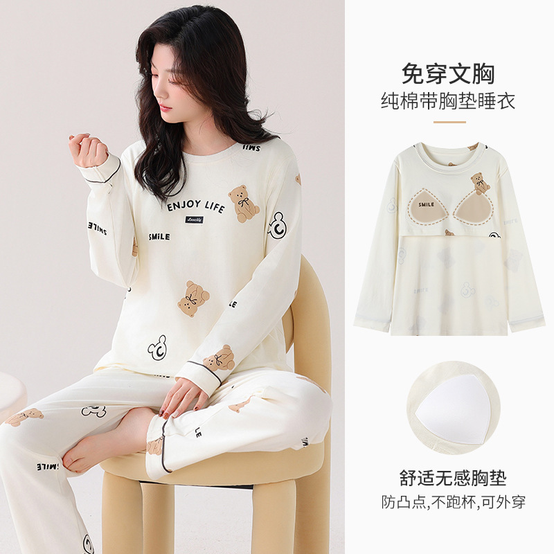 100%纯棉睡衣秋冬款女士卡通休闲薄款带胸垫可外穿家居服春秋套装