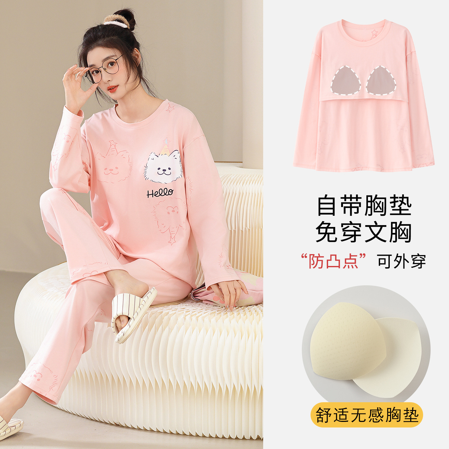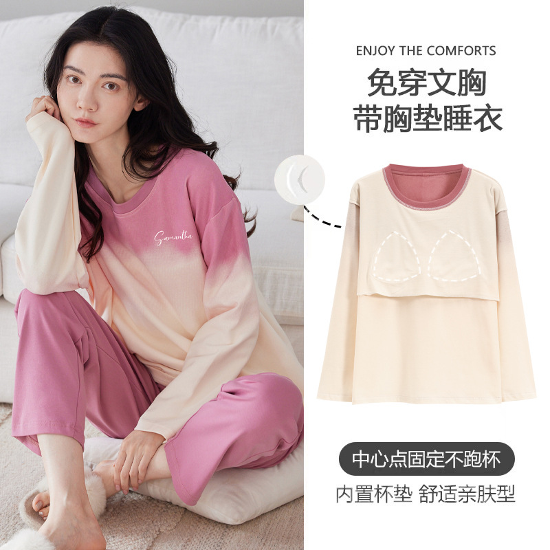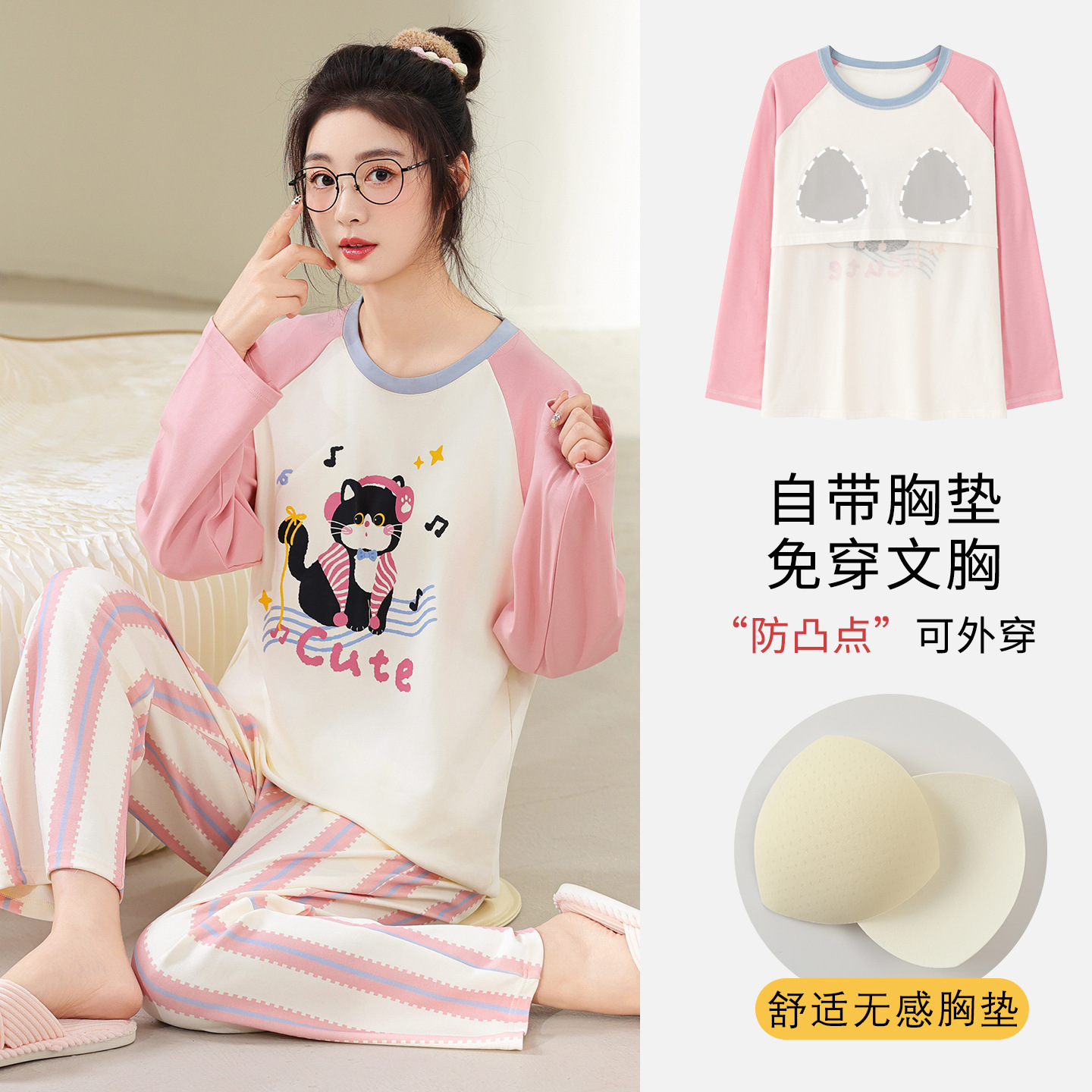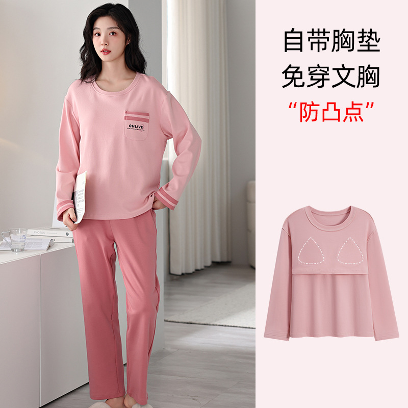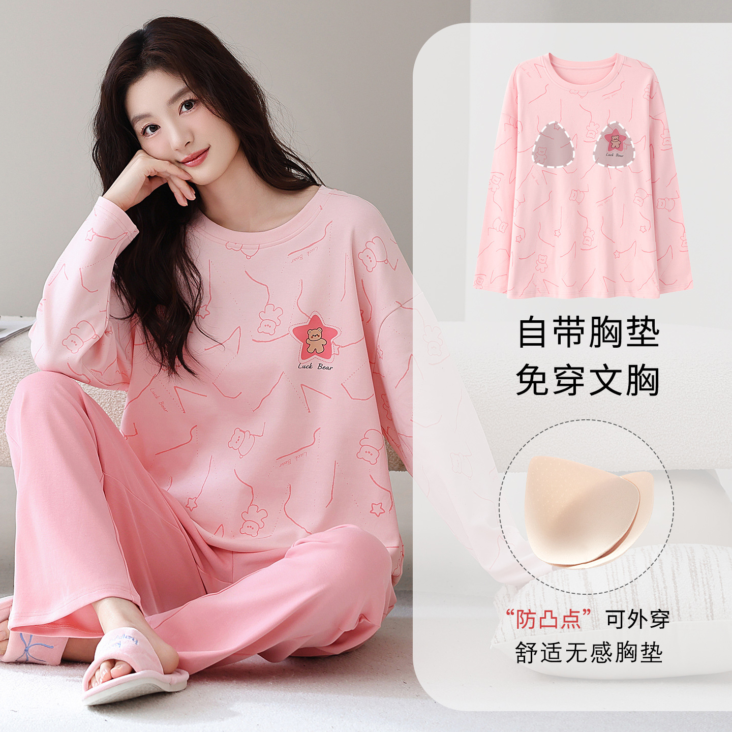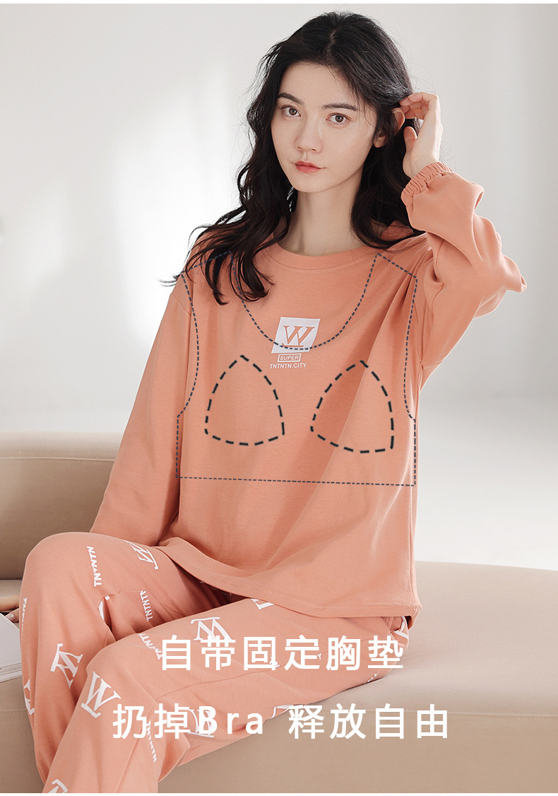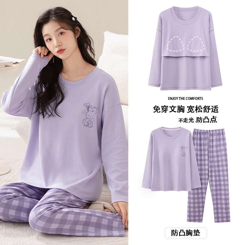 100%纯棉睡衣秋冬款女士卡通休闲薄款带胸垫可外穿家居服春秋套装
