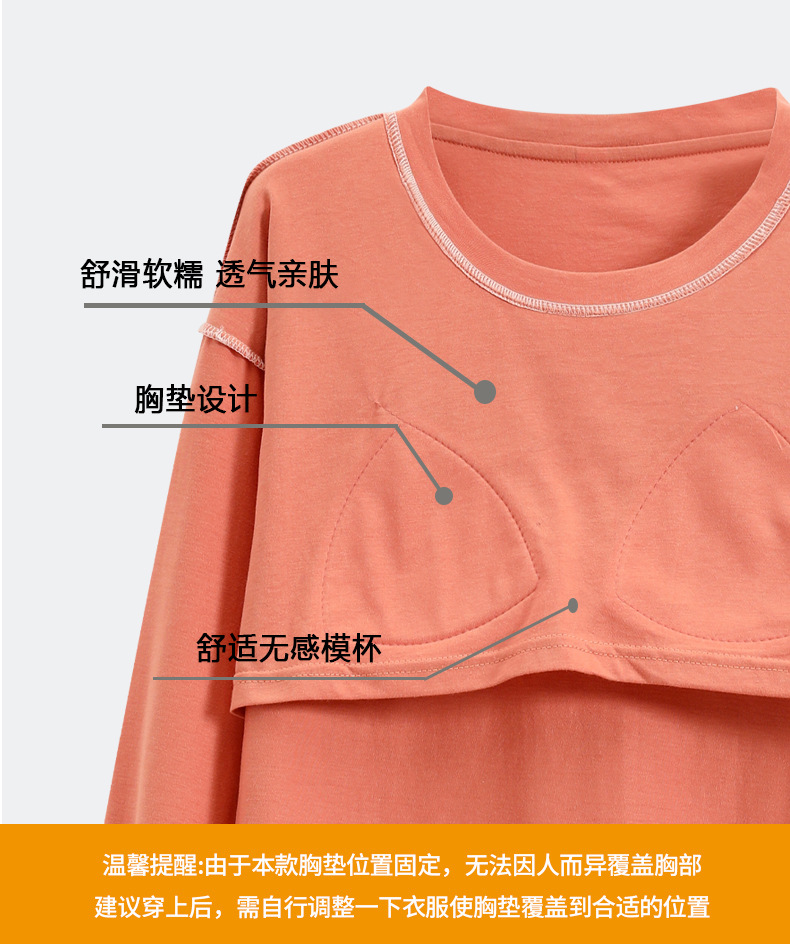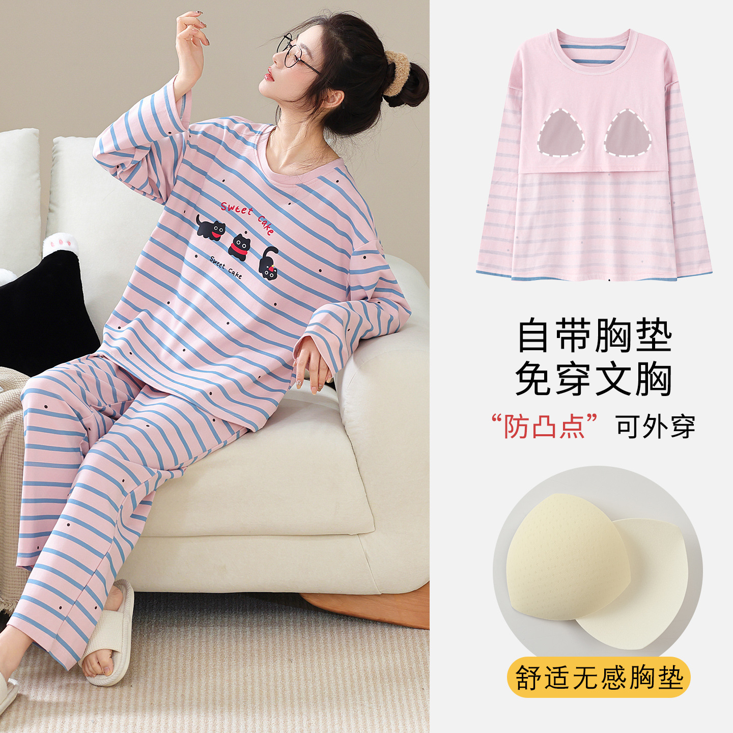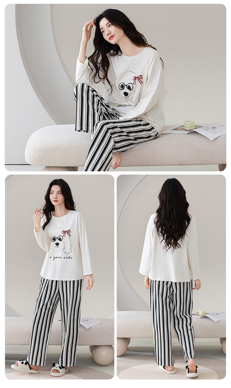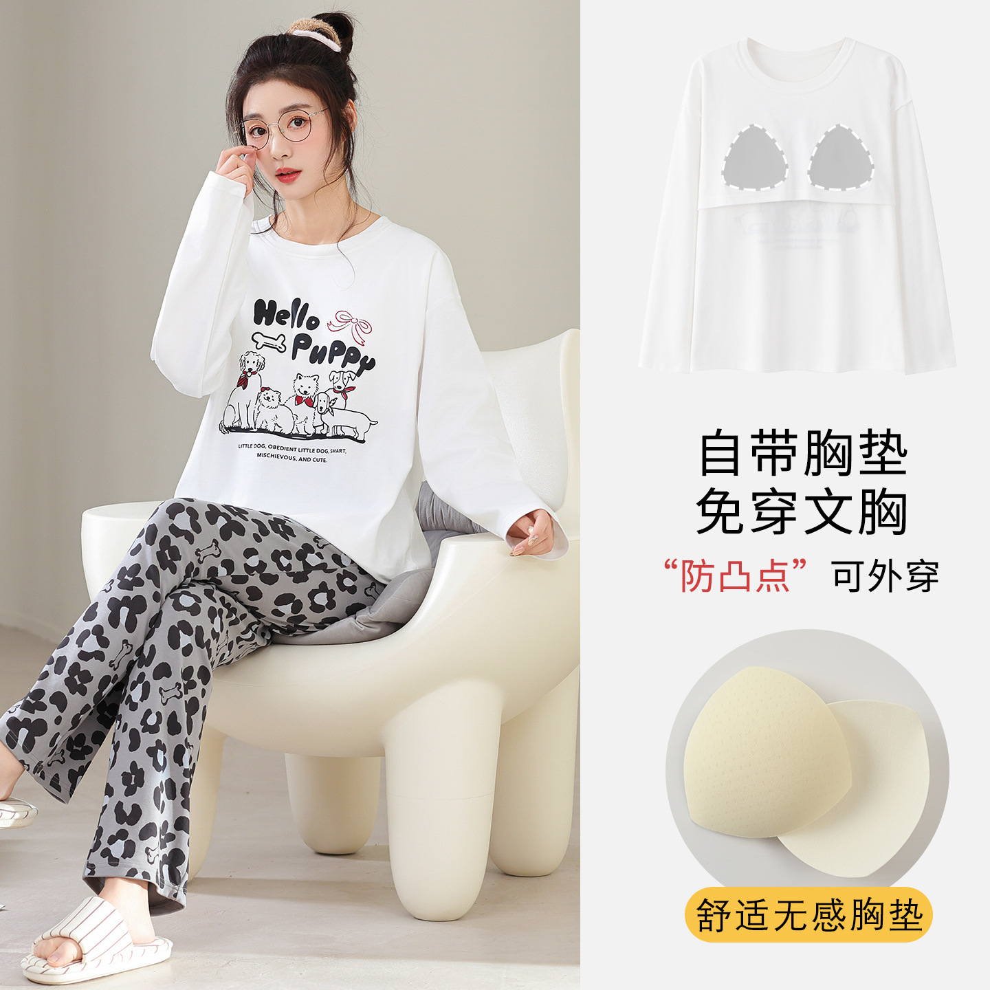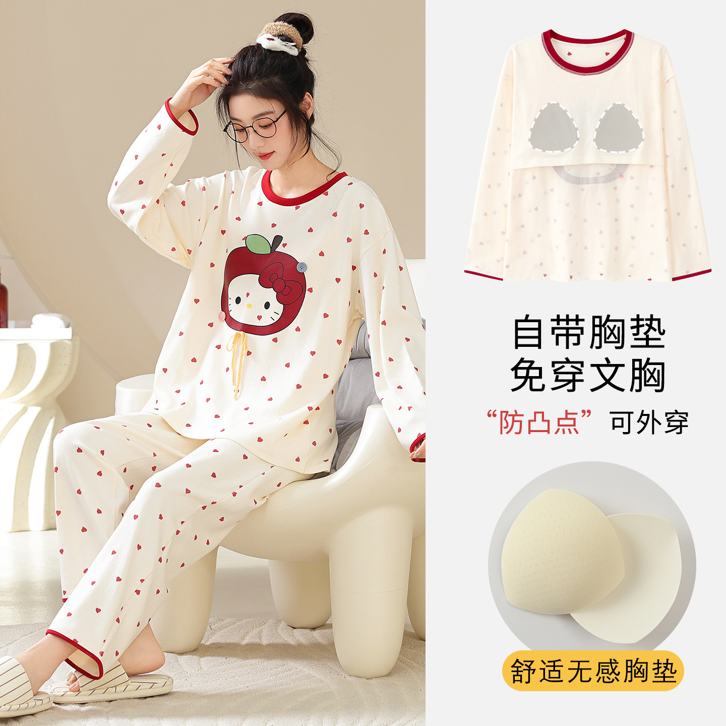 100%纯棉睡衣秋冬款女士卡通休闲薄款带胸垫可外穿家居服春秋套装