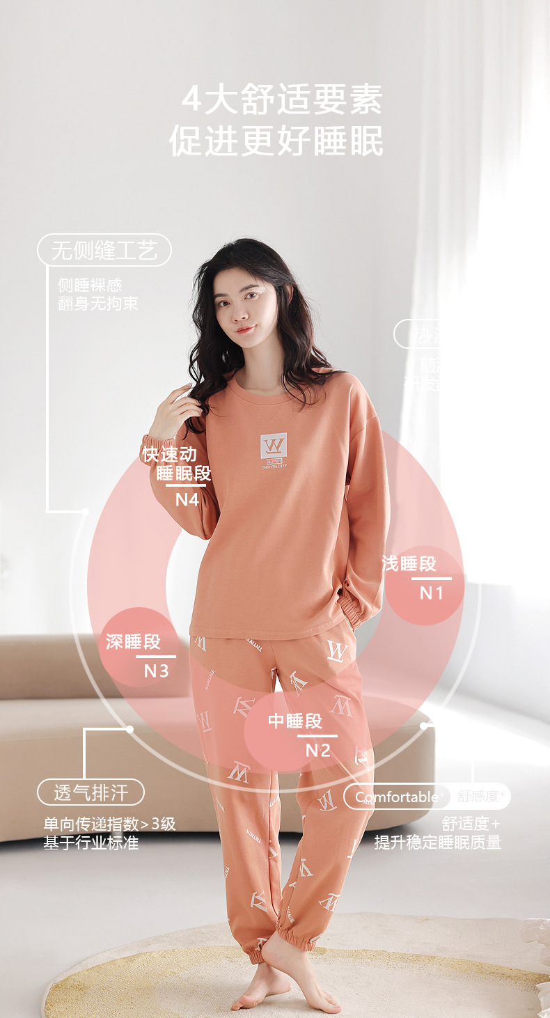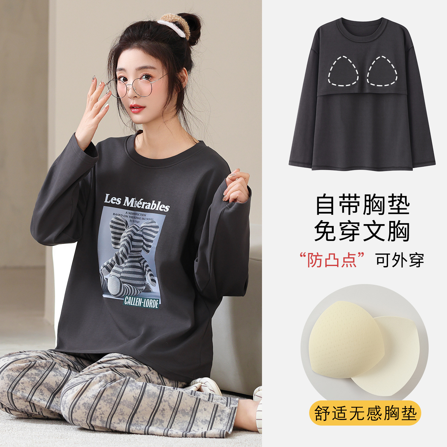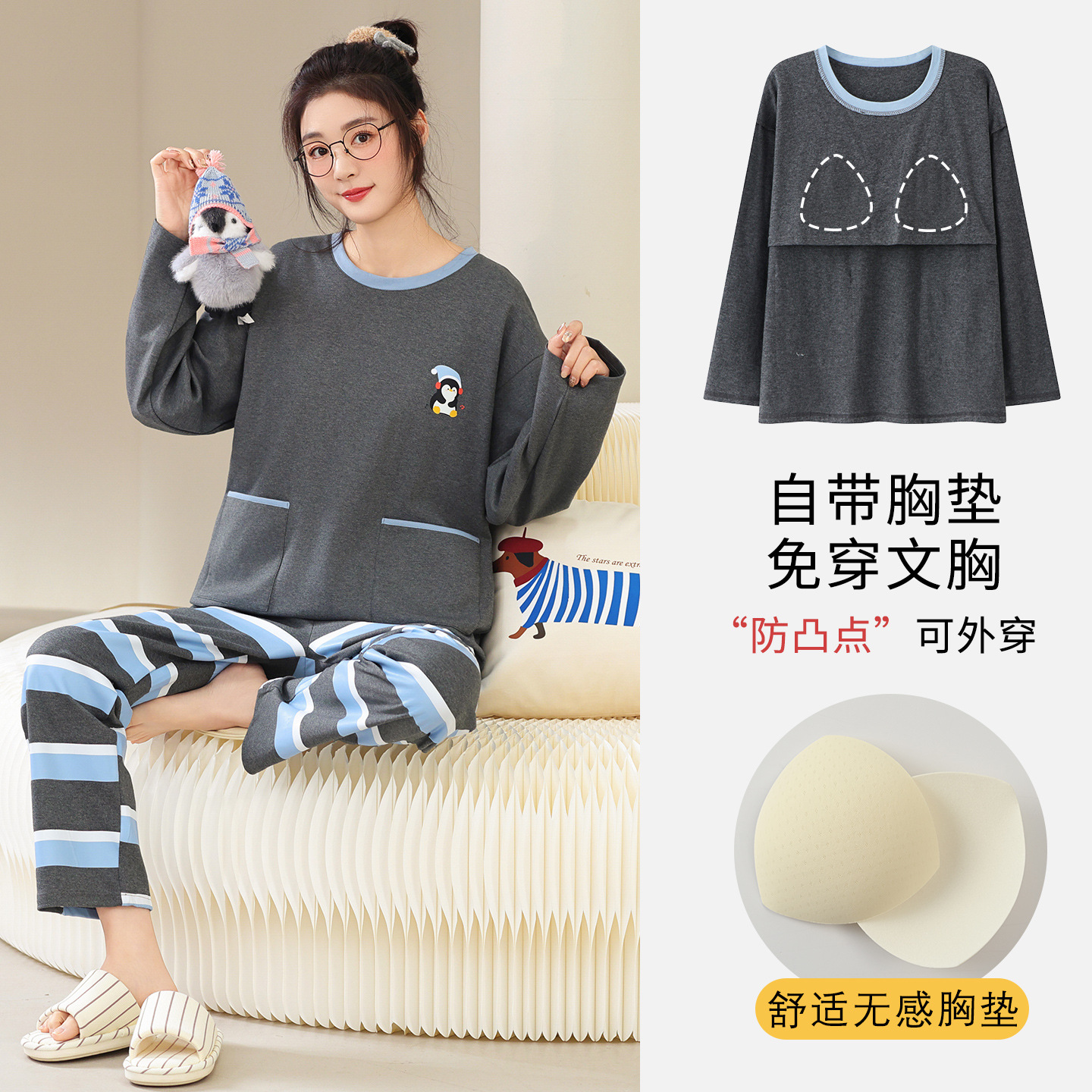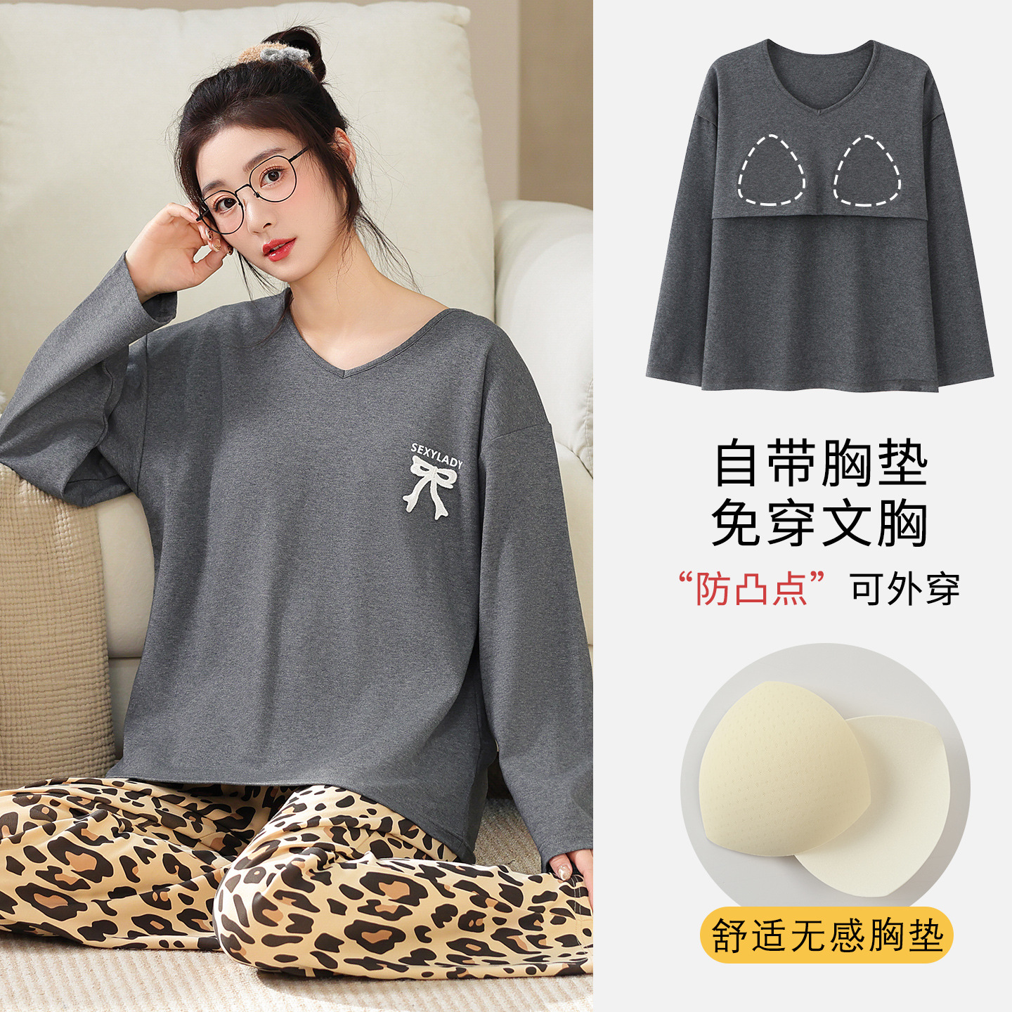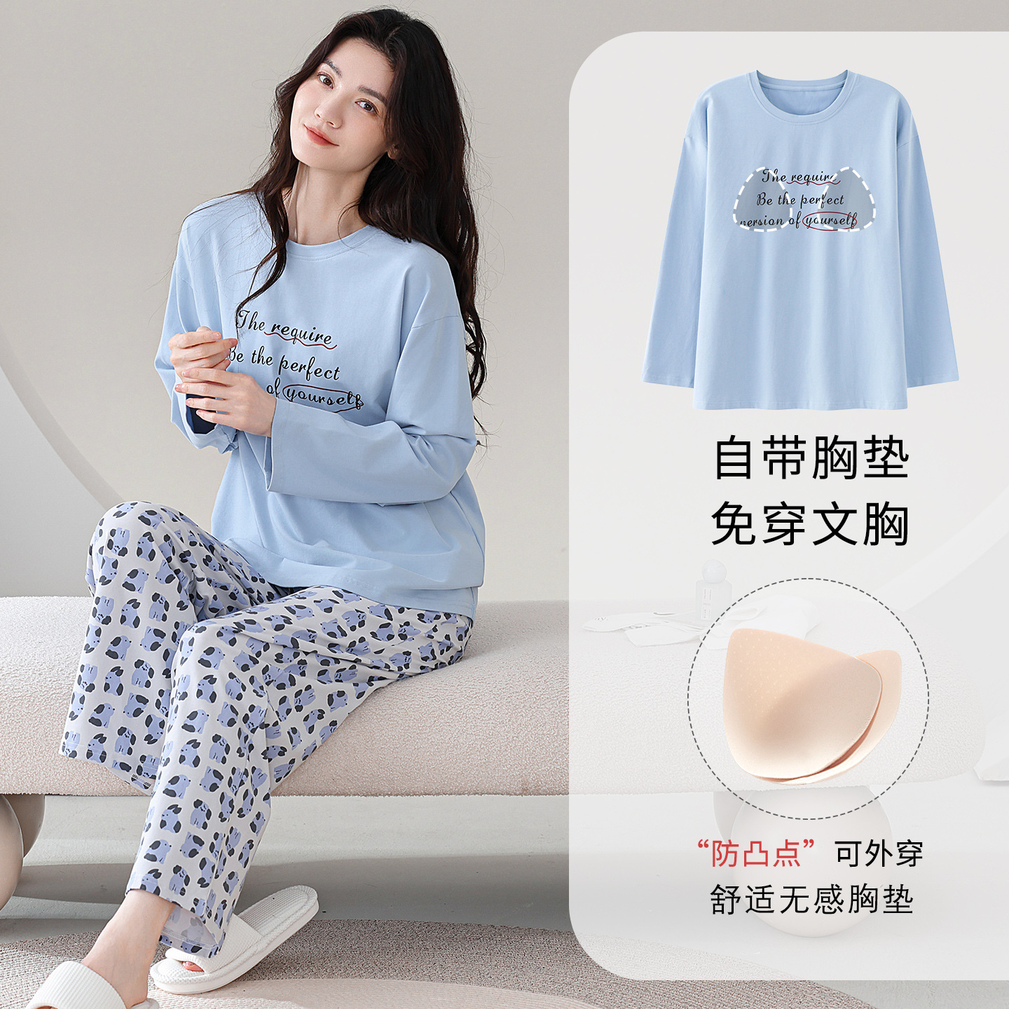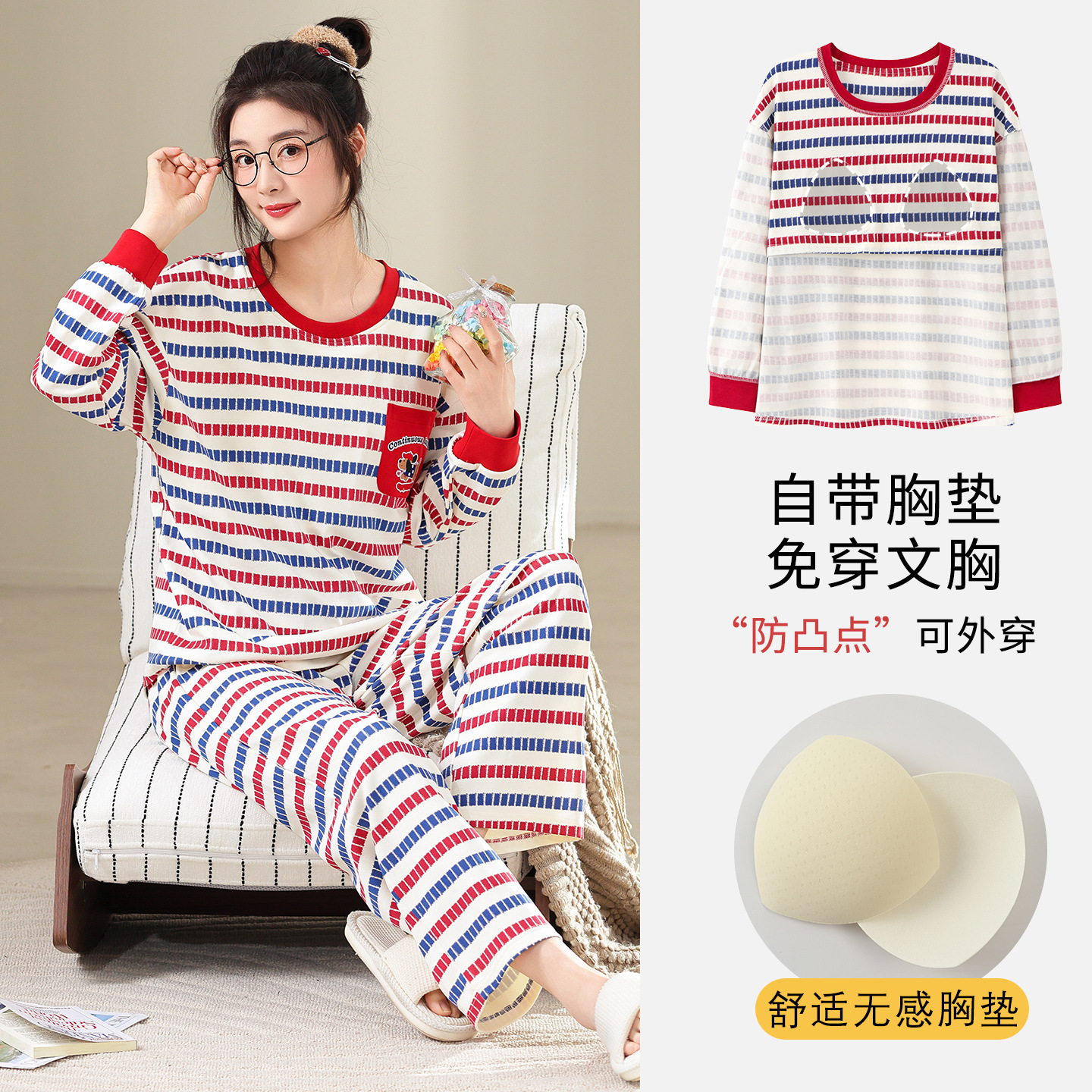 100%纯棉睡衣秋冬款女士卡通休闲薄款带胸垫可外穿家居服春秋套装