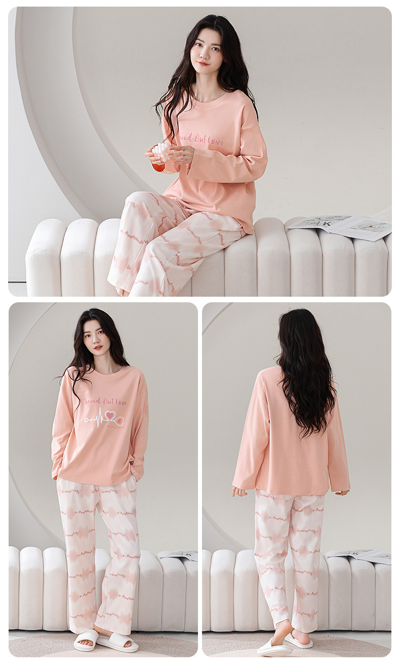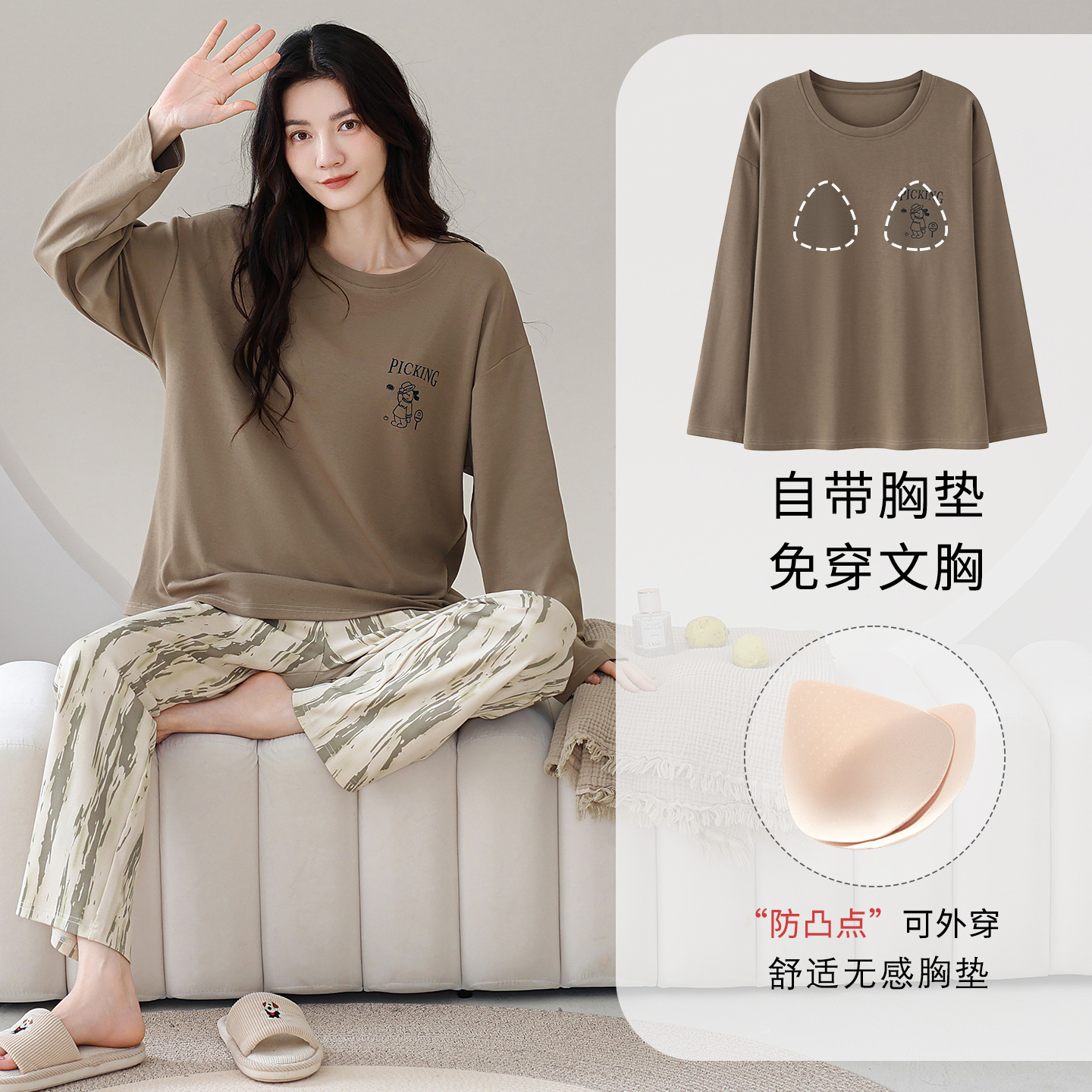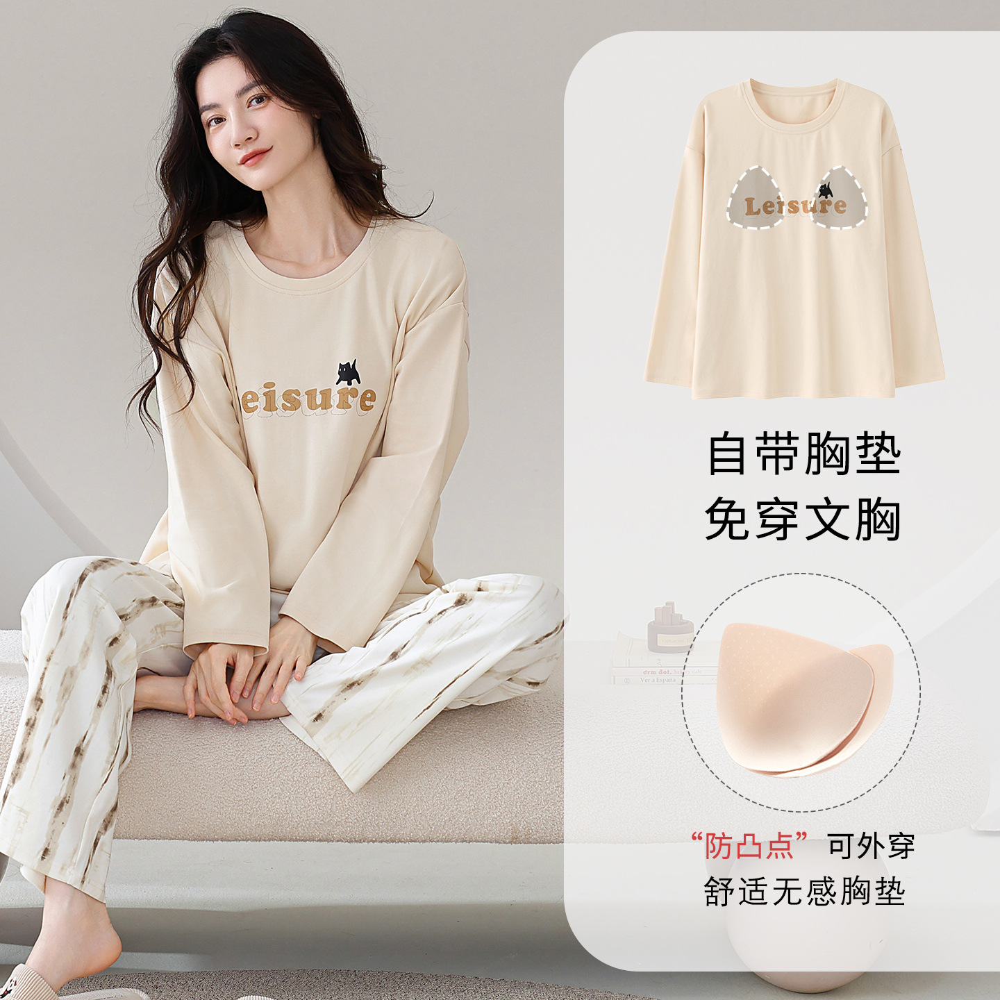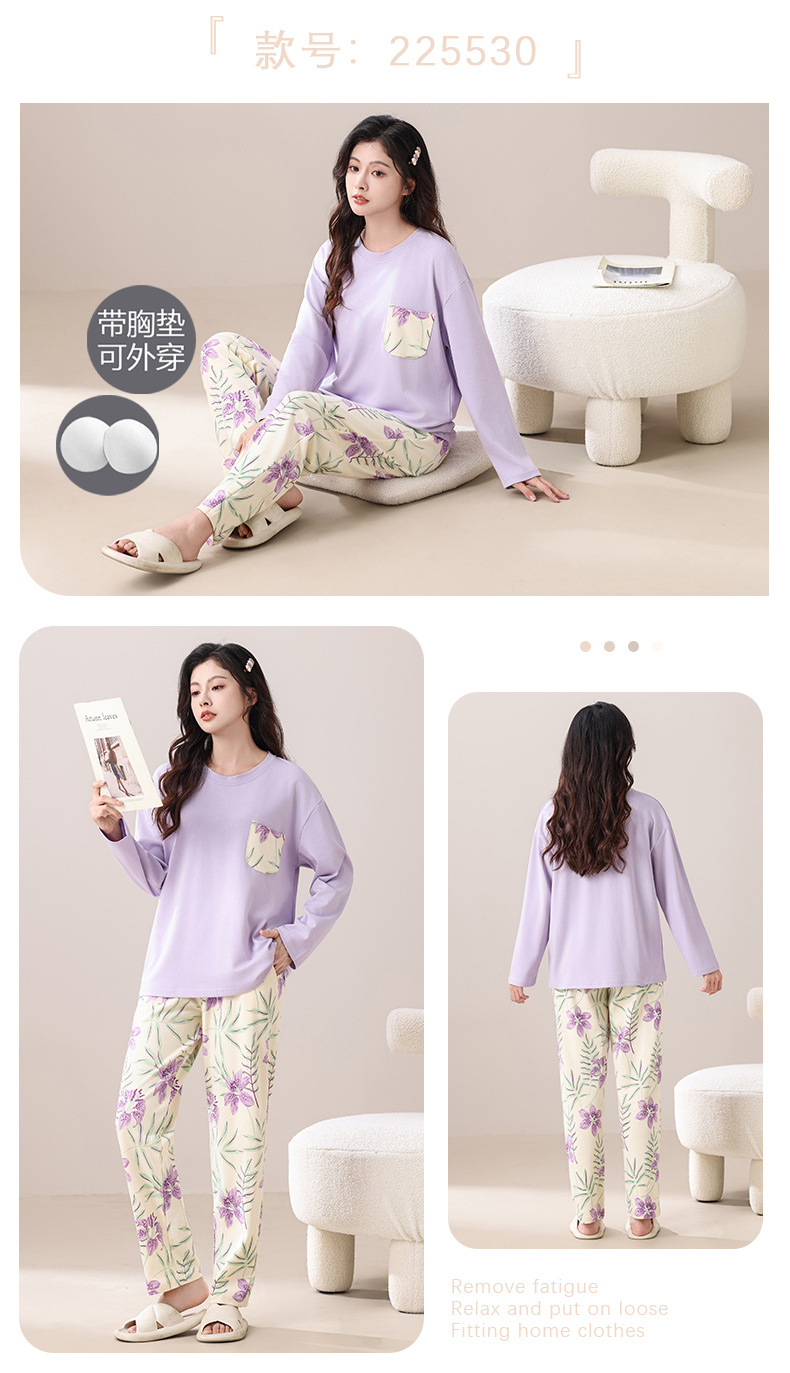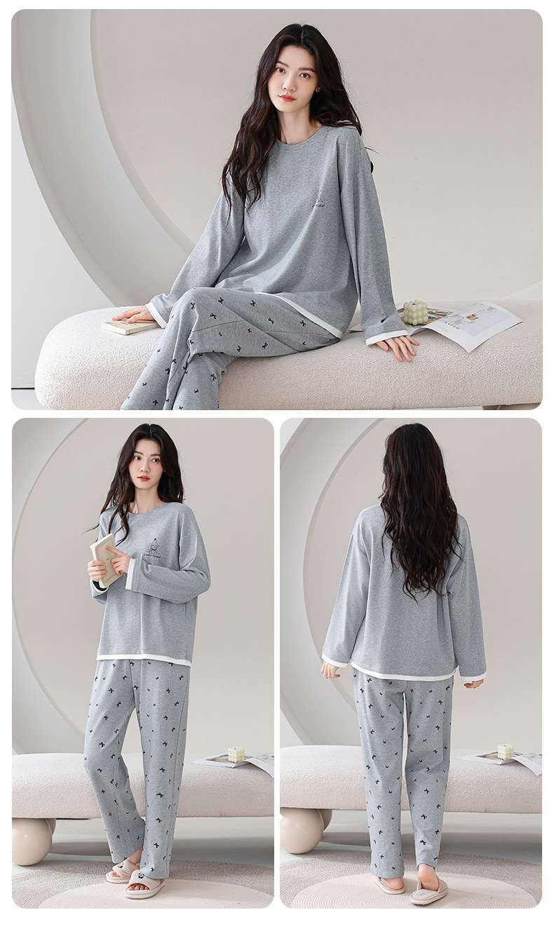 100%纯棉睡衣秋冬款女士卡通休闲薄款带胸垫可外穿家居服春秋套装