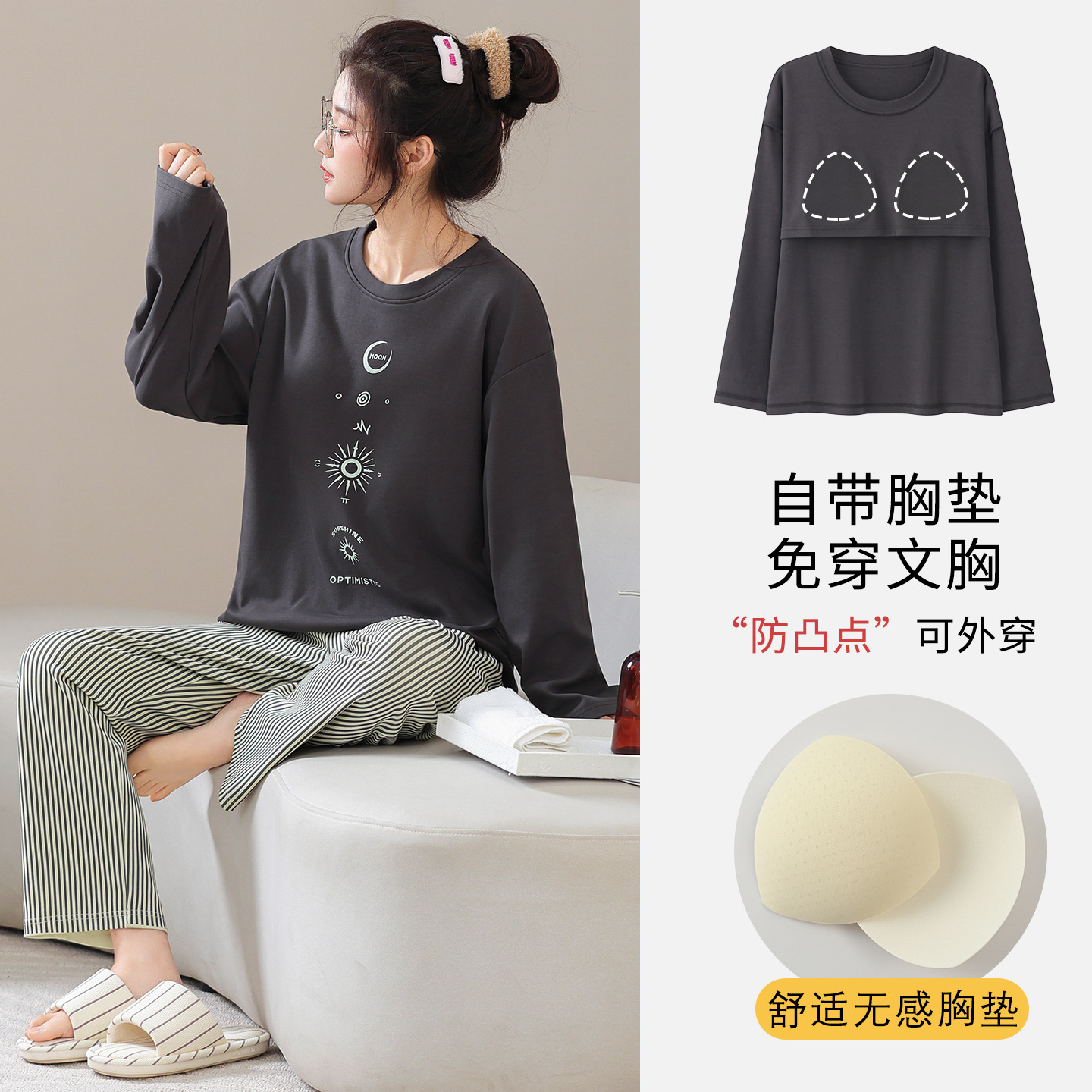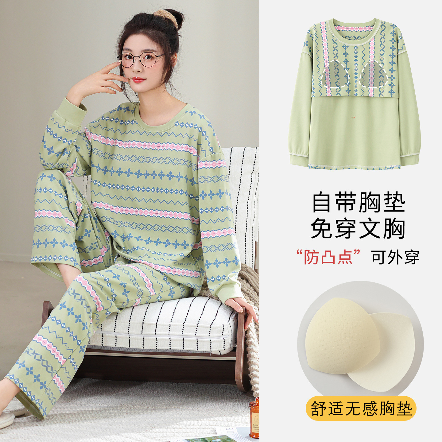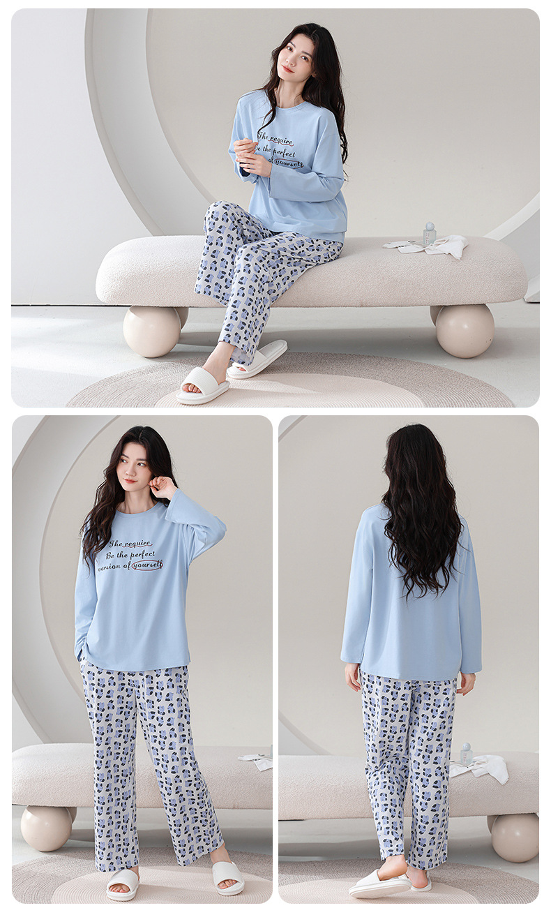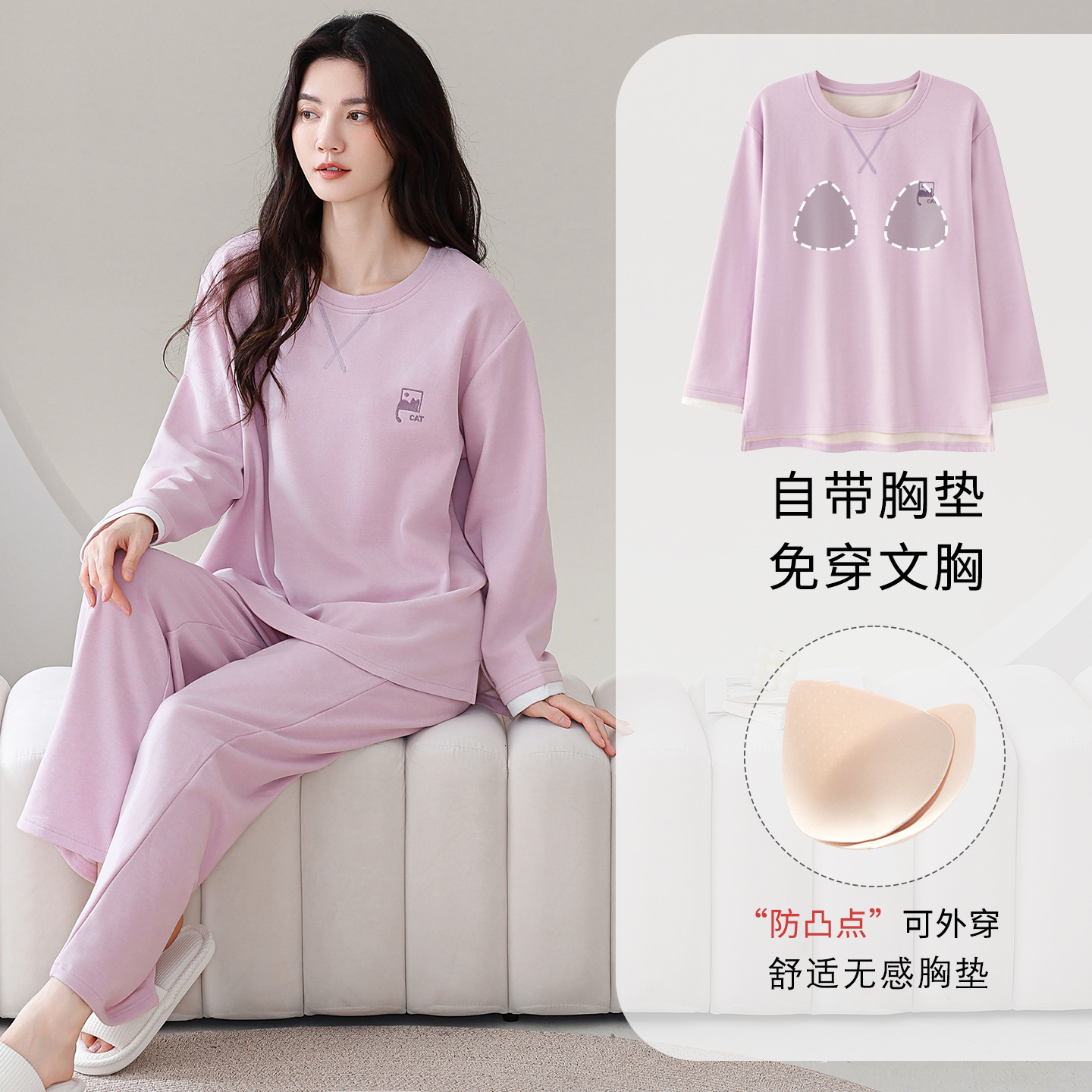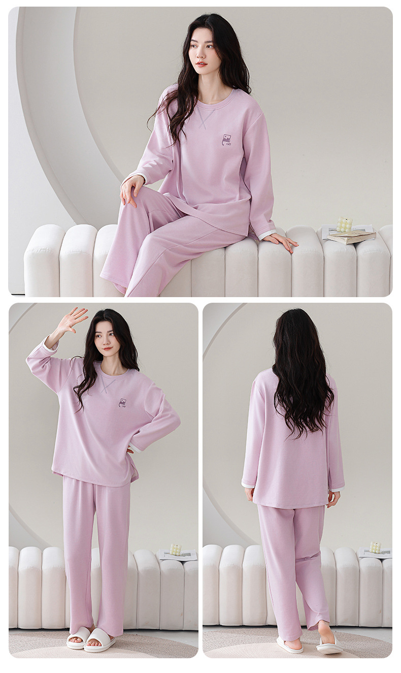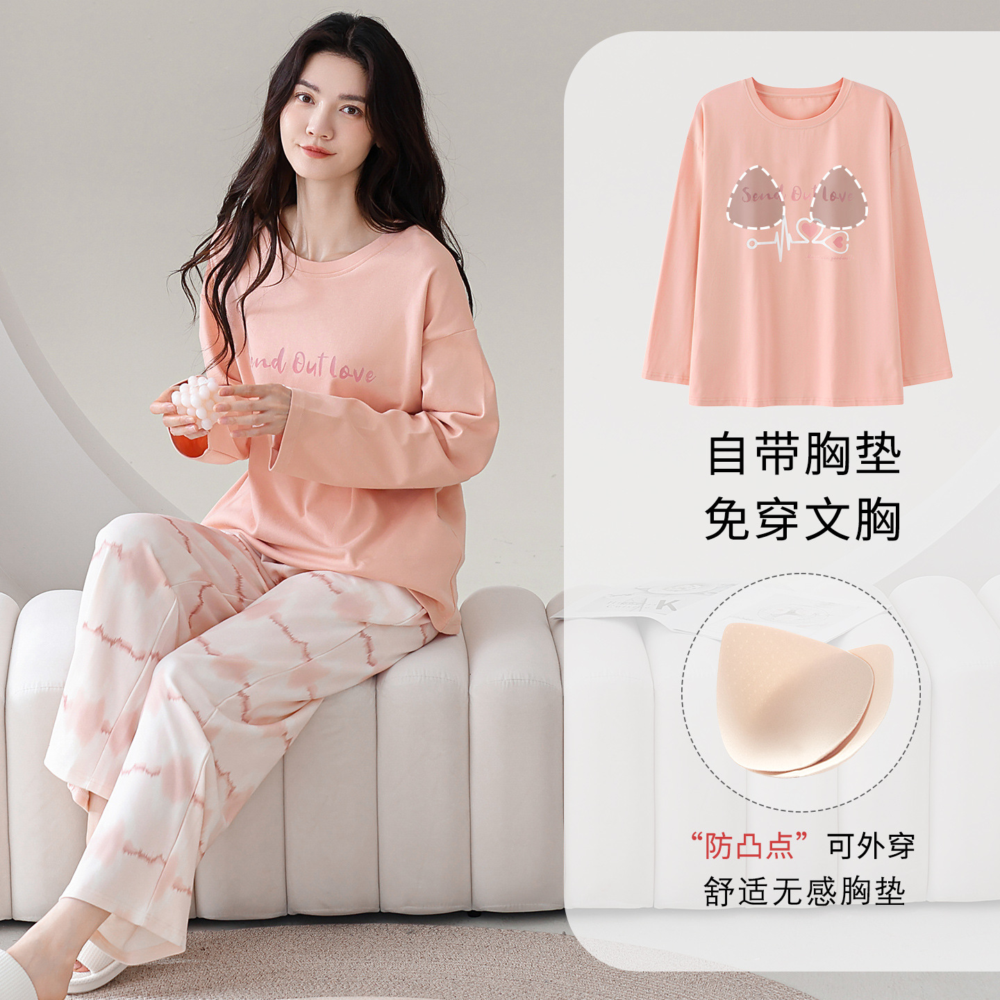 100%纯棉睡衣秋冬款女士卡通休闲薄款带胸垫可外穿家居服春秋套装