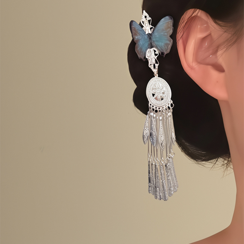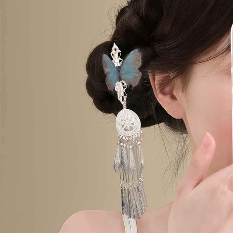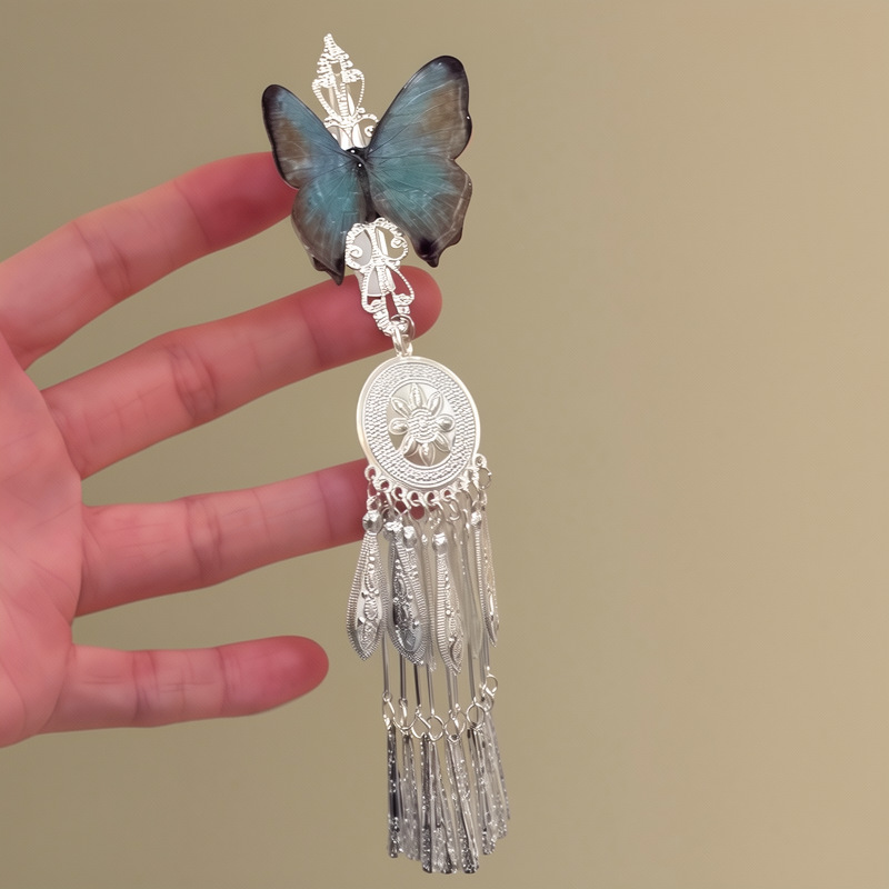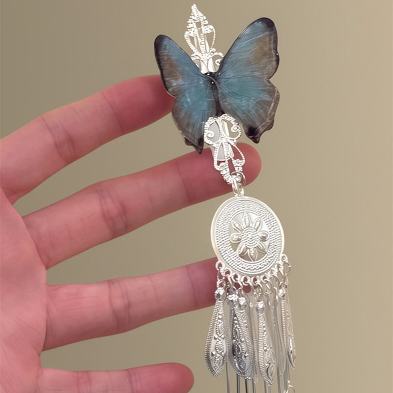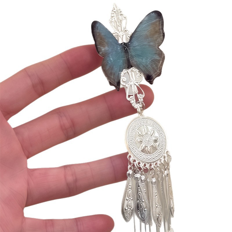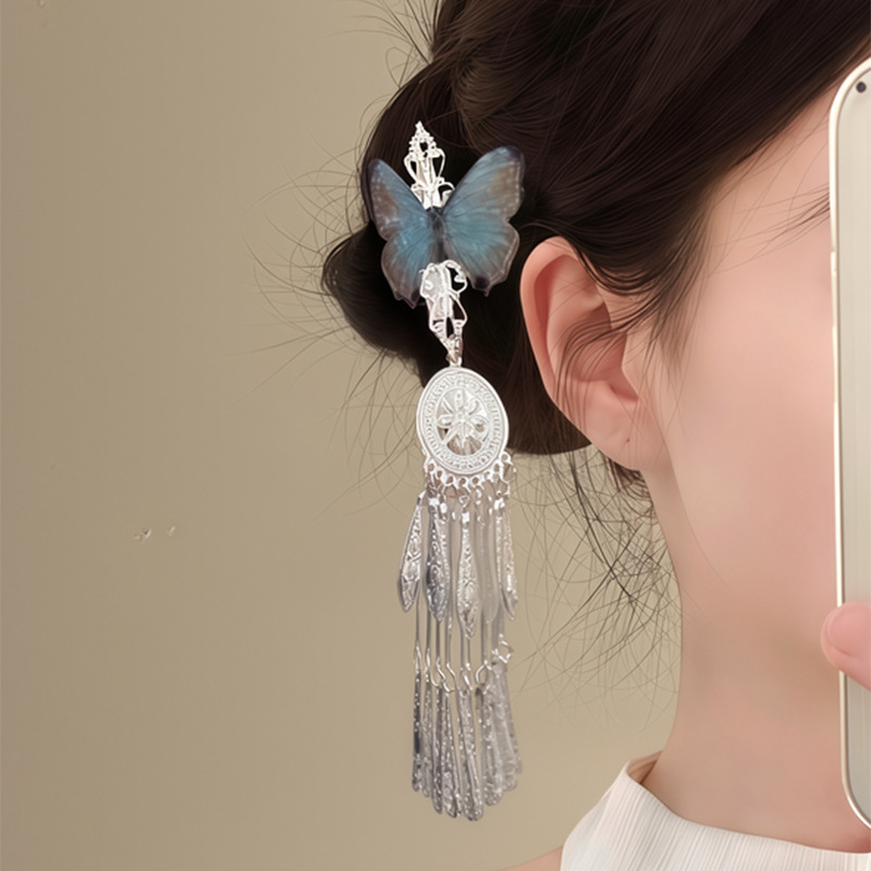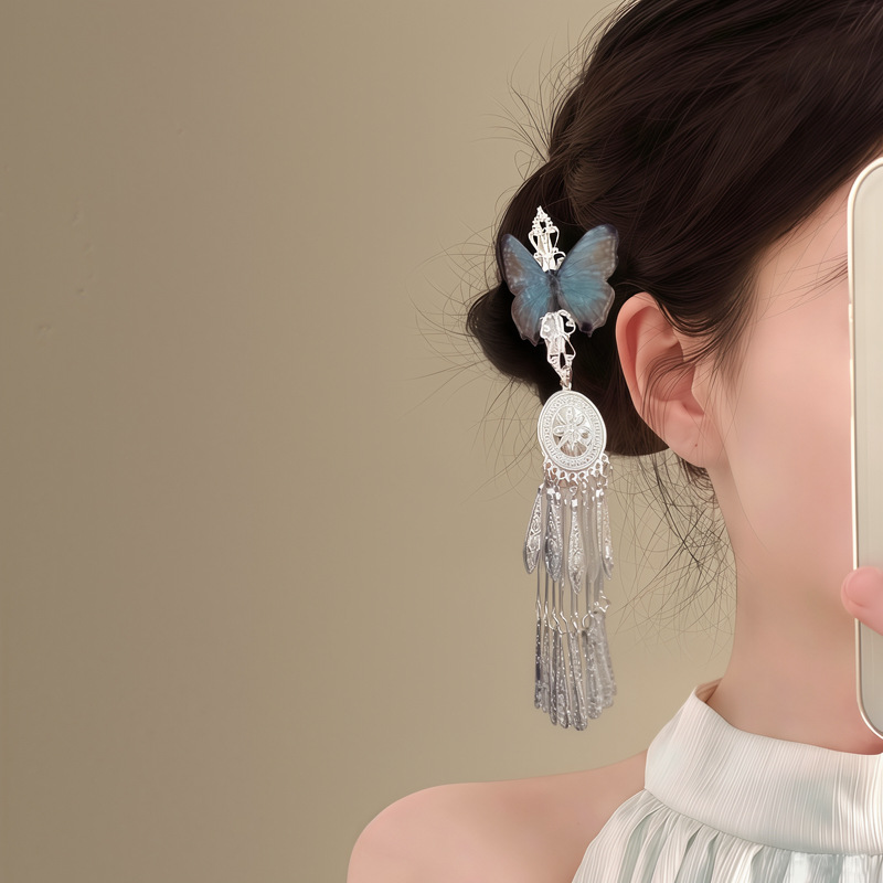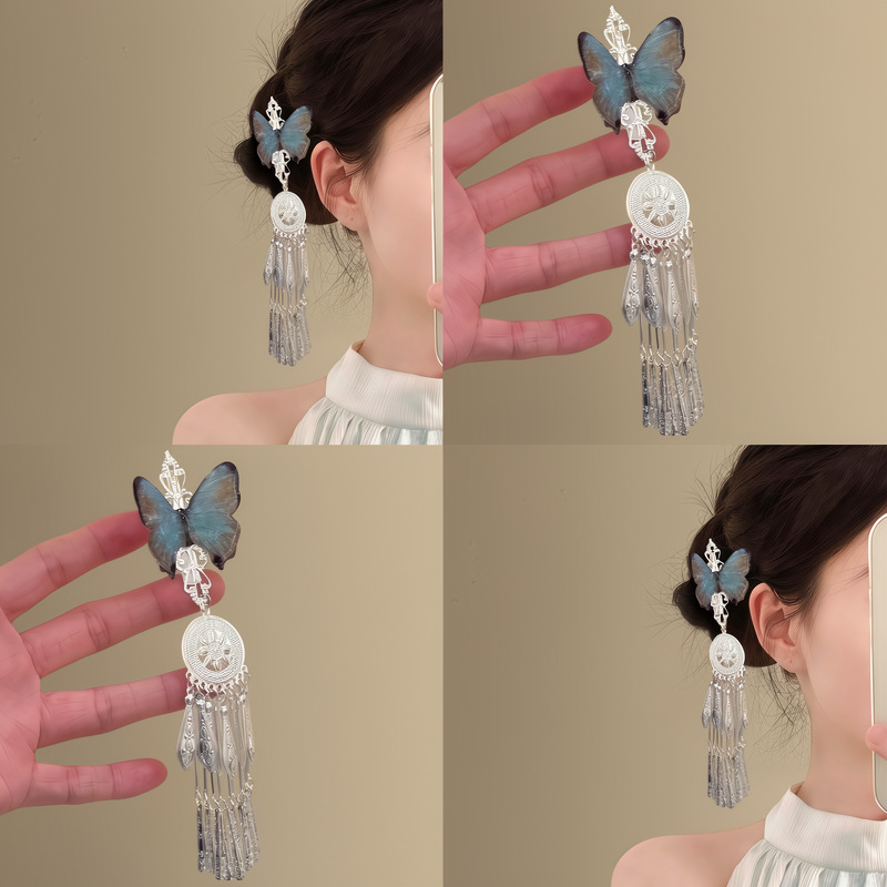 「雨霖铃」新中式蓝色蝴蝶流苏发夹女清冷感国风复古精致侧边发饰