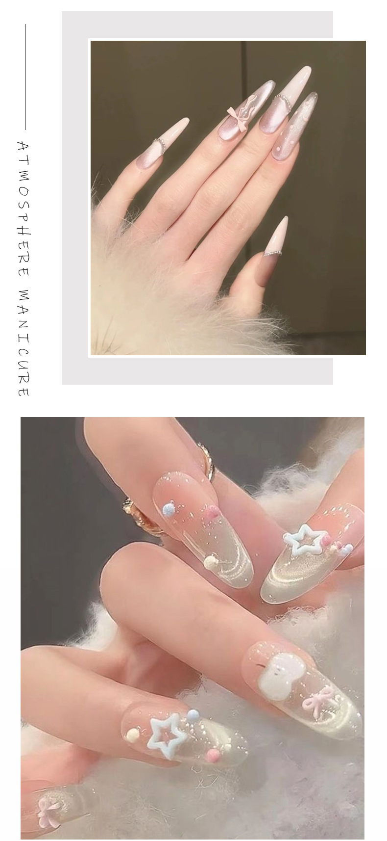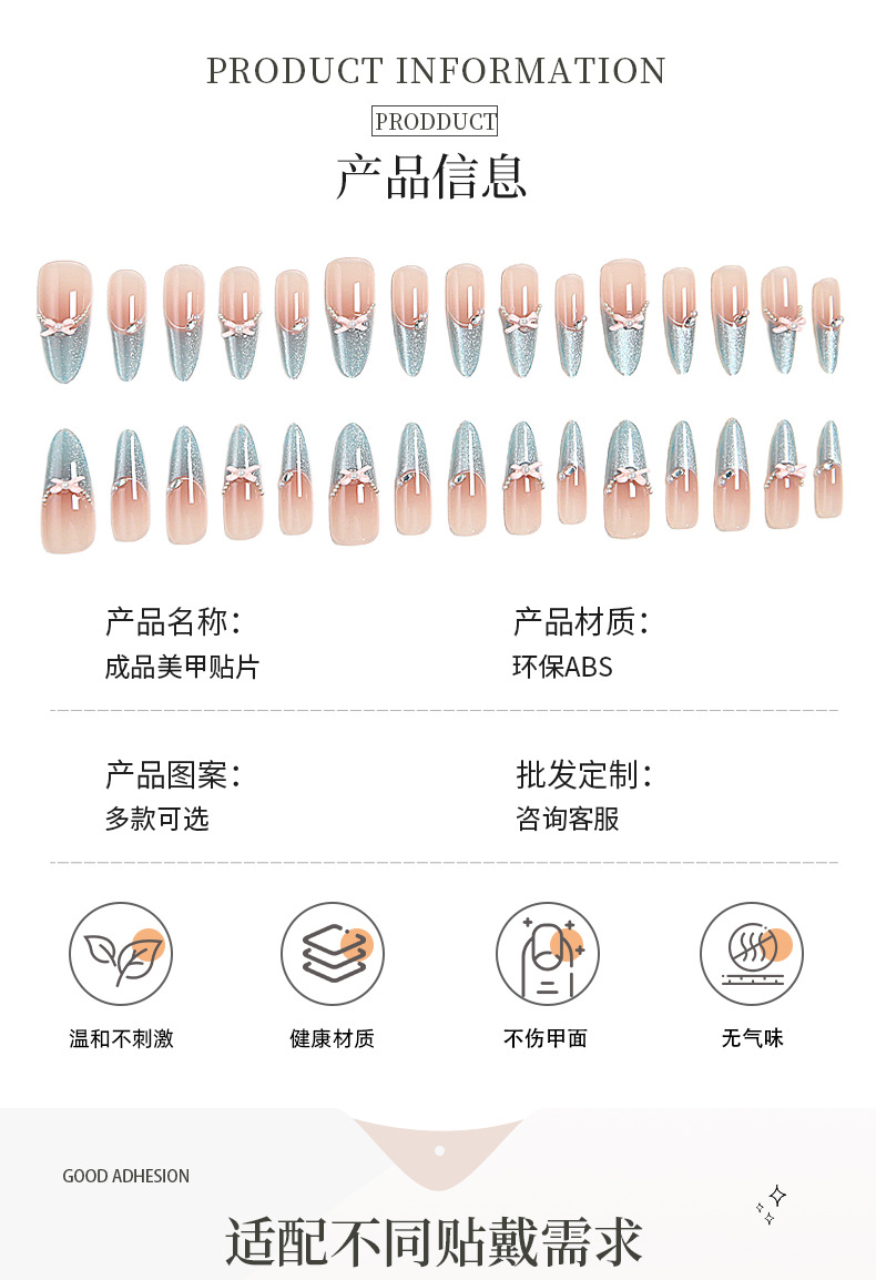 夏日爆款手工穿戴甲海盐蓝精灵猫眼法式珍珠蝴蝶结美甲氛围感甲片