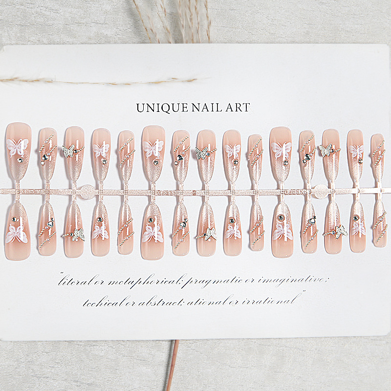 抖音爆款手工穿戴甲渐变链条法式猫眼美甲立体浮雕碎钻蝴蝶指甲贴