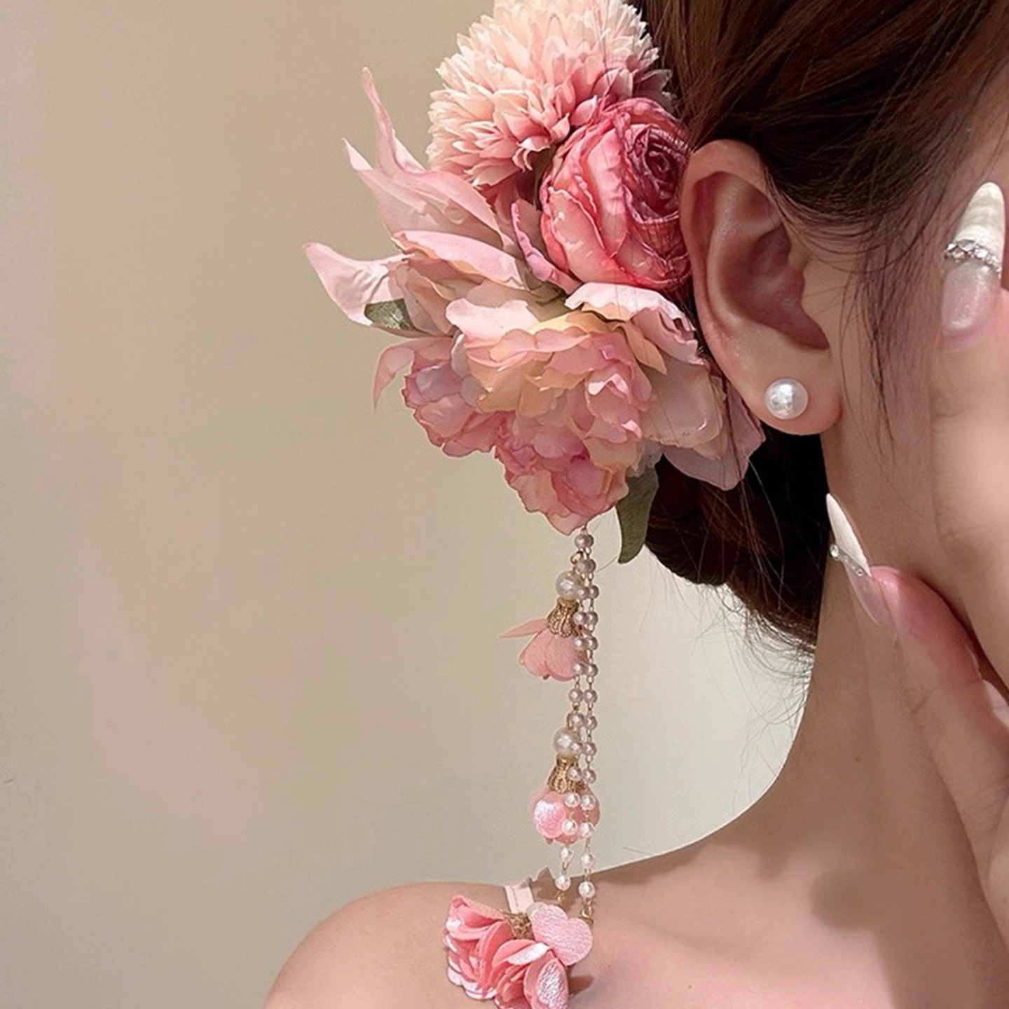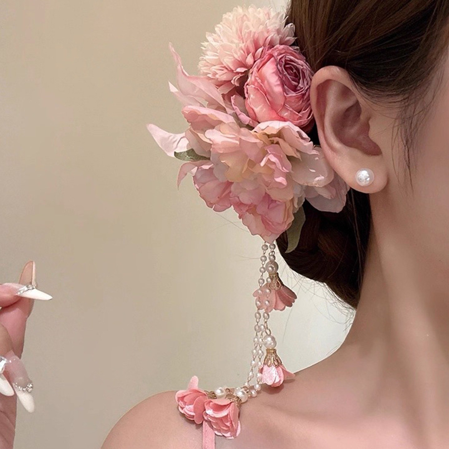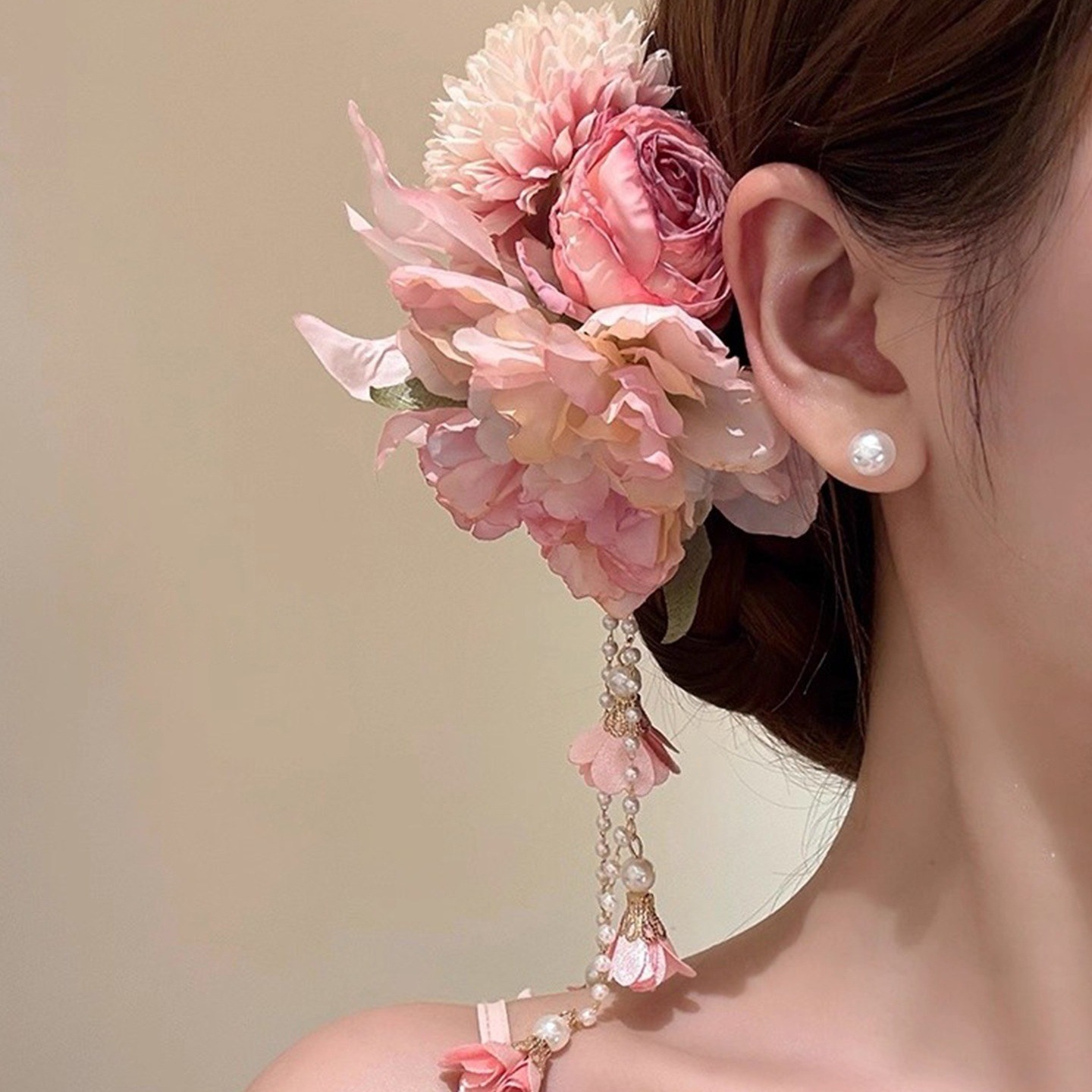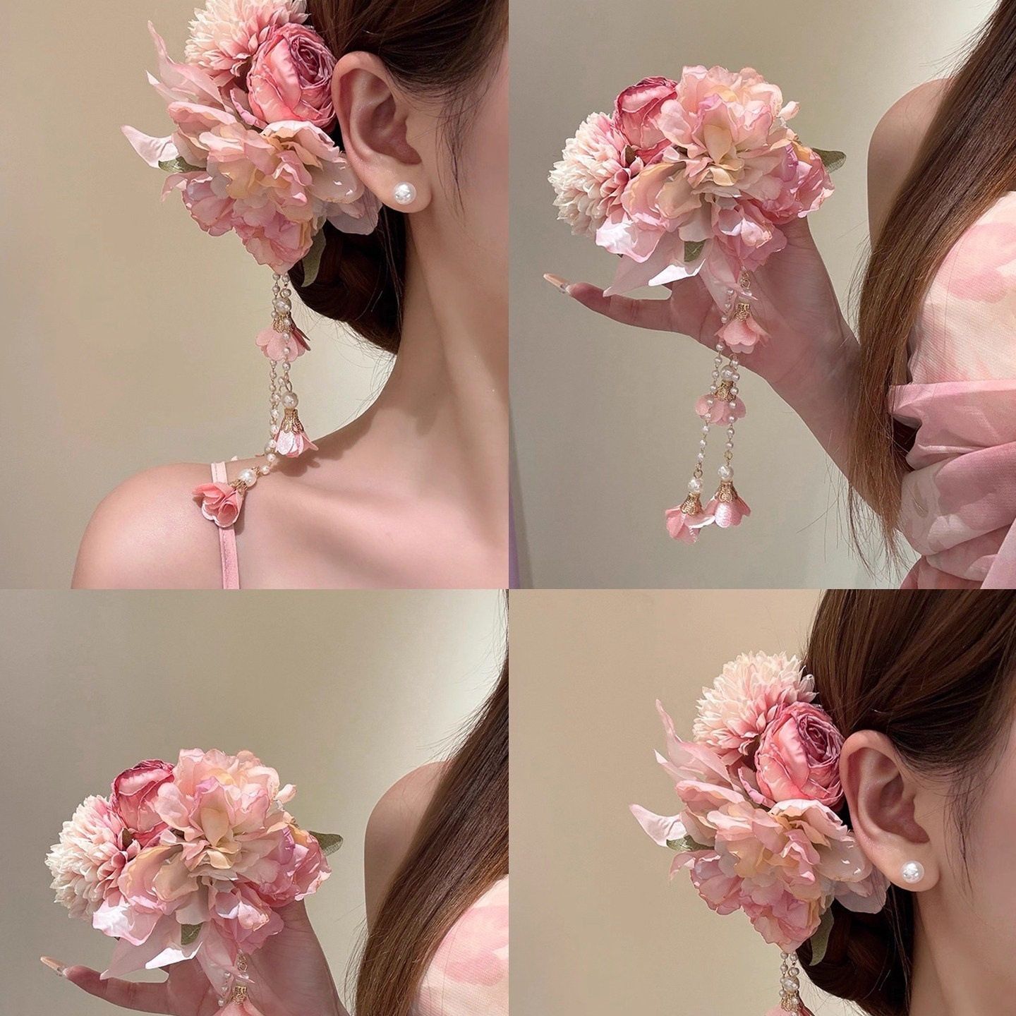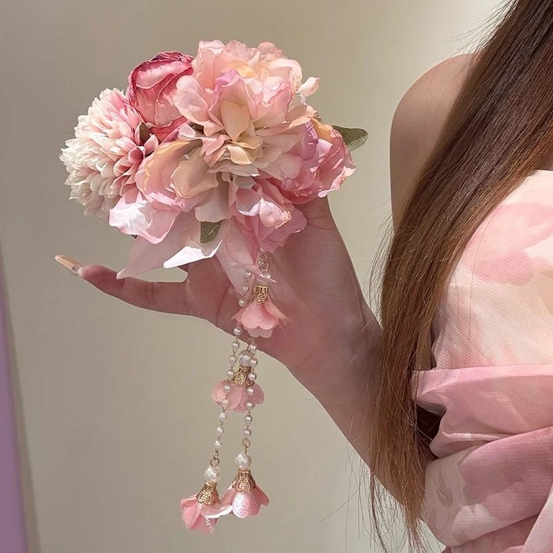粉欲缪斯!超仙粉色流苏花朵发夹女旗袍侧边夹发卡海边发饰头饰女