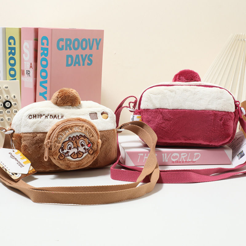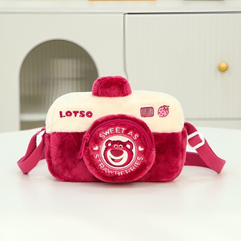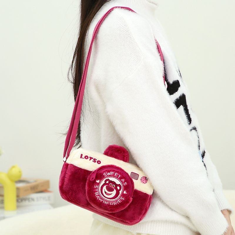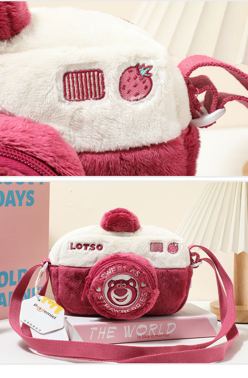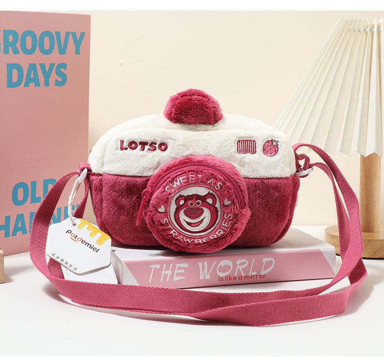 跨境相机包毛绒包包复古草莓熊毛绒斜挎包毛绒公仔单肩包女卡通包