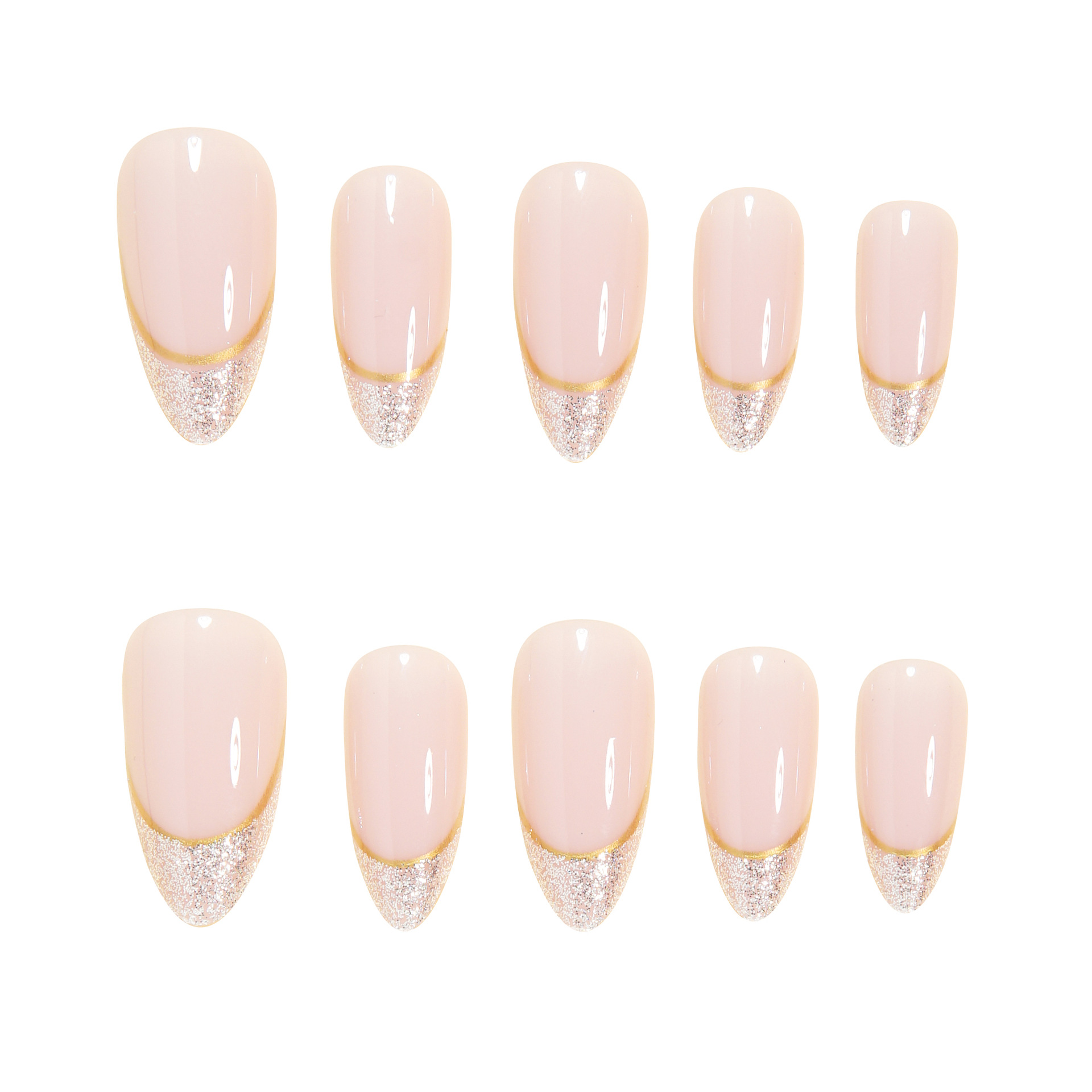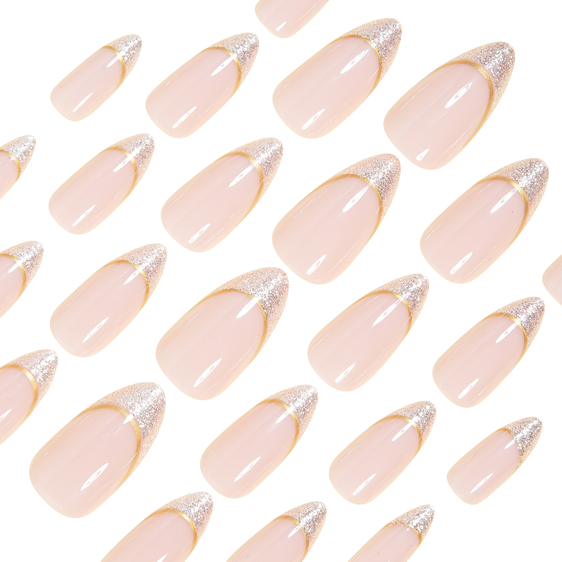 跨境杏仁甲经典百搭闪亮闪粉假指甲光泽亮面金色条纹法式穿戴甲