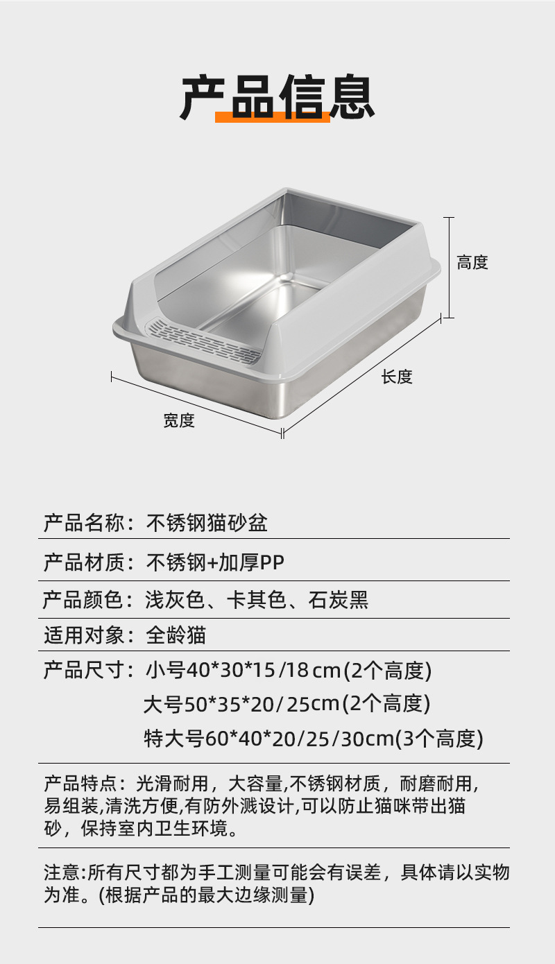 不锈钢半封闭猫砂盆顶入式带盖子防外溅不锈钢猫厕所高围栏宠物用