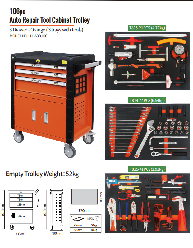 工厂专用106件通用汽修工具组套工具车推车3层抽屉