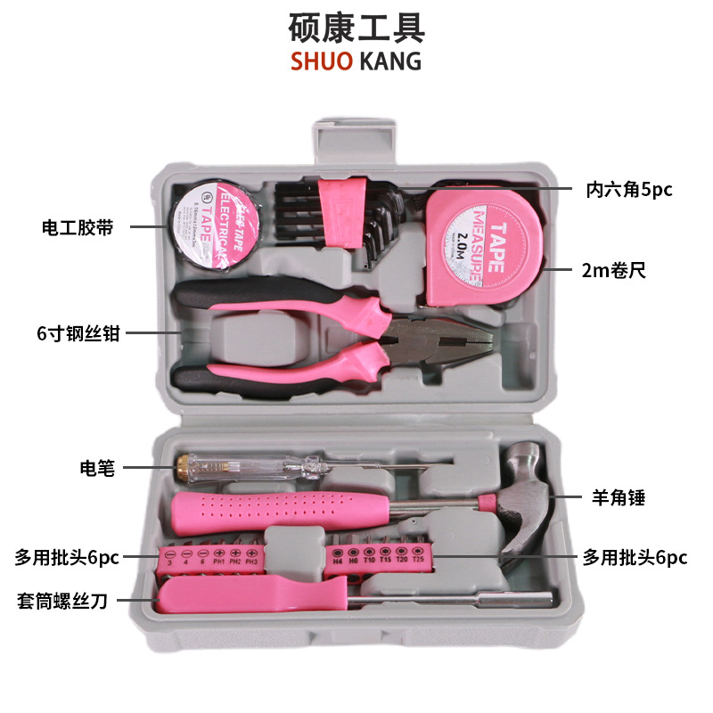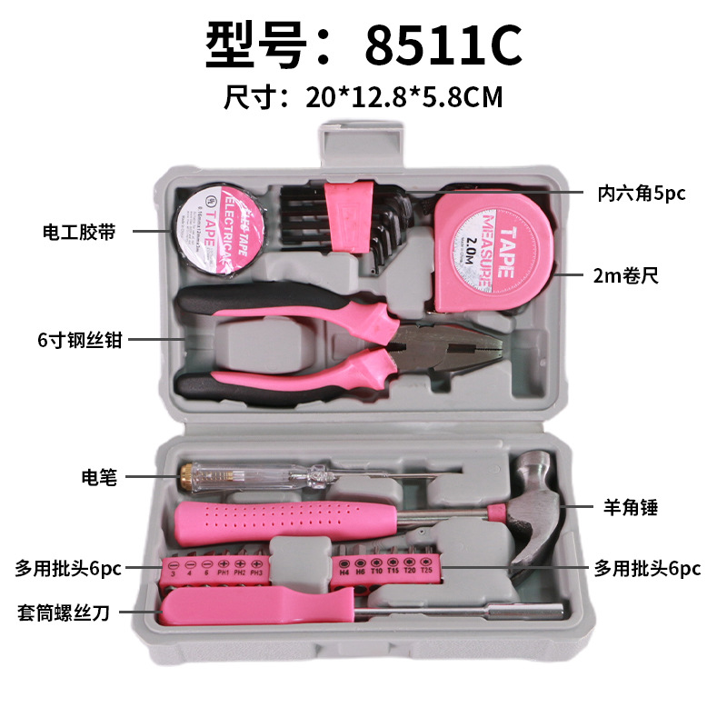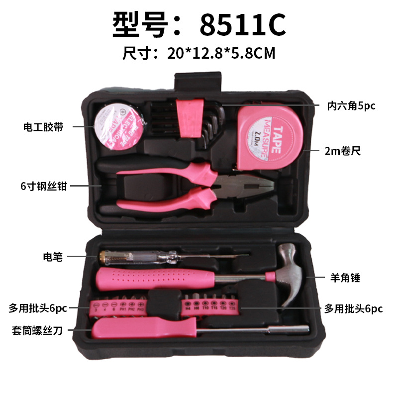 家庭工具组合套装五金工具箱多功能维修粉色组套箱包钳子扳手大全