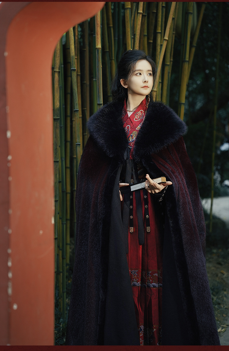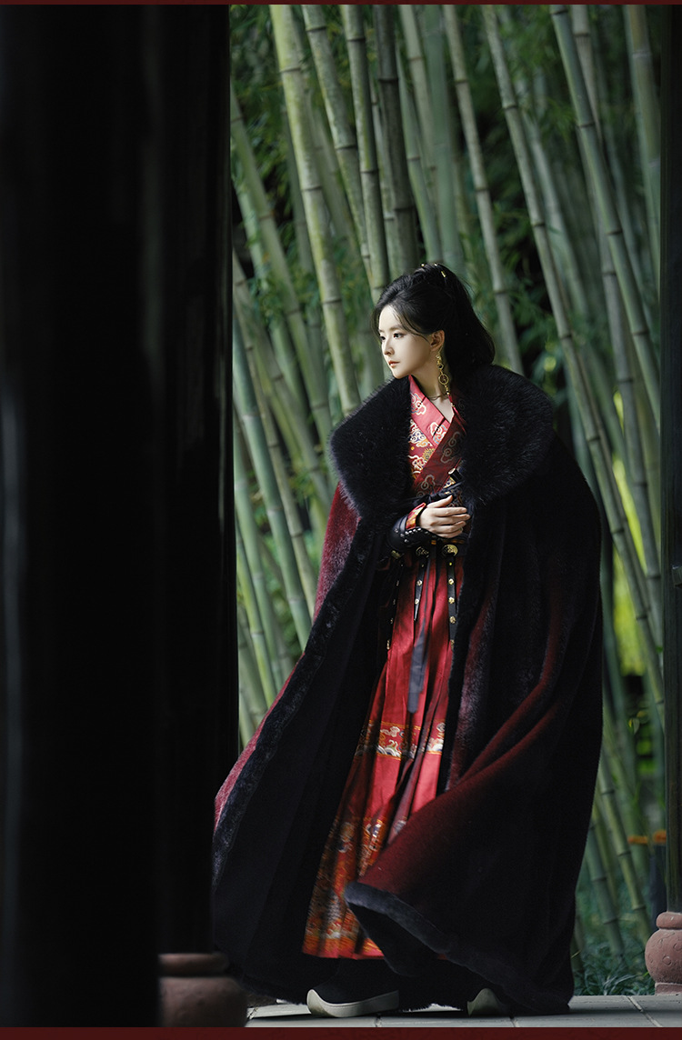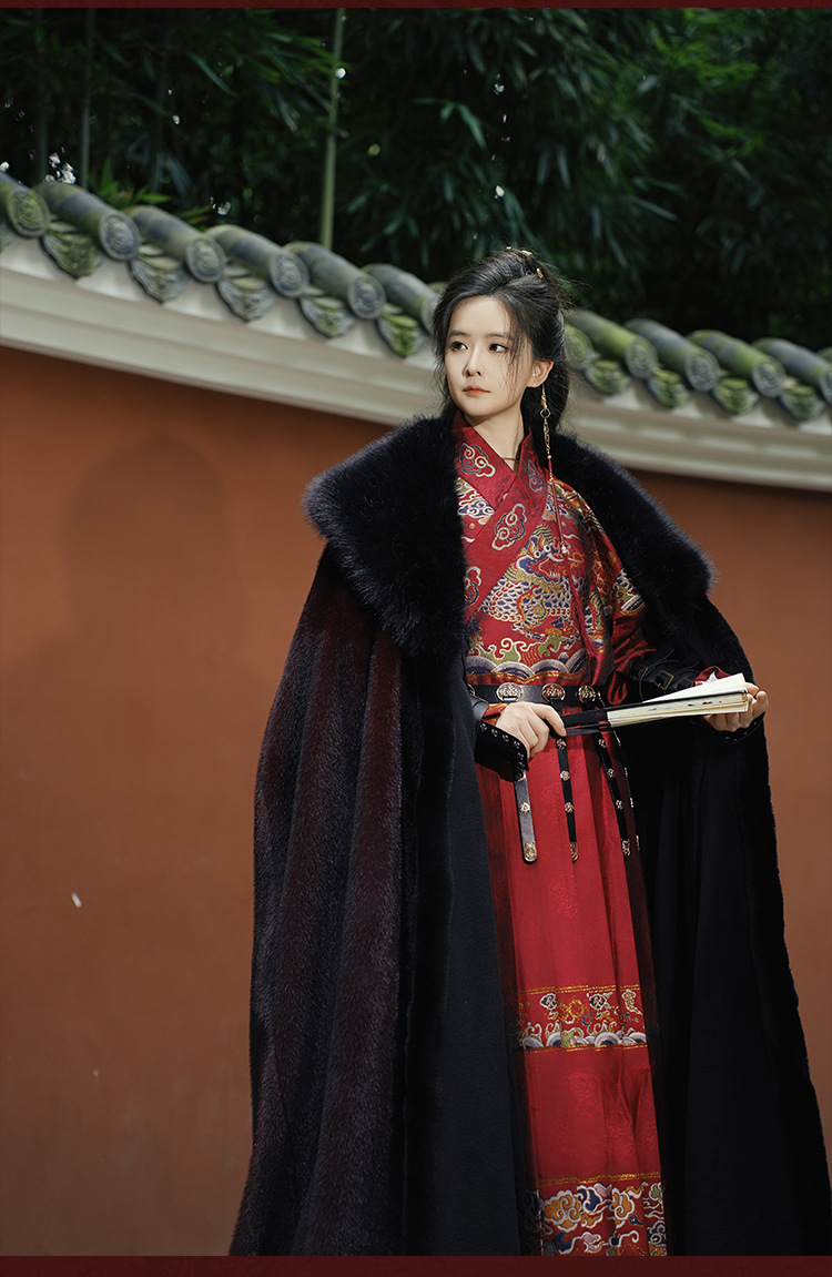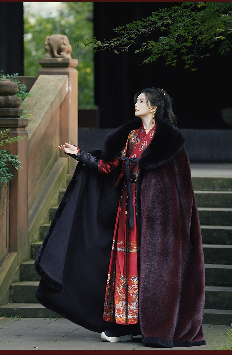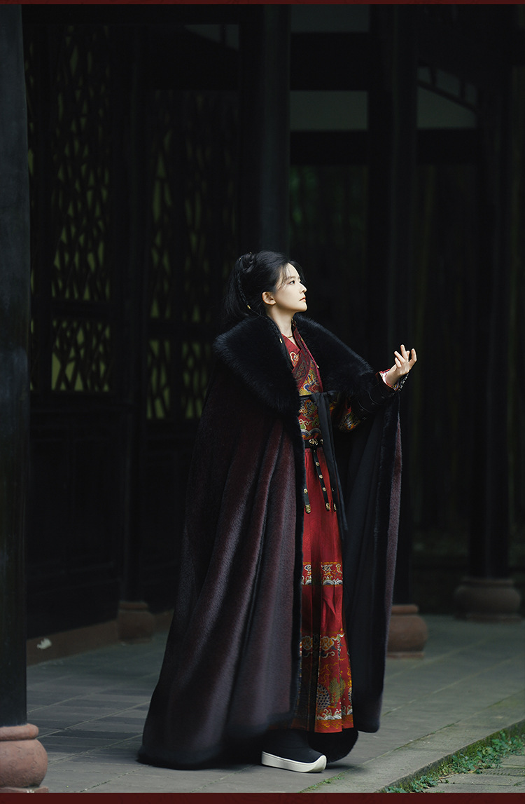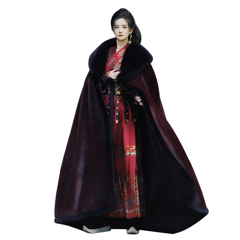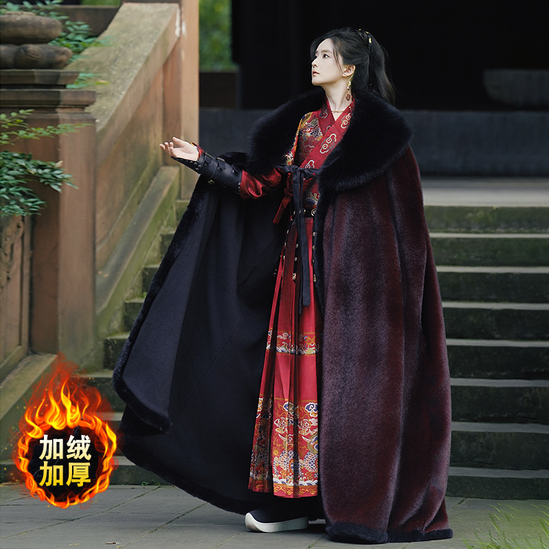 original hanfu brocade flying fish suit 2026 red new style cloak velvet-lined thicken big fur collar thermal long shawl