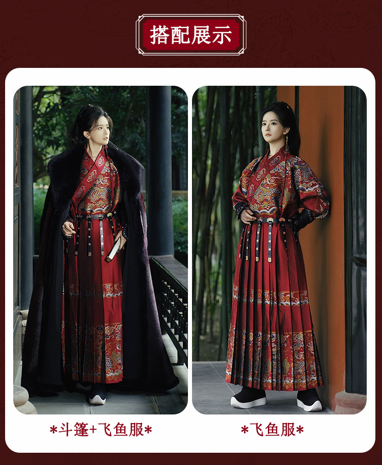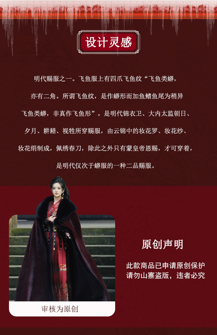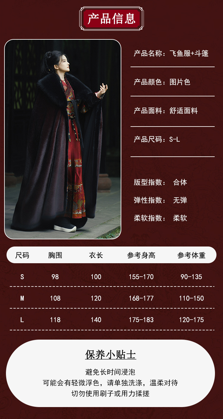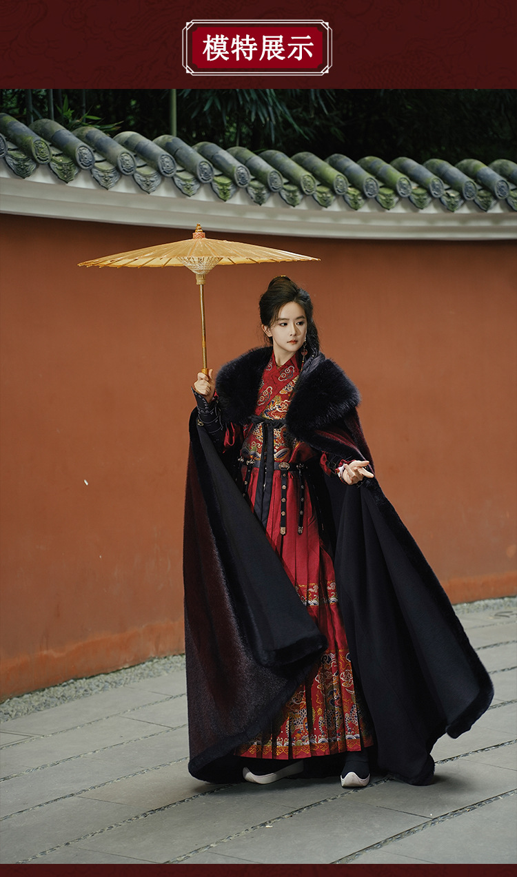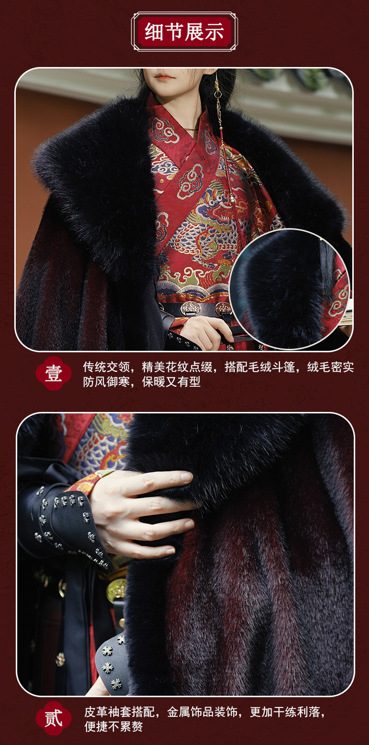 原创汉服织金飞鱼服2026新款红色斗篷加绒加厚大毛领保暖长款披肩