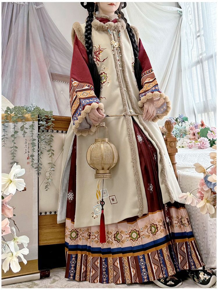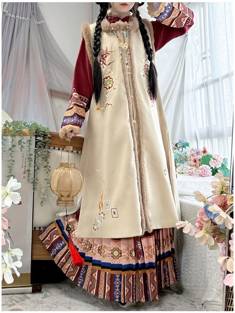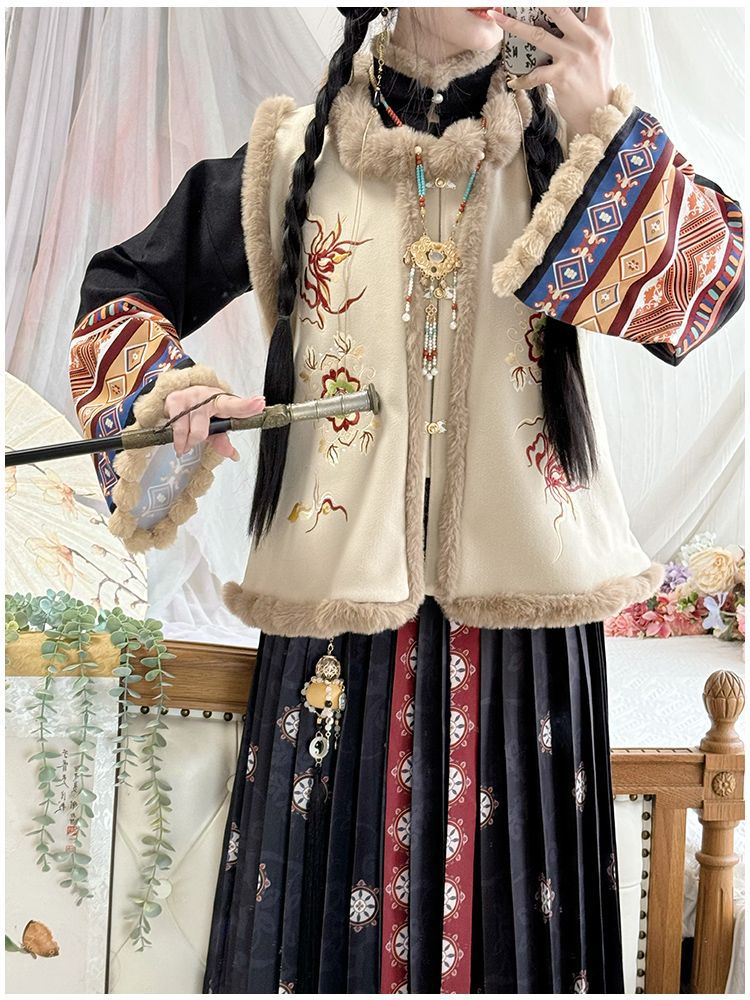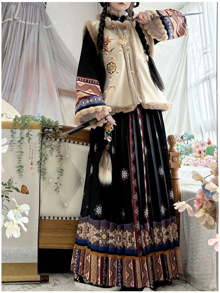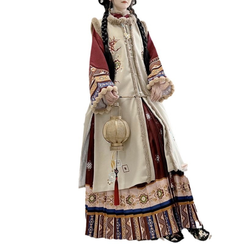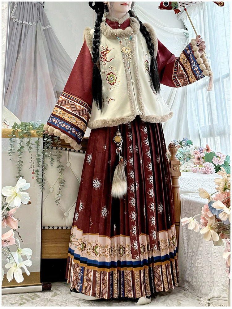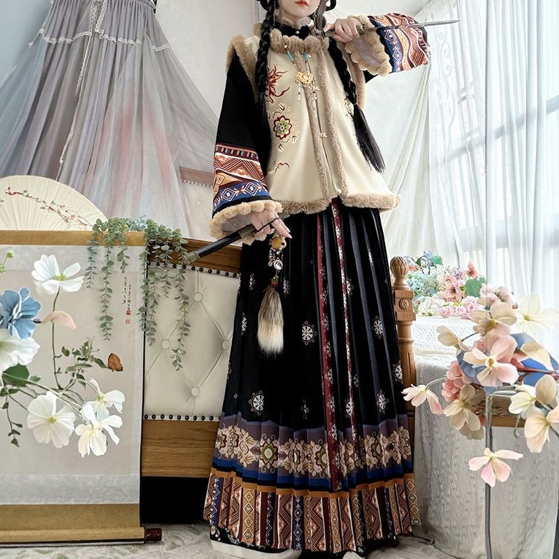 原创汉服女2025新款秋冬季中国风加绒保暖比甲百褶裙新年战袍套装