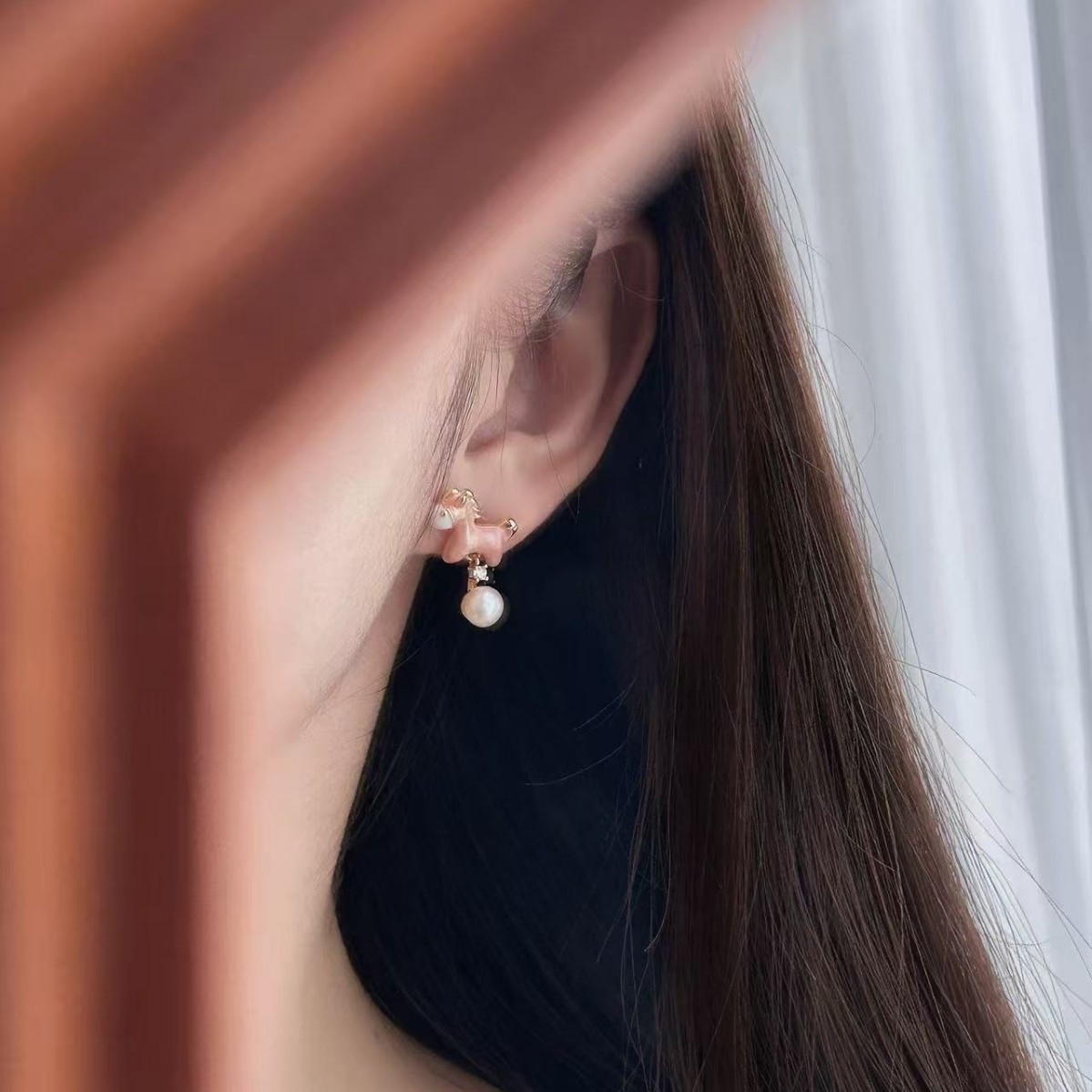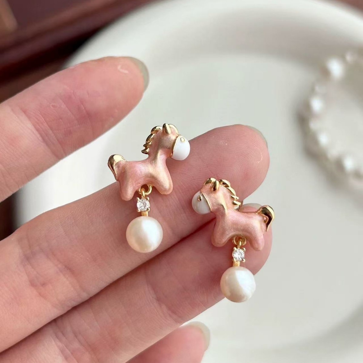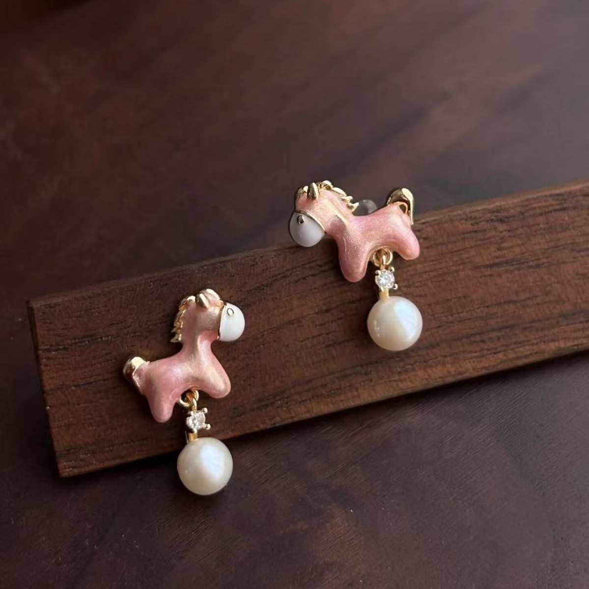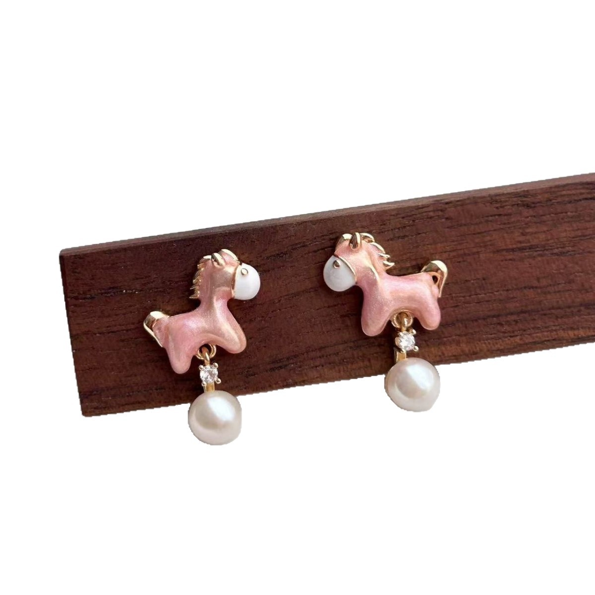 梦幻粉色滴油可爱小马珍珠耳环女时尚本命年耳环绝美轻奢气质耳饰