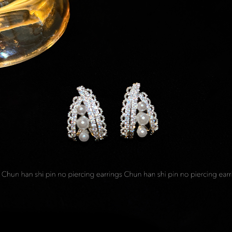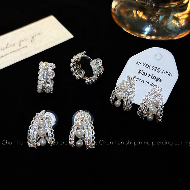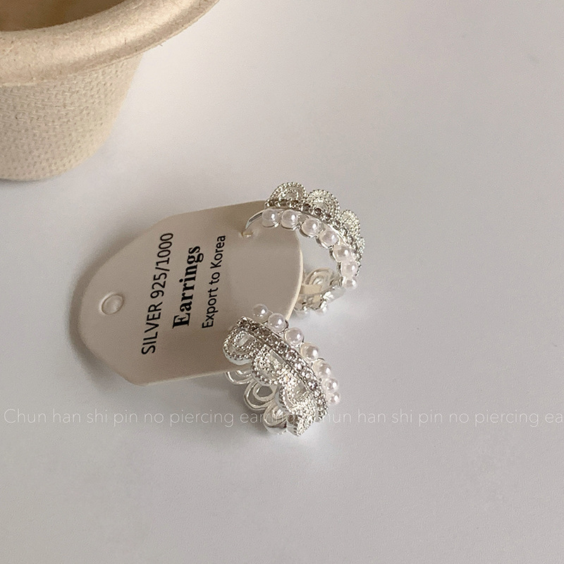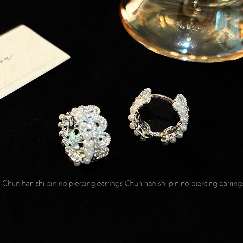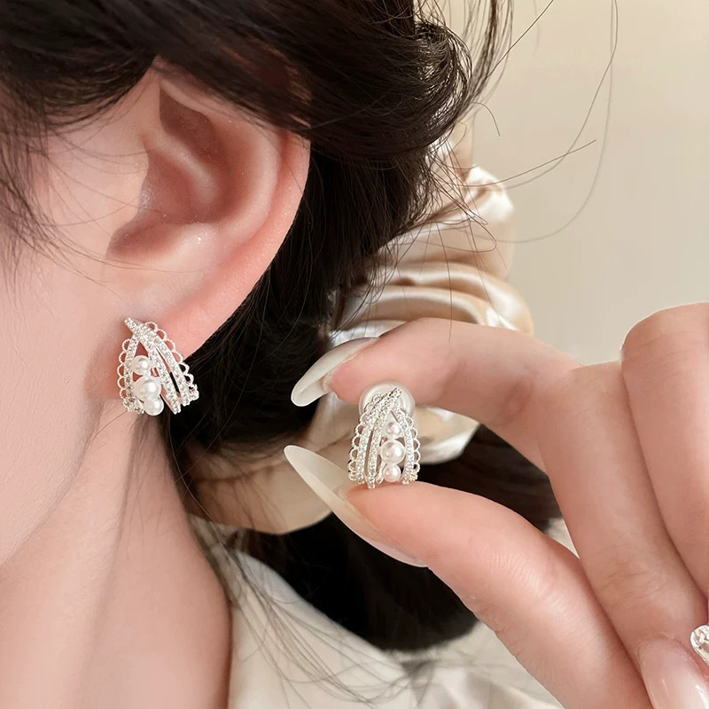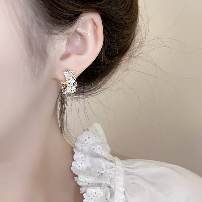 蕾丝花边珍珠耳环耳夹轻奢高级时尚百搭耳扣简约气质时尚银色耳饰