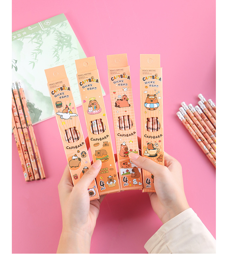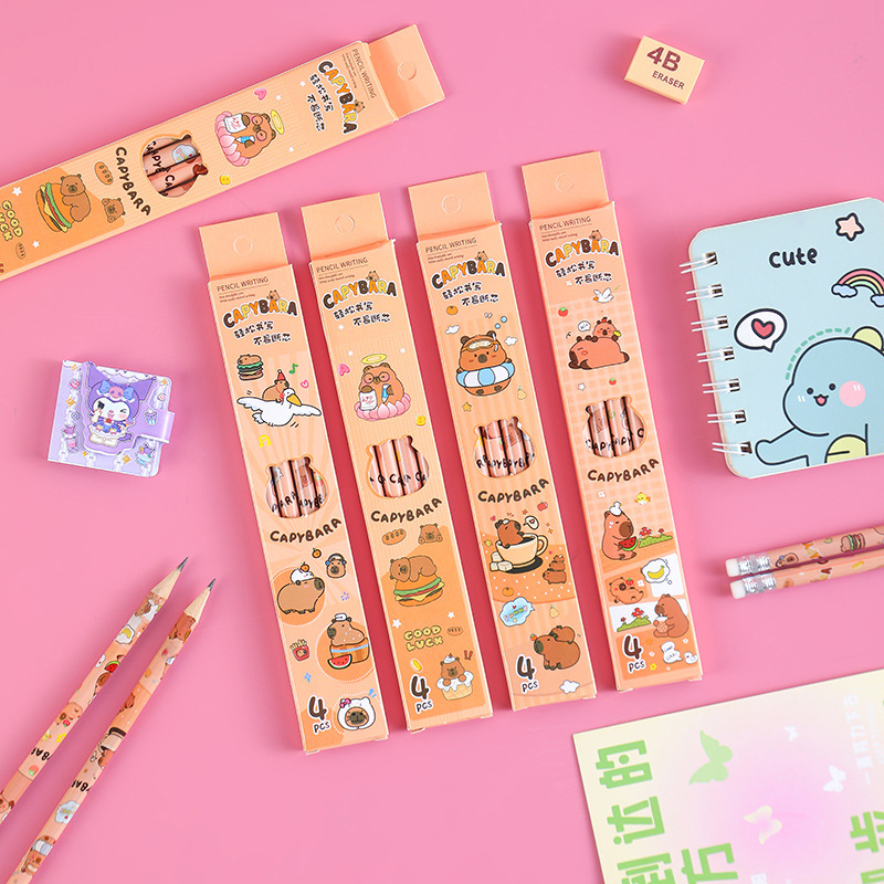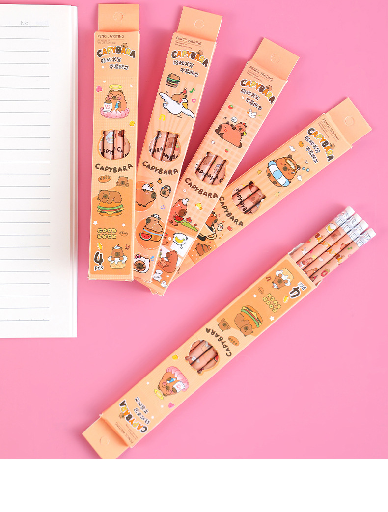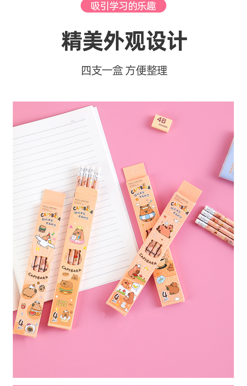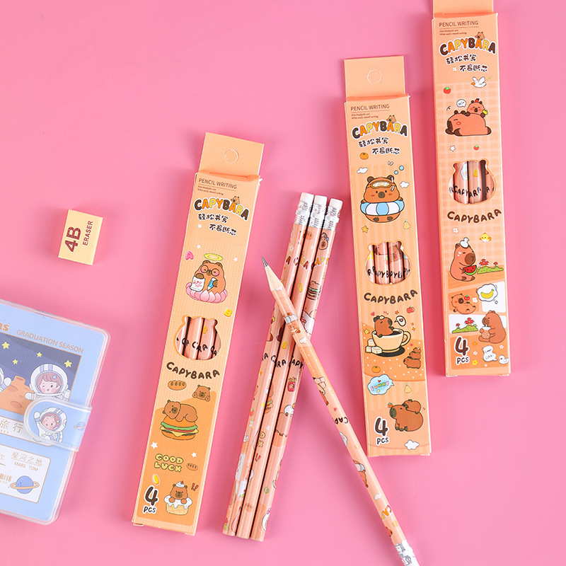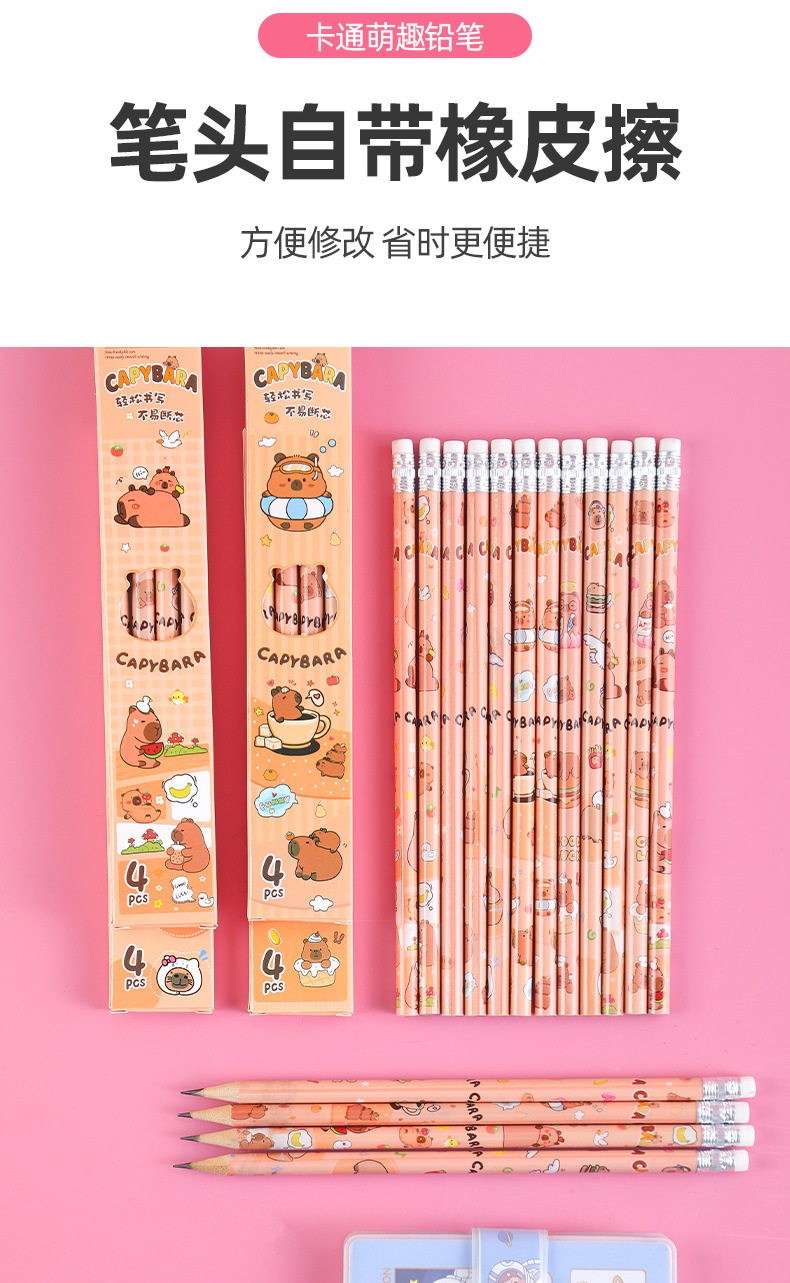 卡皮巴拉盒装铅笔小学生书写文具素描笔儿童绘画带橡皮铅笔4支装