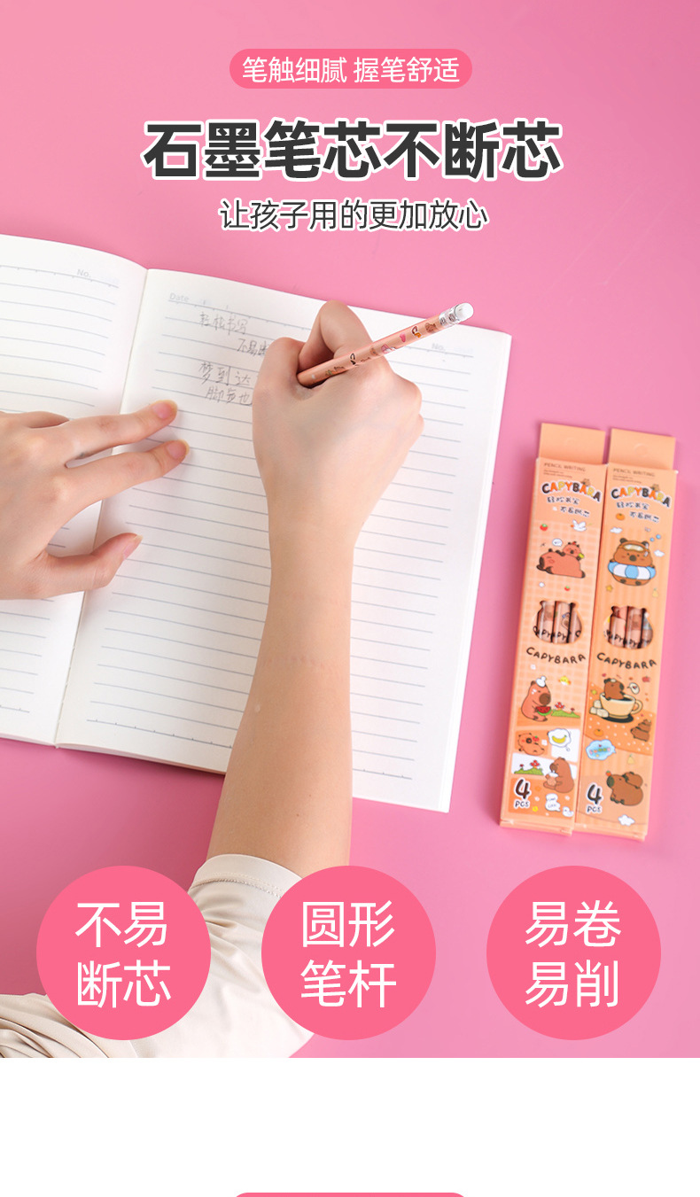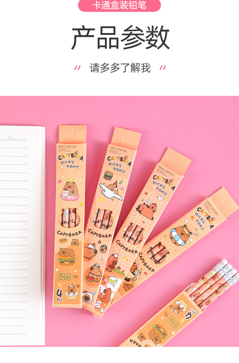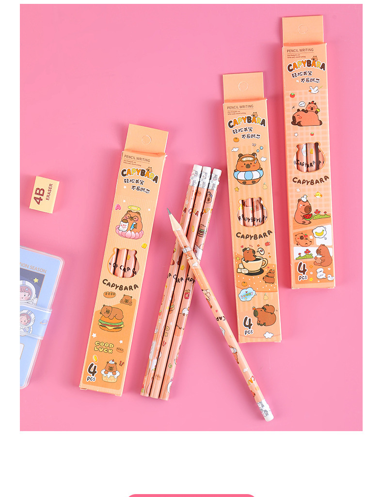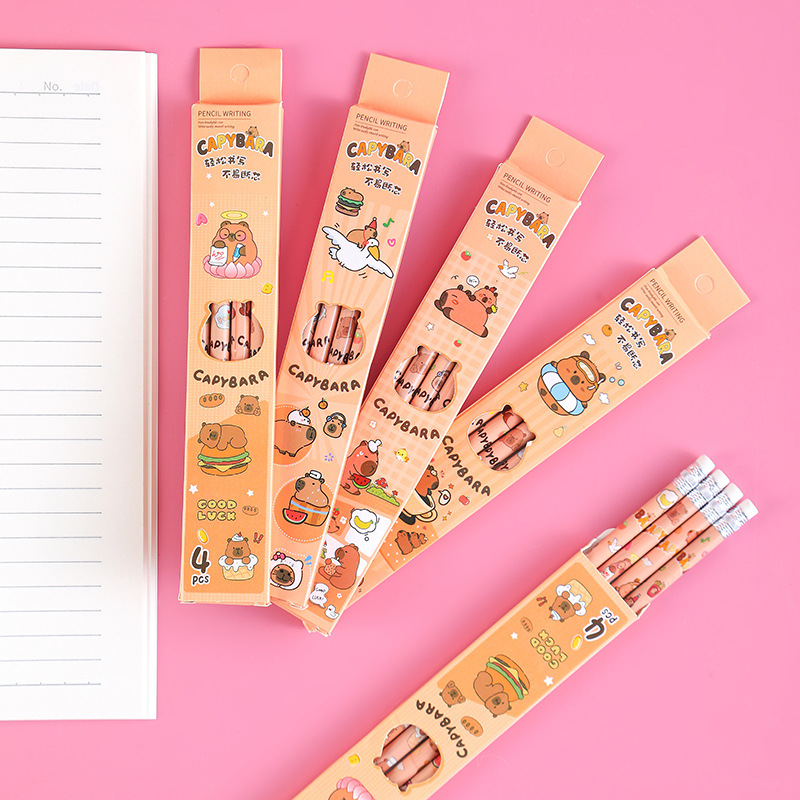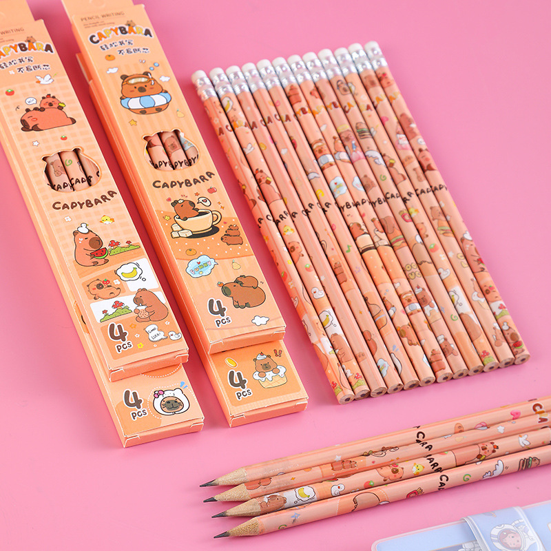 卡皮巴拉盒装铅笔小学生书写文具素描笔儿童绘画带橡皮铅笔4支装