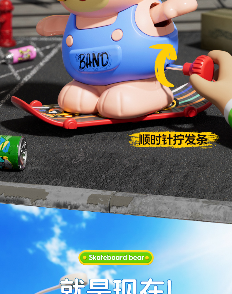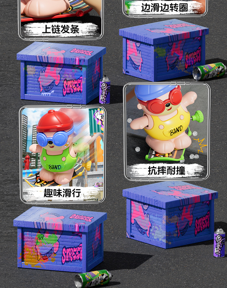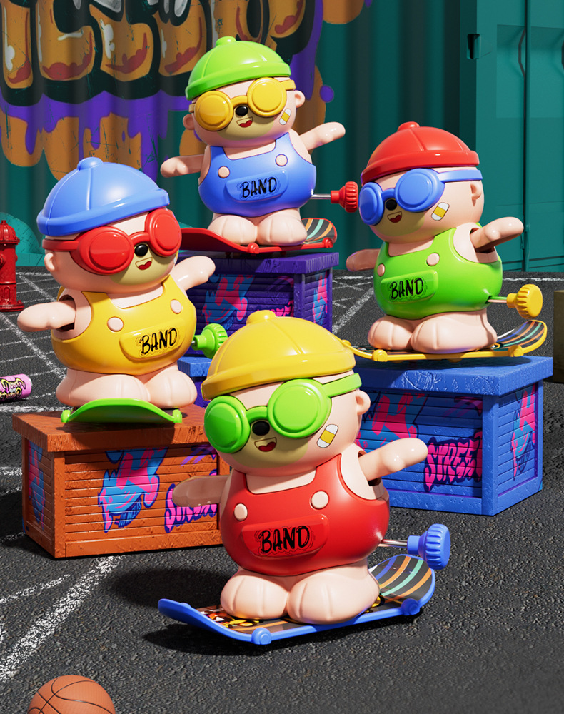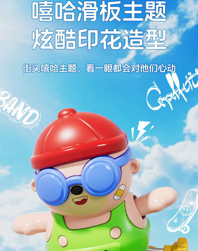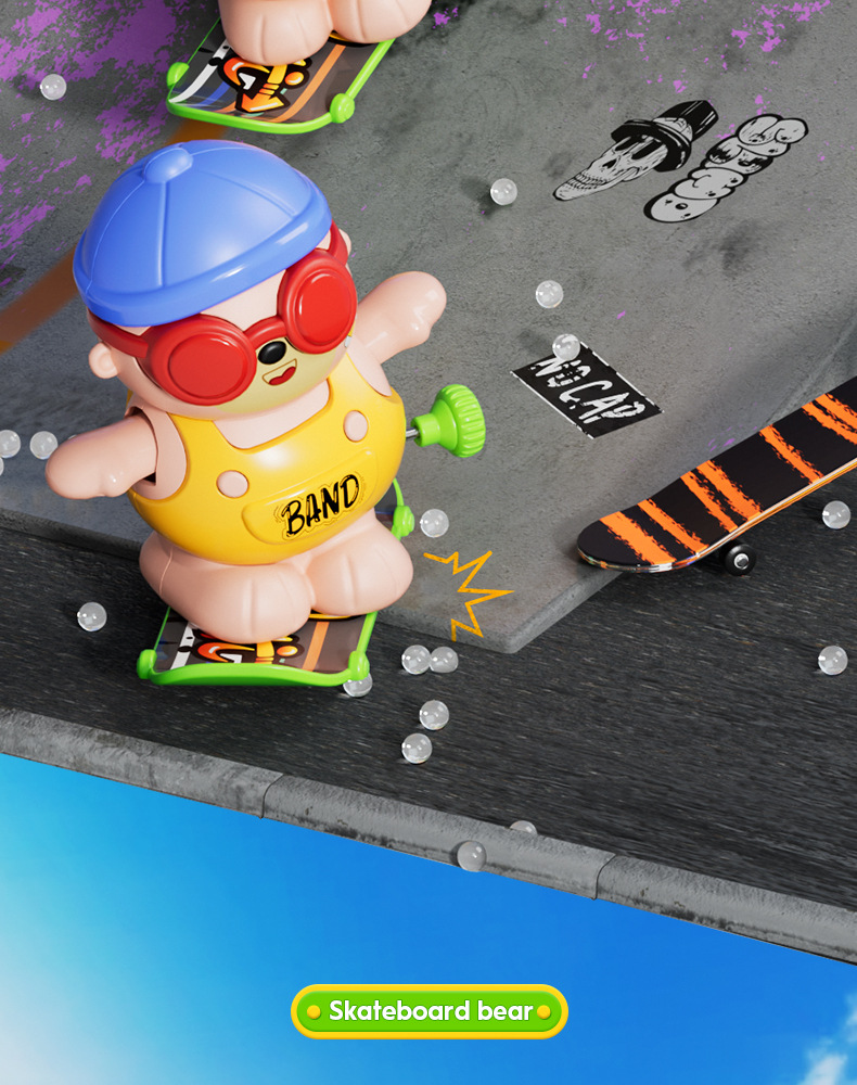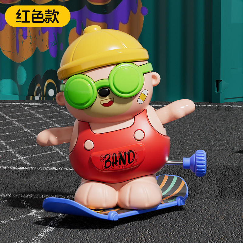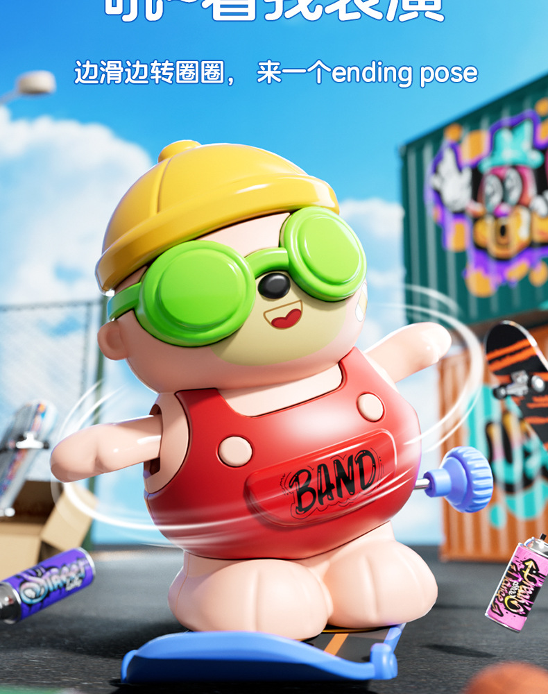 批发儿童发条上链旋转滑板嘻哈小熊玩具上弦卡通萌趣动物玩具益智