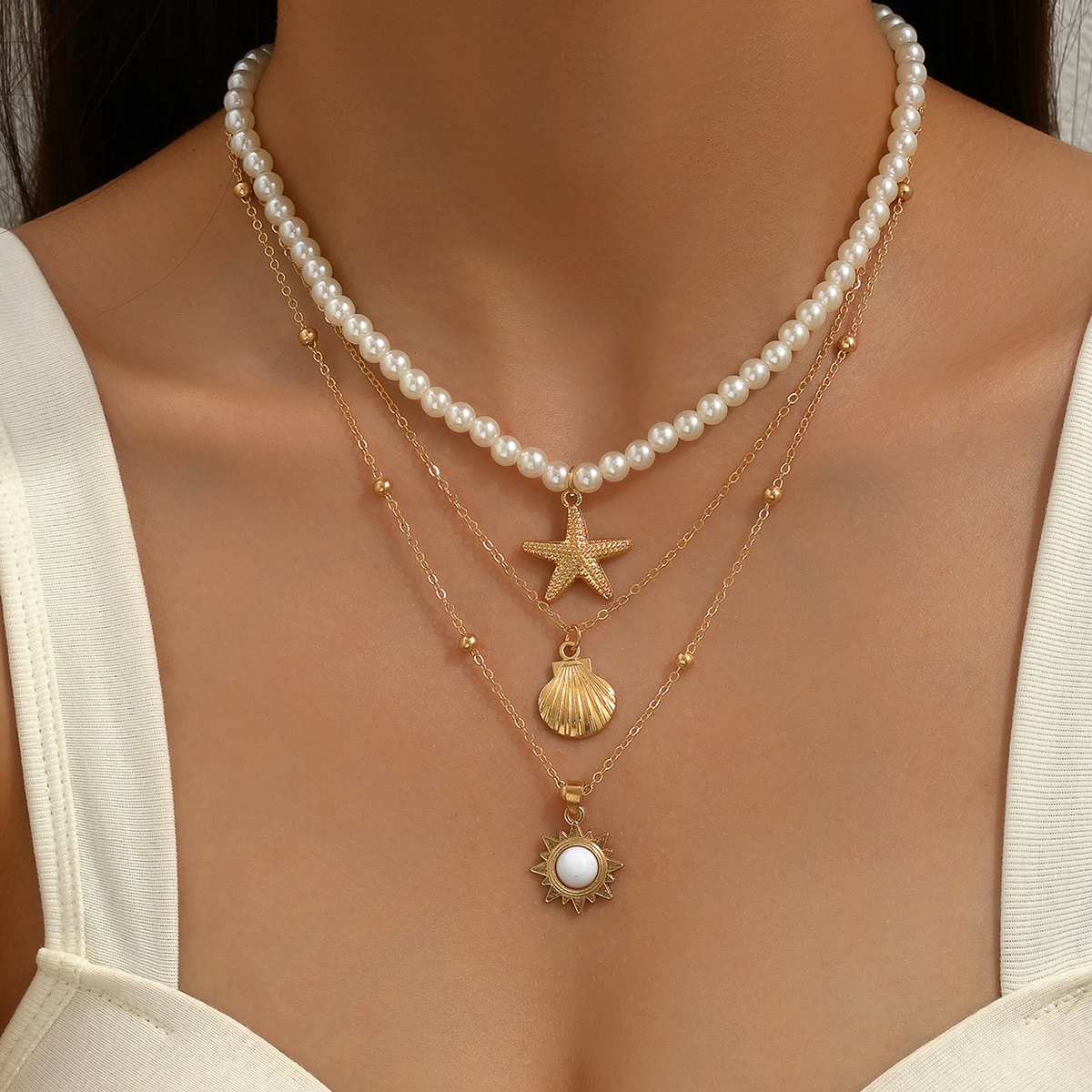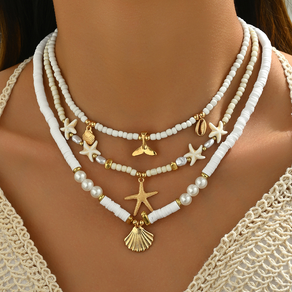 跨境欧美个性软陶项链时尚椰树海星百花吊坠长款项链叠戴式锁骨链