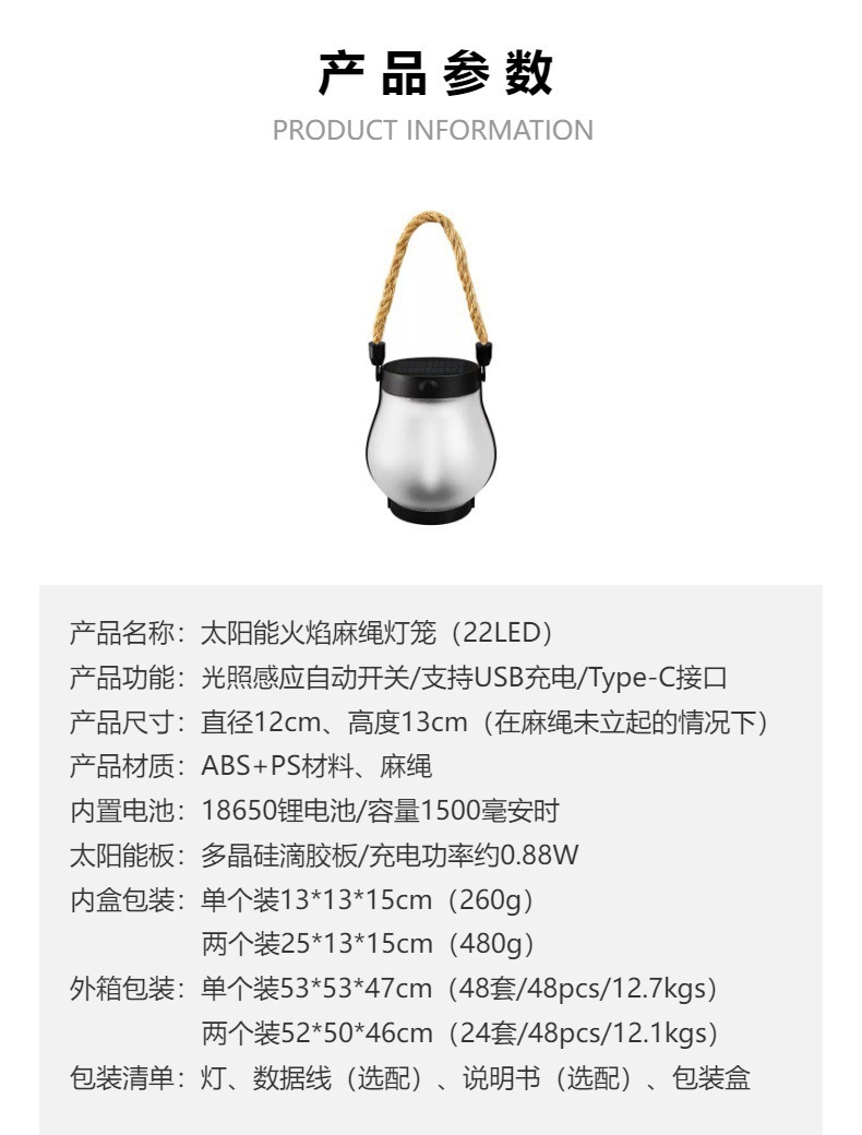 跨境太阳能火焰灯麻绳灯笼庭院花园装饰梅森灯太阳能usb庭院灯