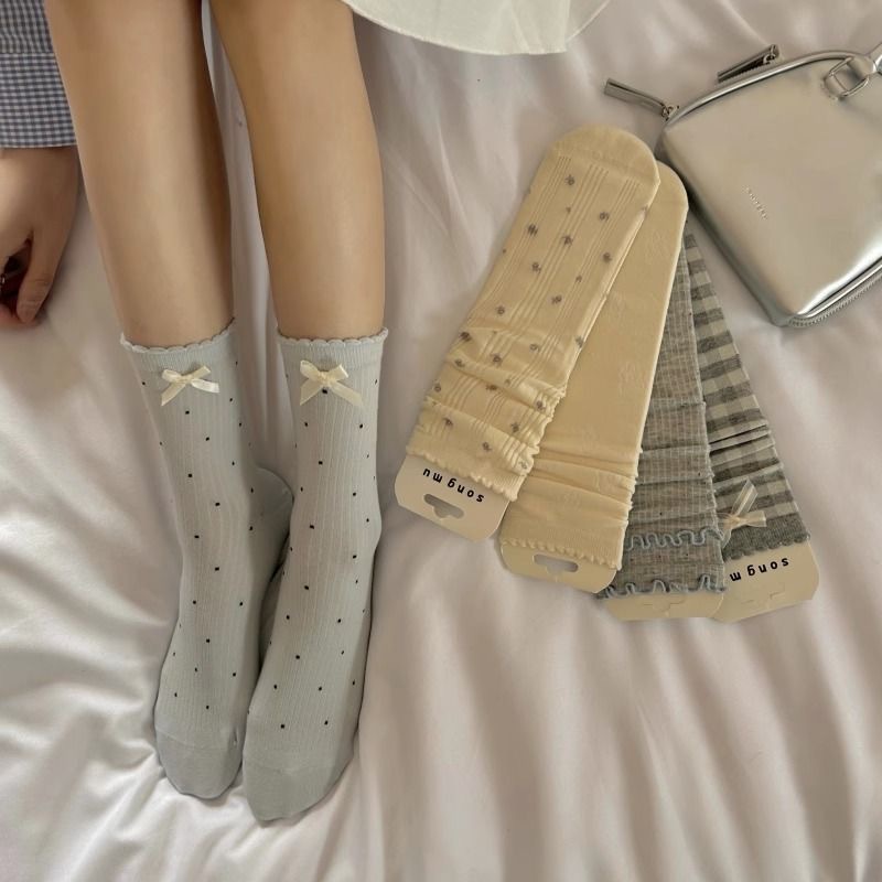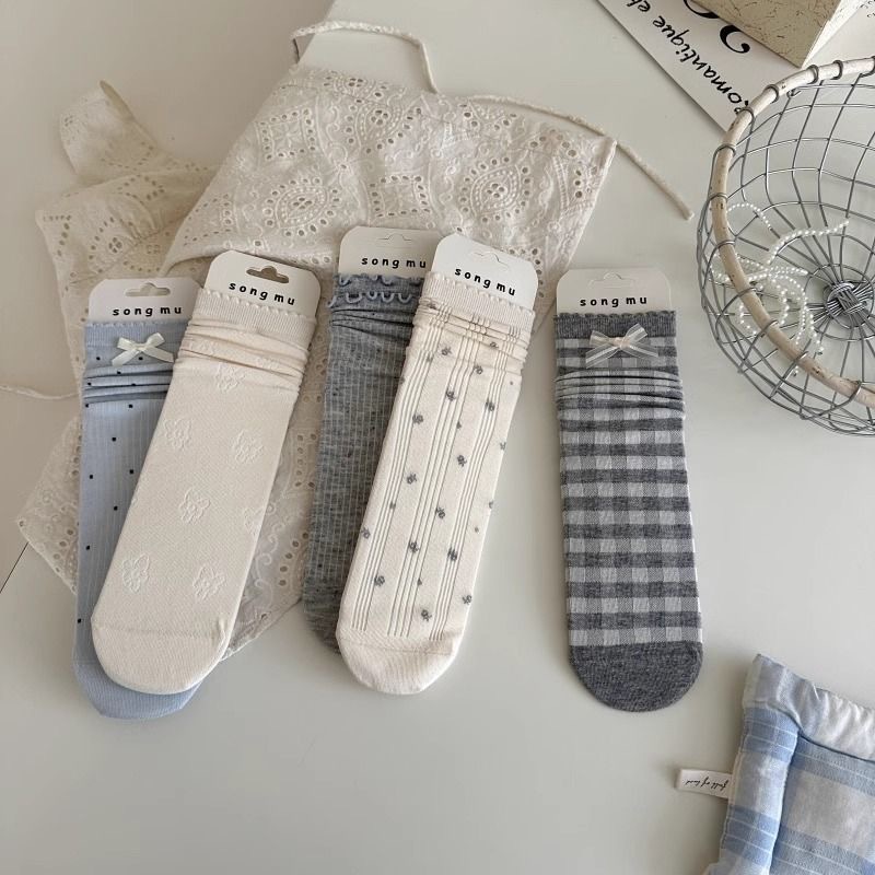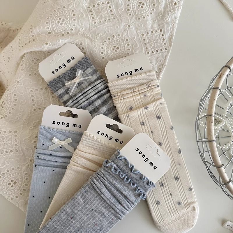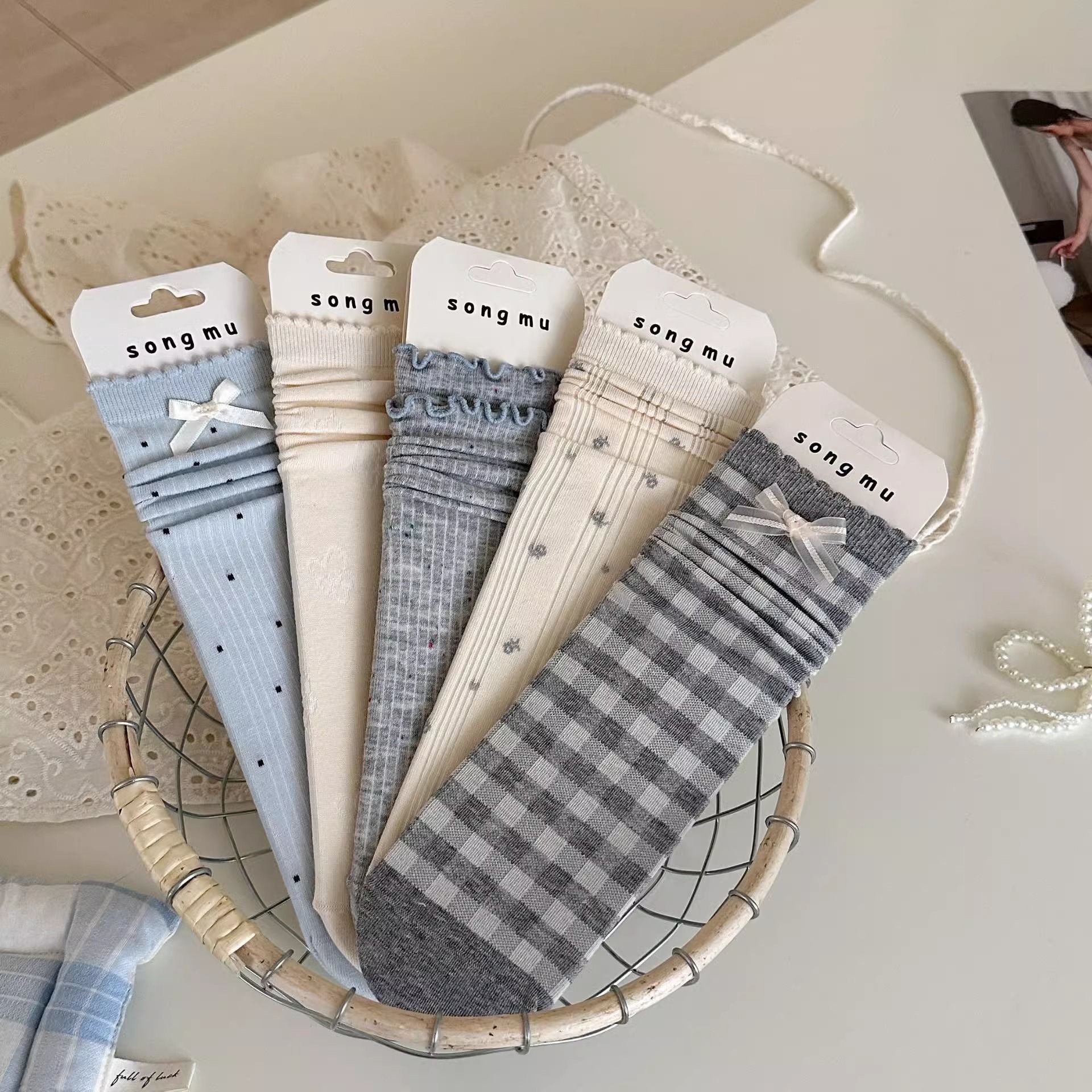 夏季薄款灰蓝色系透气学院可爱日系蝴蝶结袜子中筒ins花边堆堆袜