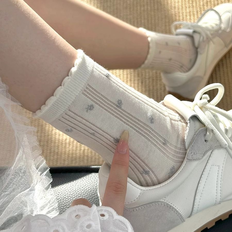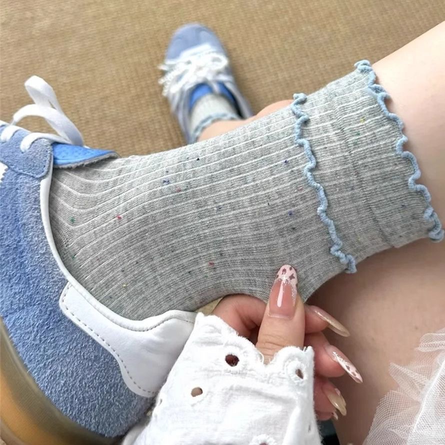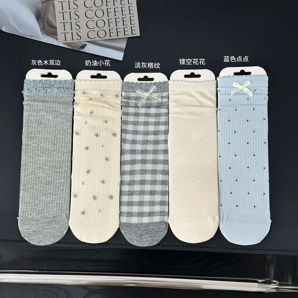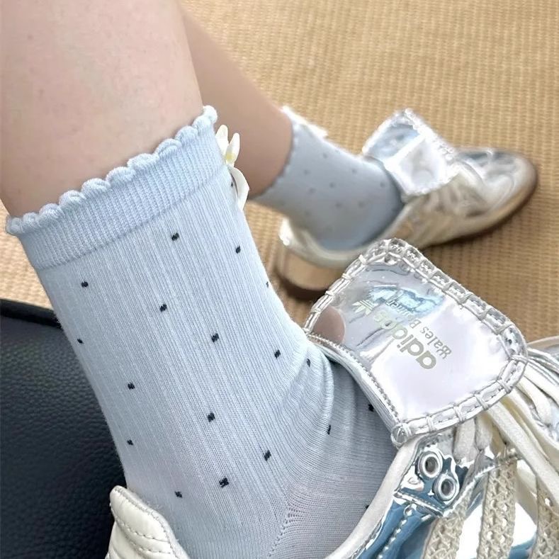夏季薄款灰蓝色系透气学院可爱日系蝴蝶结袜子中筒ins花边堆堆袜