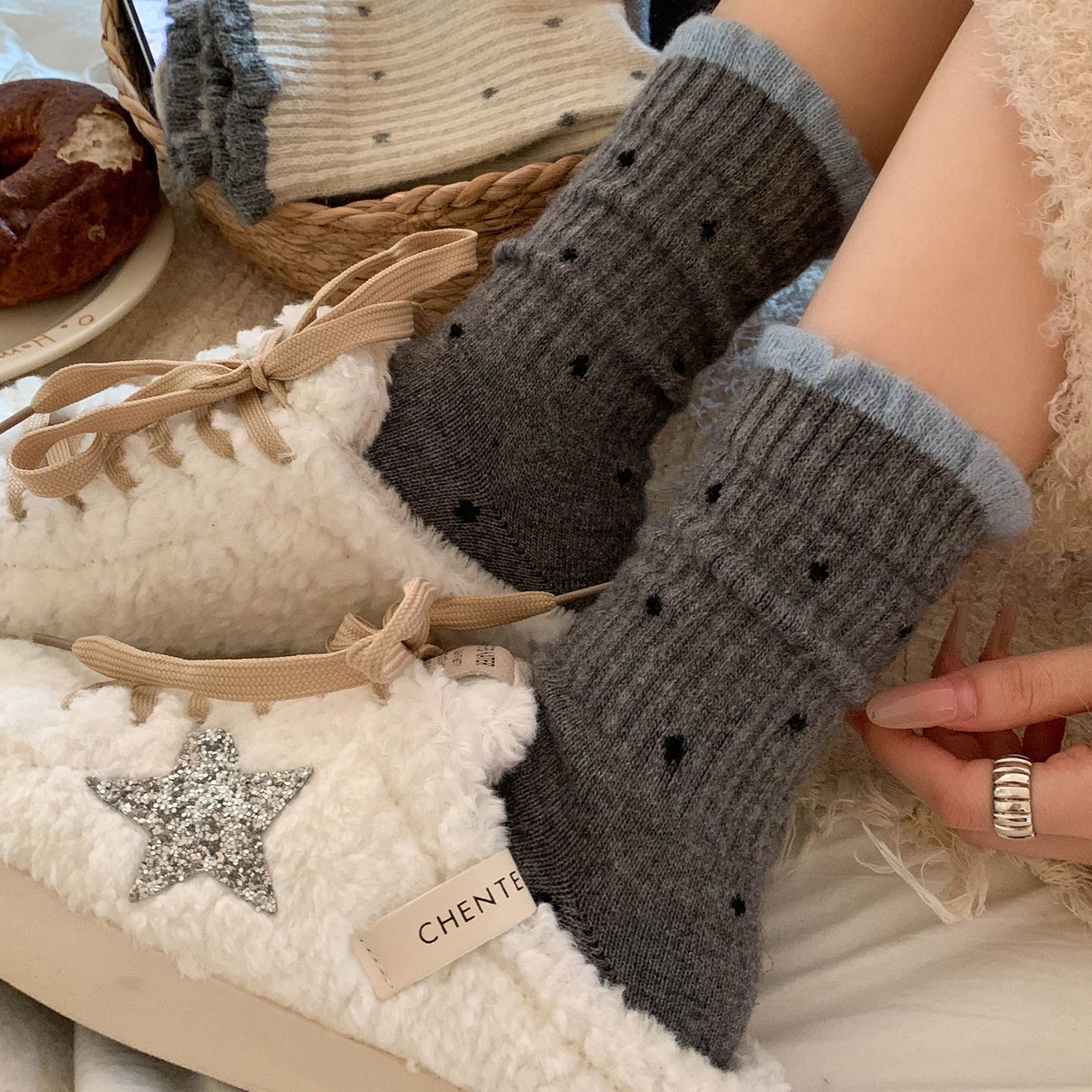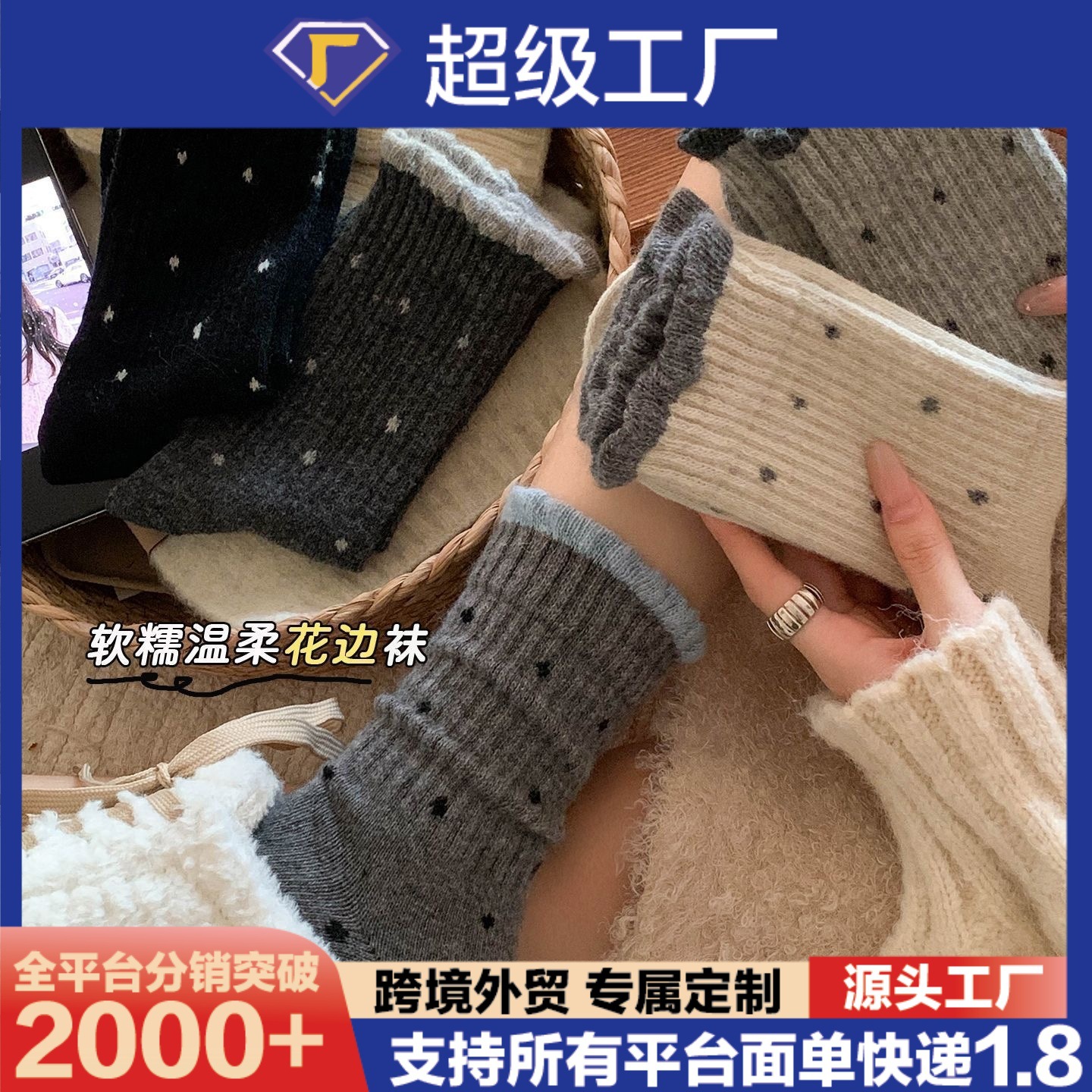 秋冬季百搭波点中筒袜子女温柔花边外穿百搭长筒袜复古多巴胺宽口