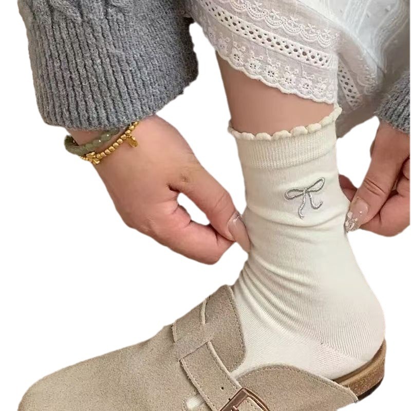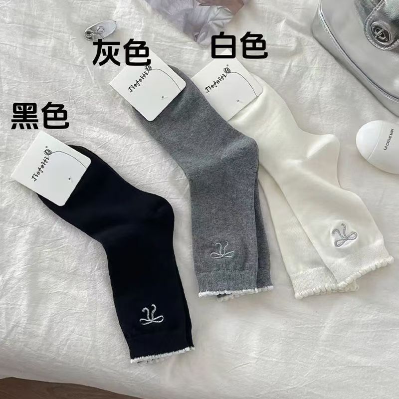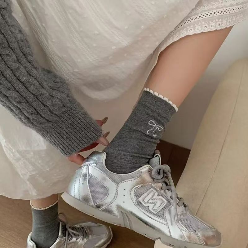 芭蕾风蝴蝶结花边袜子女日系简约百搭学院风黑白灰纯色泡泡口花边
