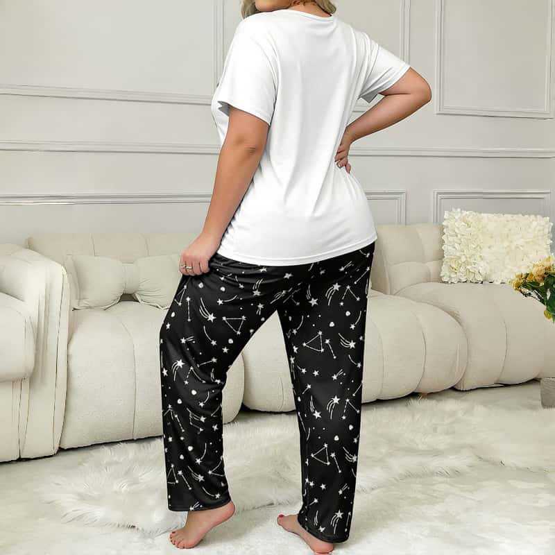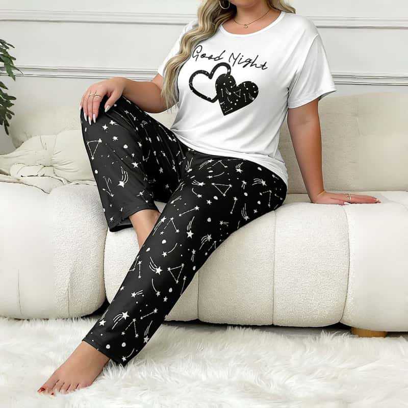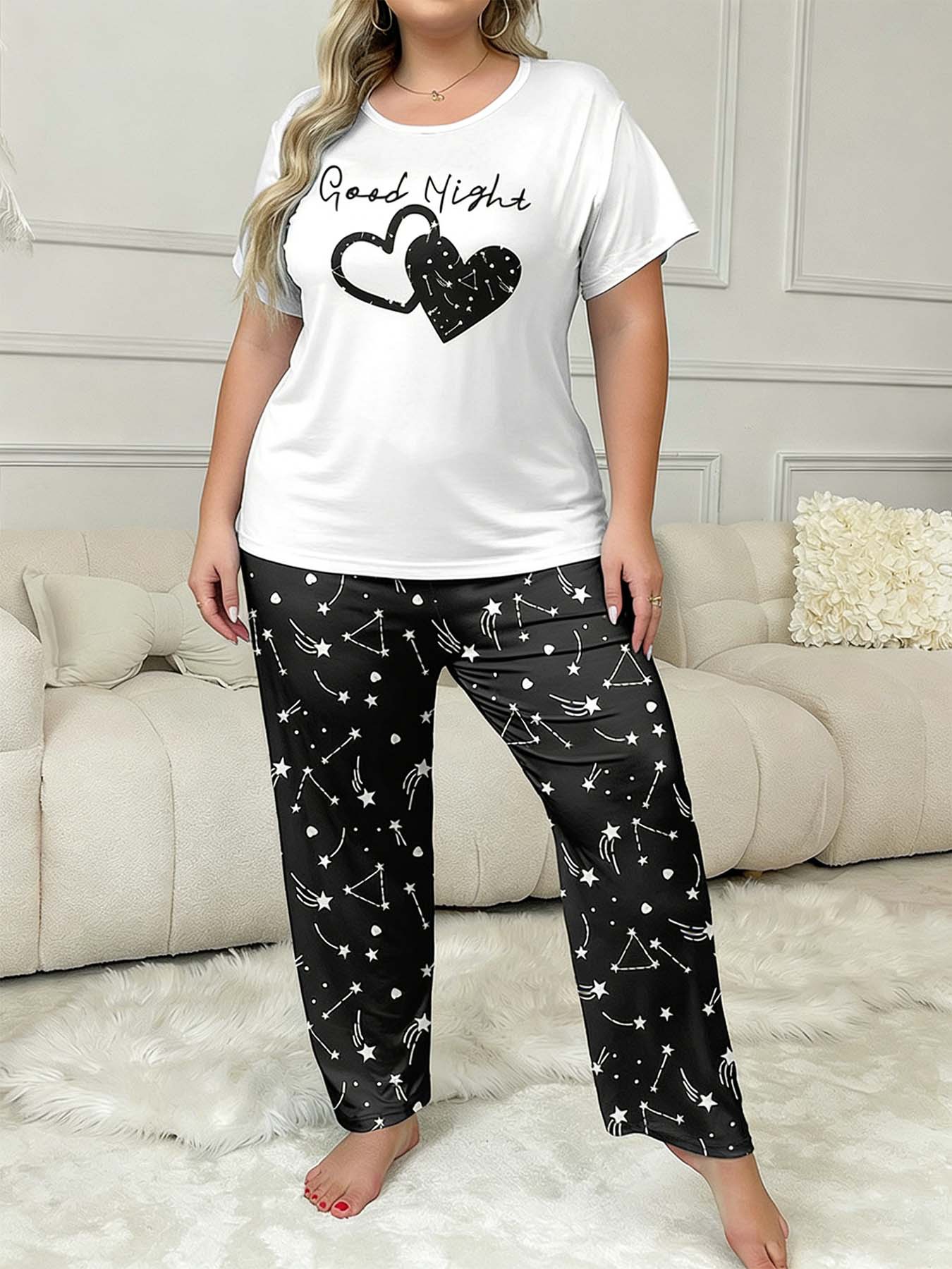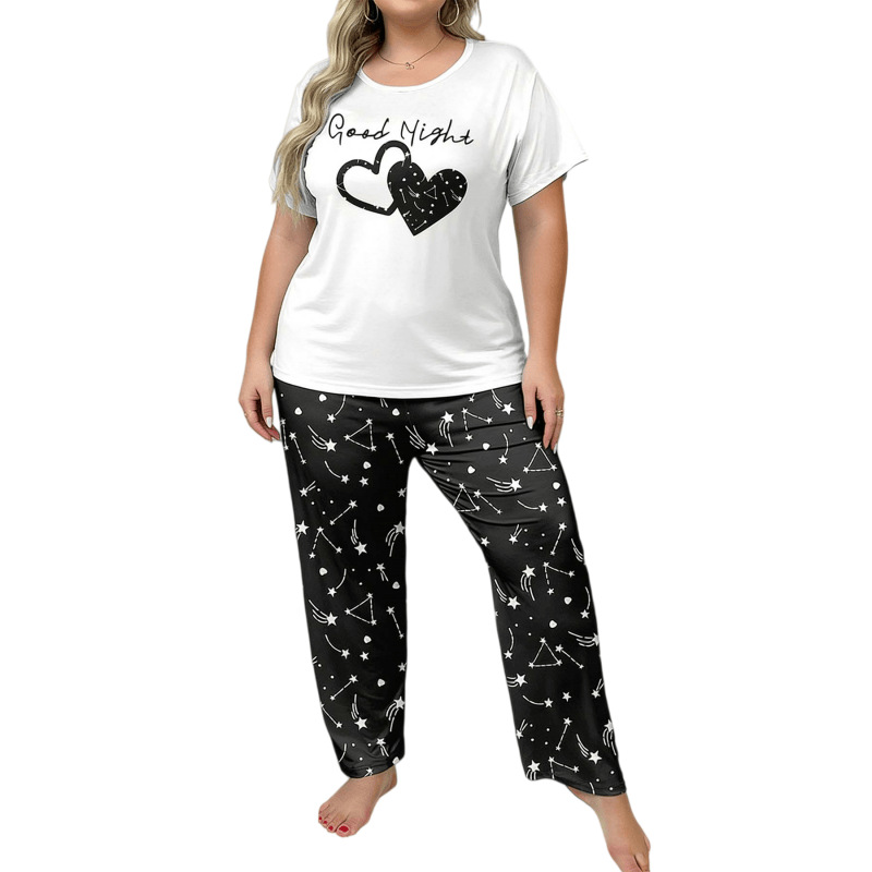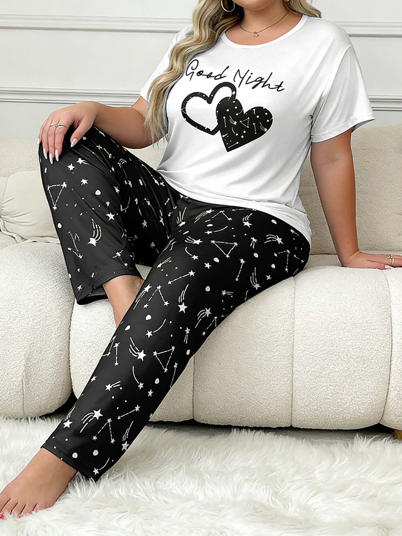 欧美风休闲大码家居服加大加肥星空爱心圆领短袖长裤女式睡衣套装