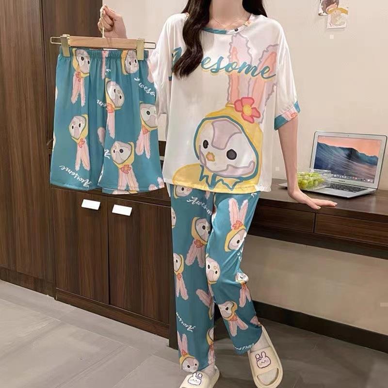 三件套睡衣女春秋季短袖长裤短裤学生大码可爱卡通套装夏天家居服