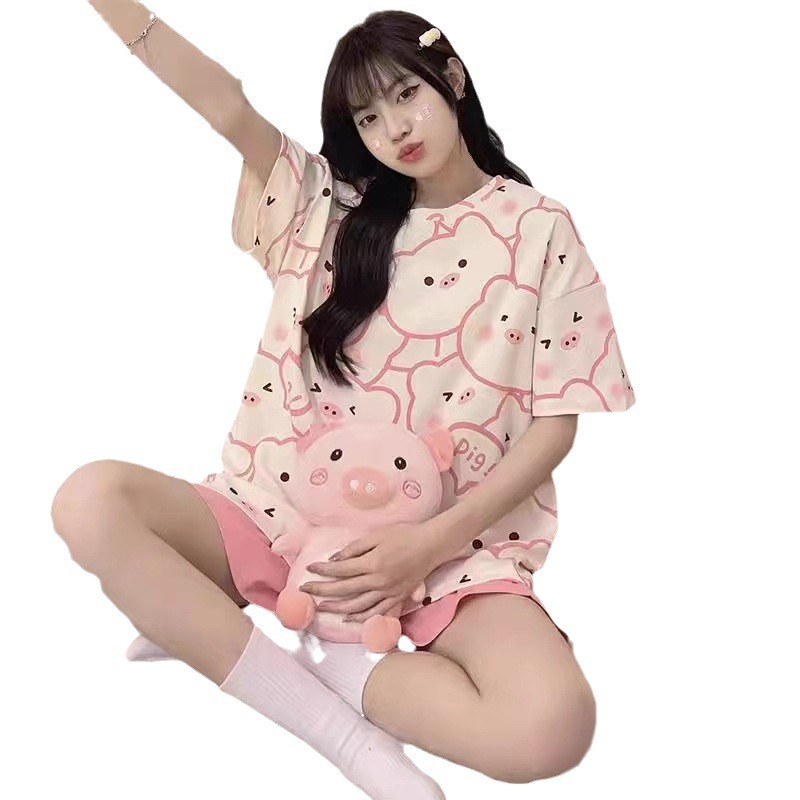 小猪印花睡衣女夏季短袖薄款圆领套装可爱卡通学生少女韩版家居服